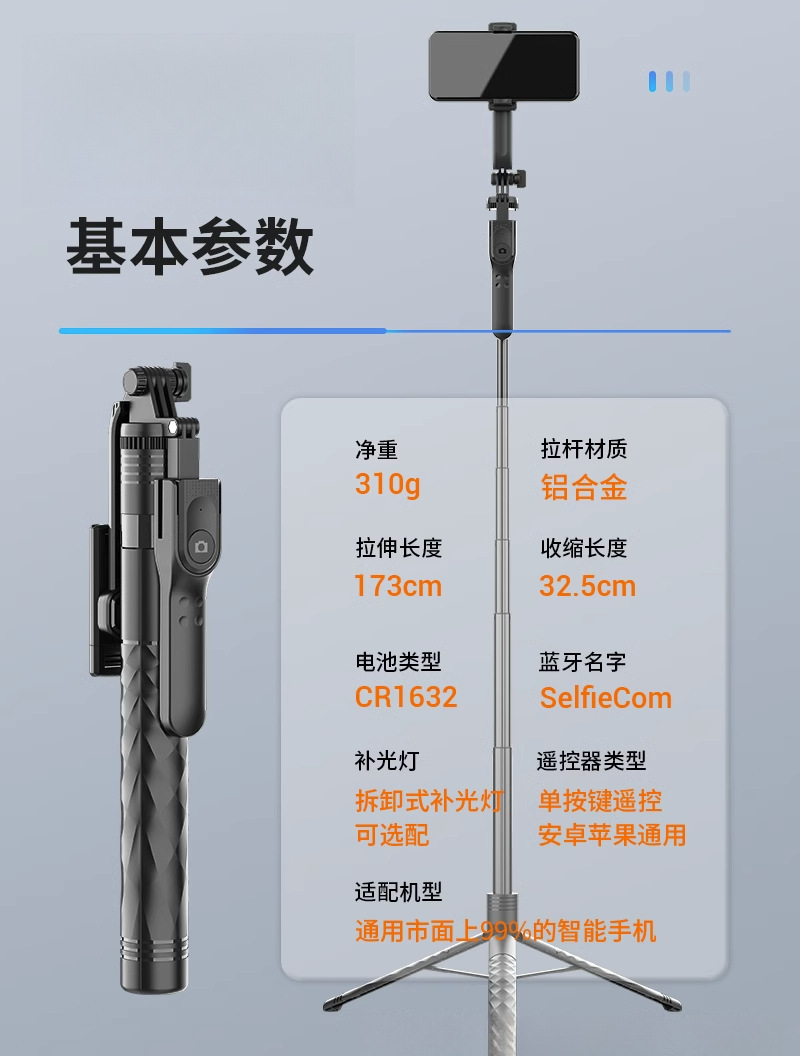 • 1.7m - 스테인레스 스틸 [4축 손떨림 방지 모델]에는 범용 Douyin 리모콘이 함께 제공됩니다.