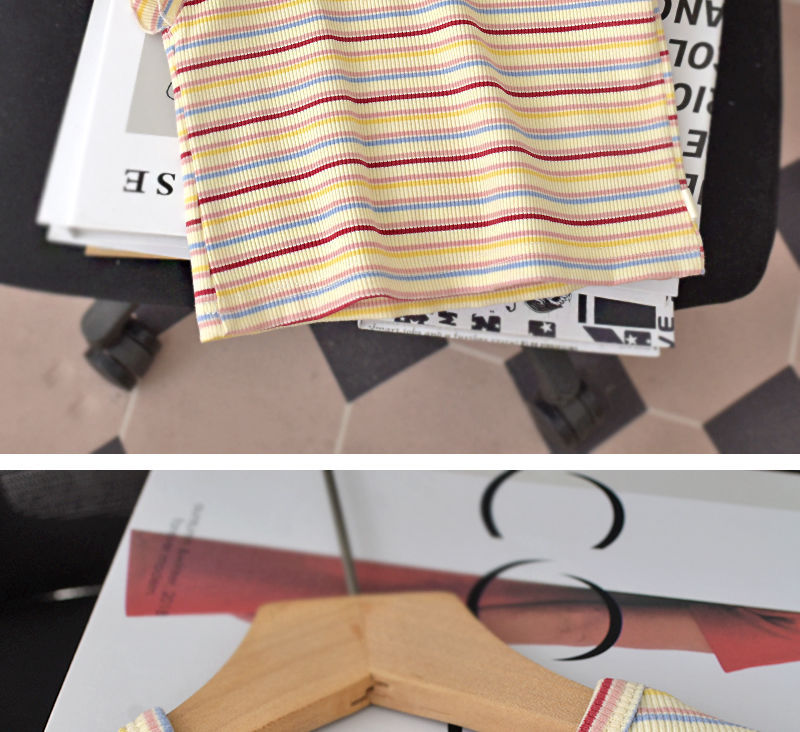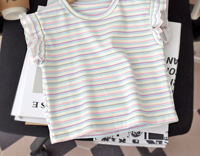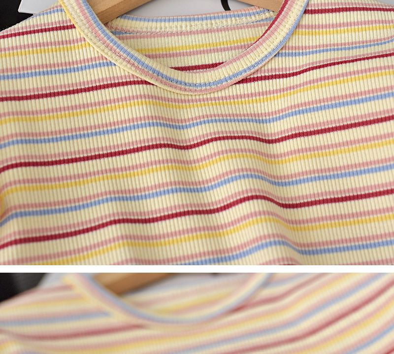 2025 여자 반팔 티셔츠 여름 얼음 실크 얇은 스타일 베이비 탑 한국 스타일 스트라이프 라운드 넥 바닥 셔츠 유행스토어 가기