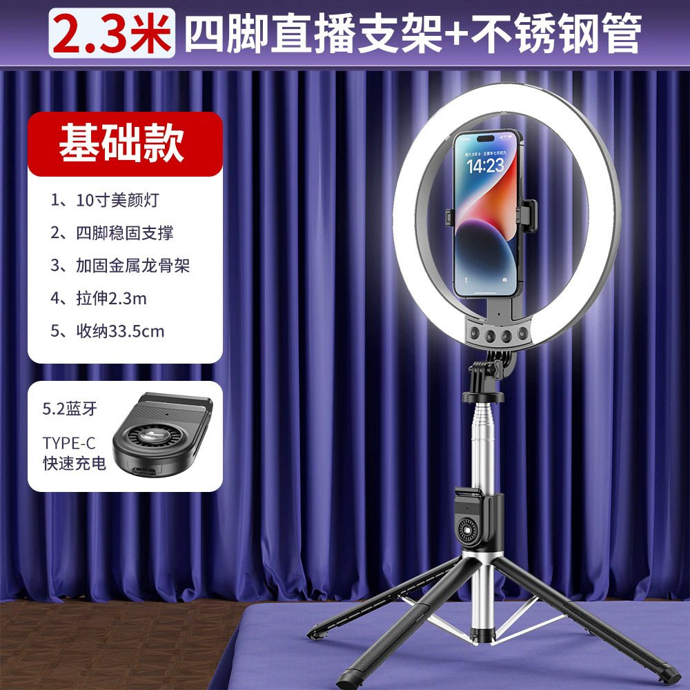热销美颜自拍杆带补光灯手机落地三角支架超长2.3米 P225Q