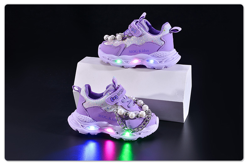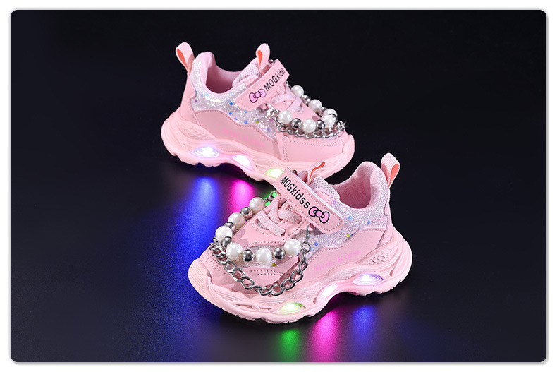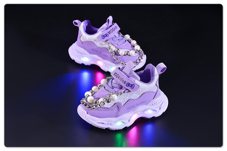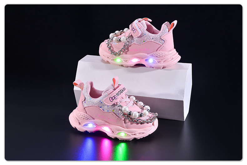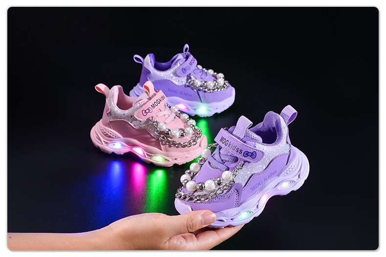 2025 봄과 가을 새로운 스타일 소녀 라이트 업 진주 체인 공주 어린이 부드러운 바닥 캐주얼 LED 라이트 업 스포츠 신발