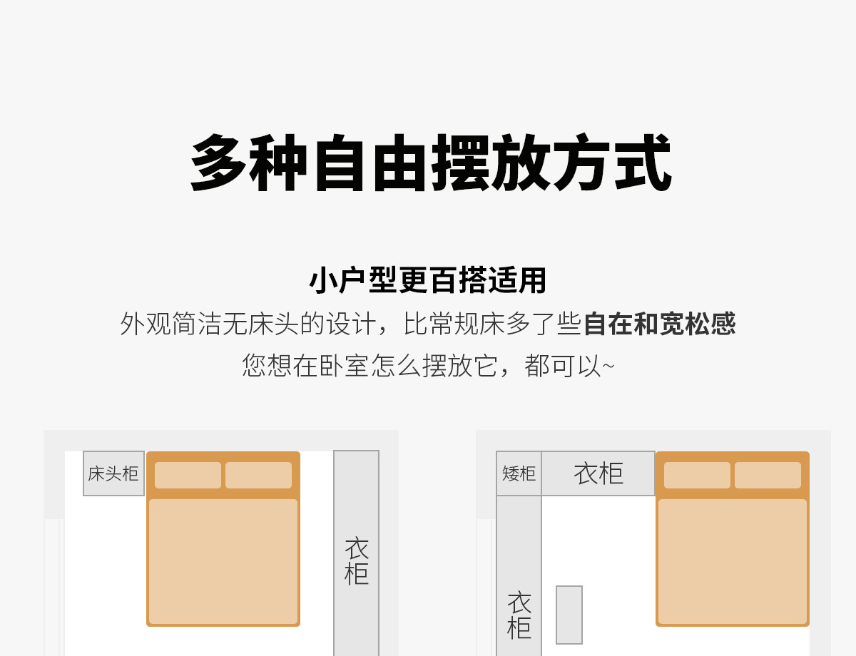 • 탄소강 침대 프레임(라이트 스트립 포함) + 금속 다리 + 보이지 않는 사이드 테이블*1
