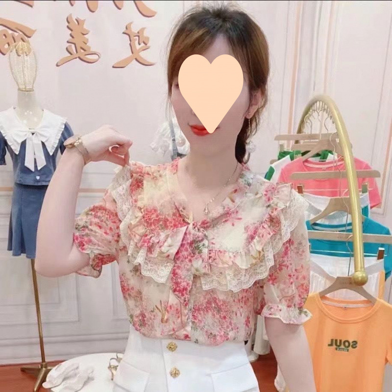 여성을위한 꽃 무늬 쉬폰 셔츠 2025 여름 새로운 스타일 달콤한 프랑스 디자인 칼라 타이 보우 탑 트렌디스토어 가기