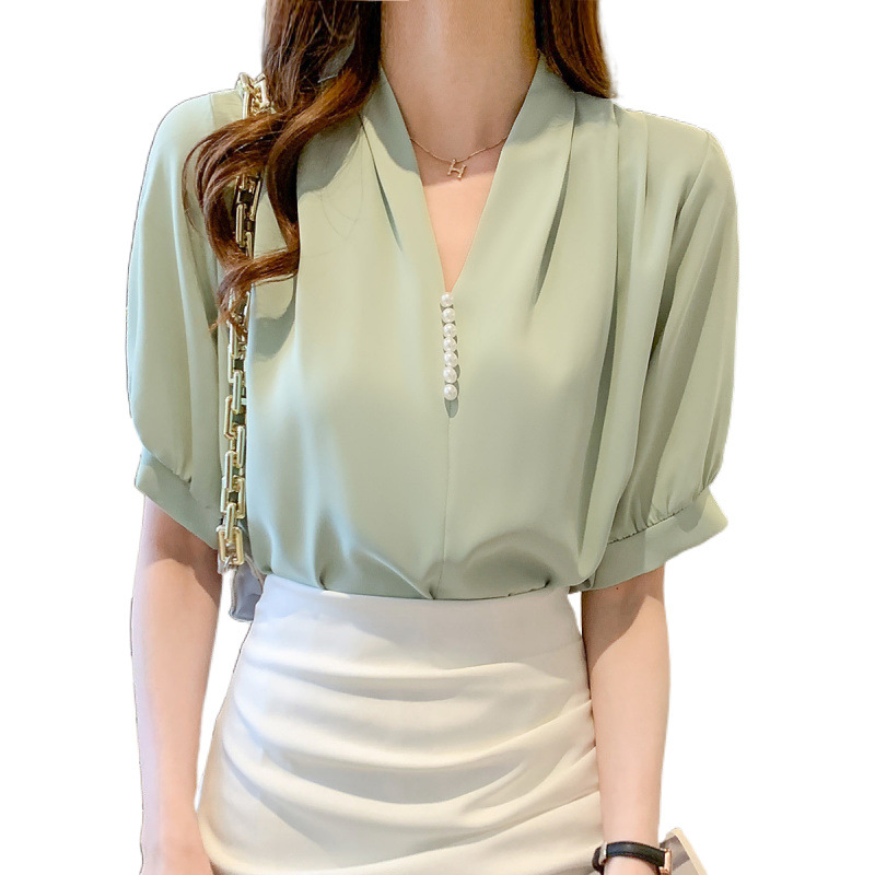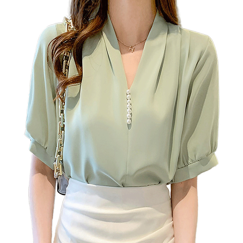 여성용 반팔 쉬폰 셔츠 여성 여름 의류 2025 새로운 탑 디자인 틈새 여름 얇은 셔츠스토어 가기
