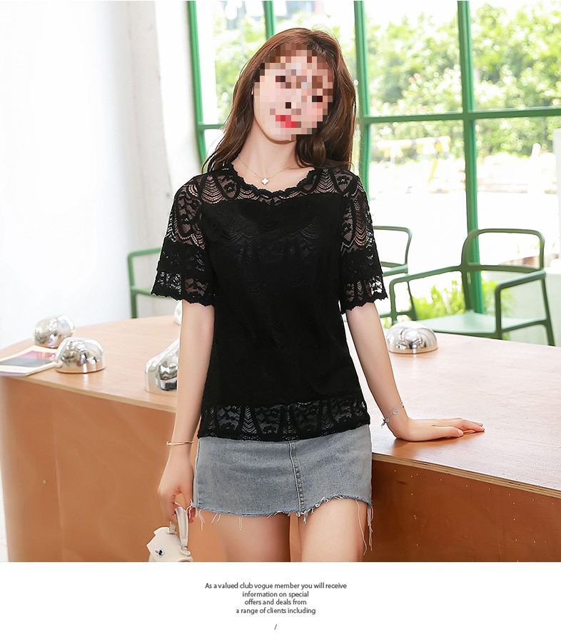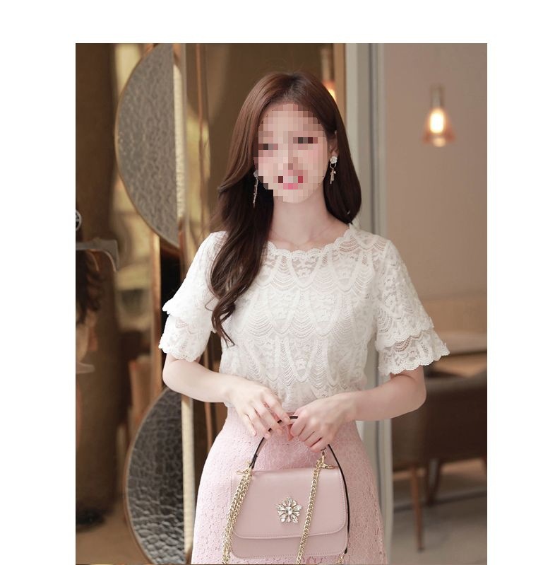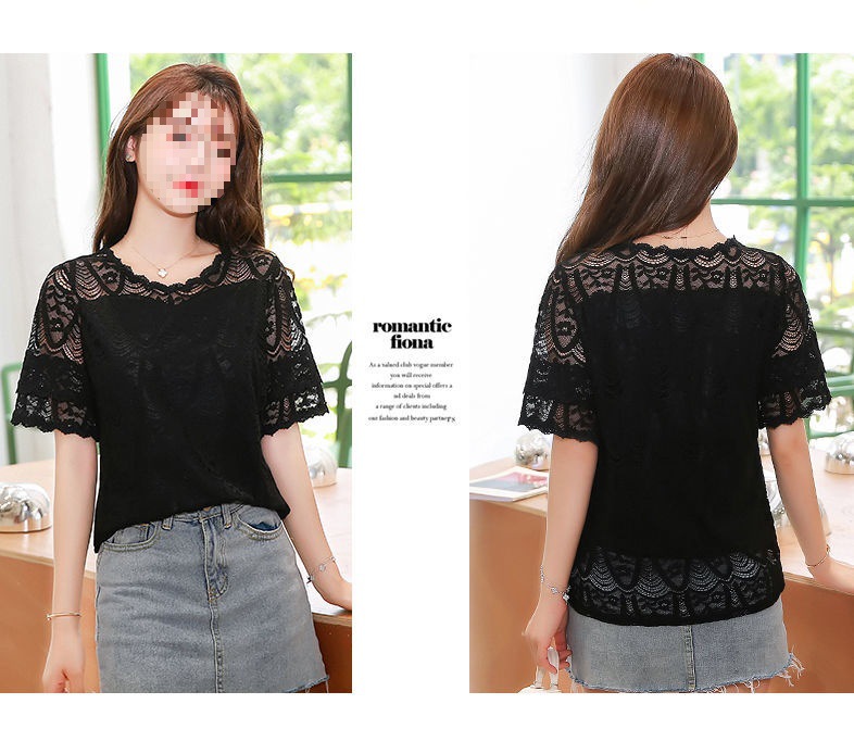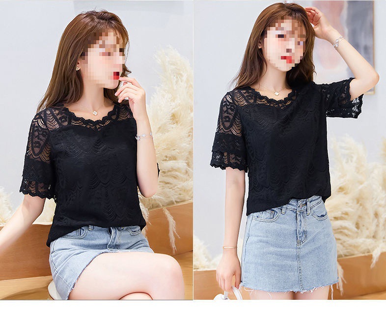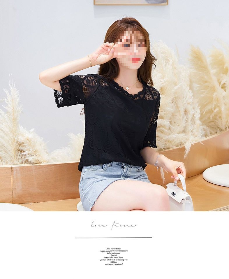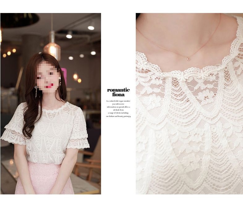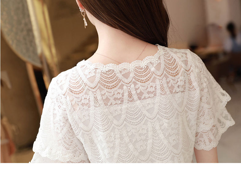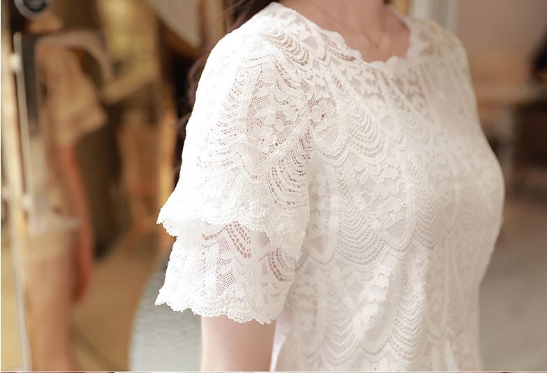 여름 여성을 위한 수용성 레이스 탑, 새로운 한국식 흰색 기질 중공 라운드 넥 반팔 쉬폰 바닥 셔츠