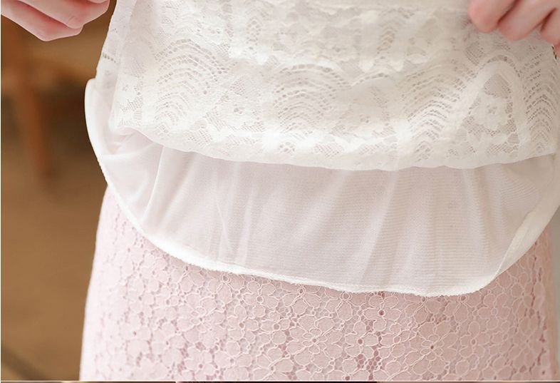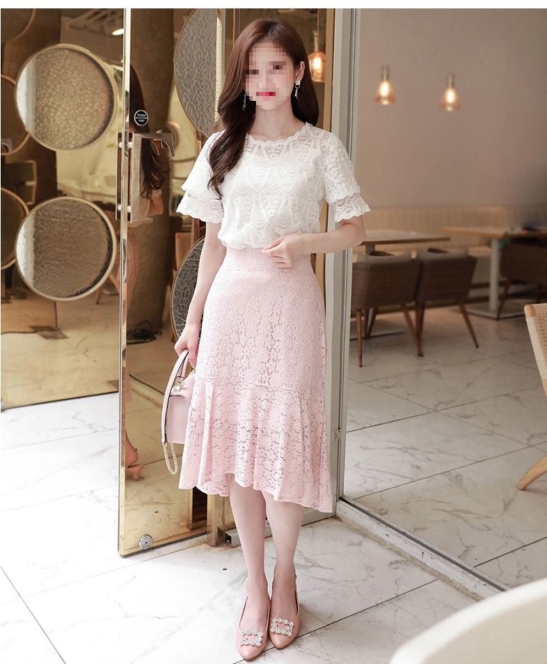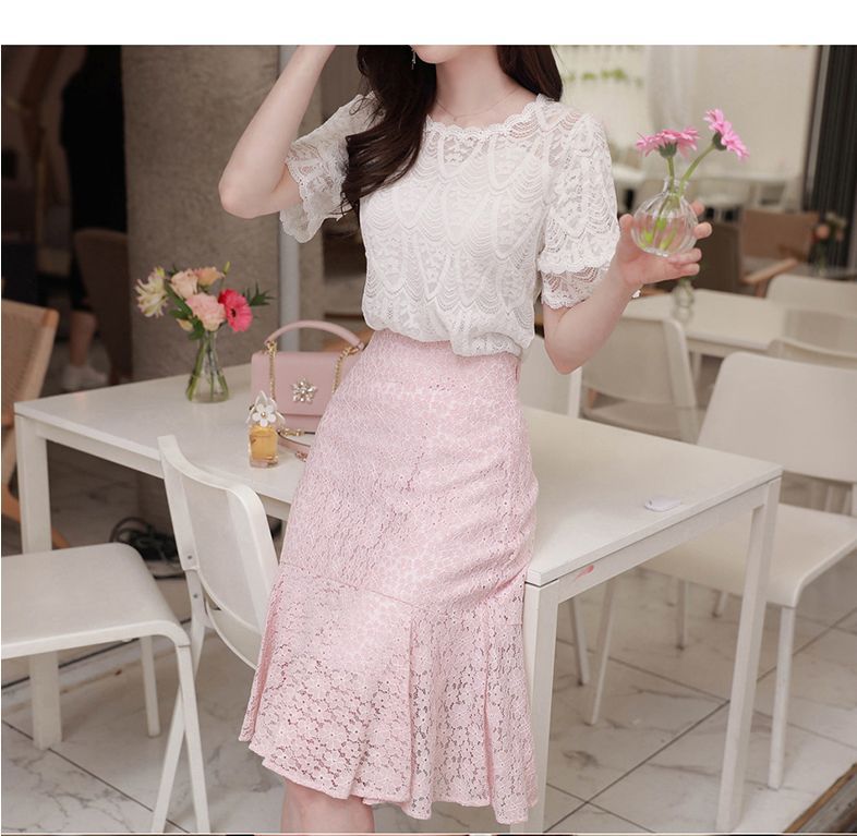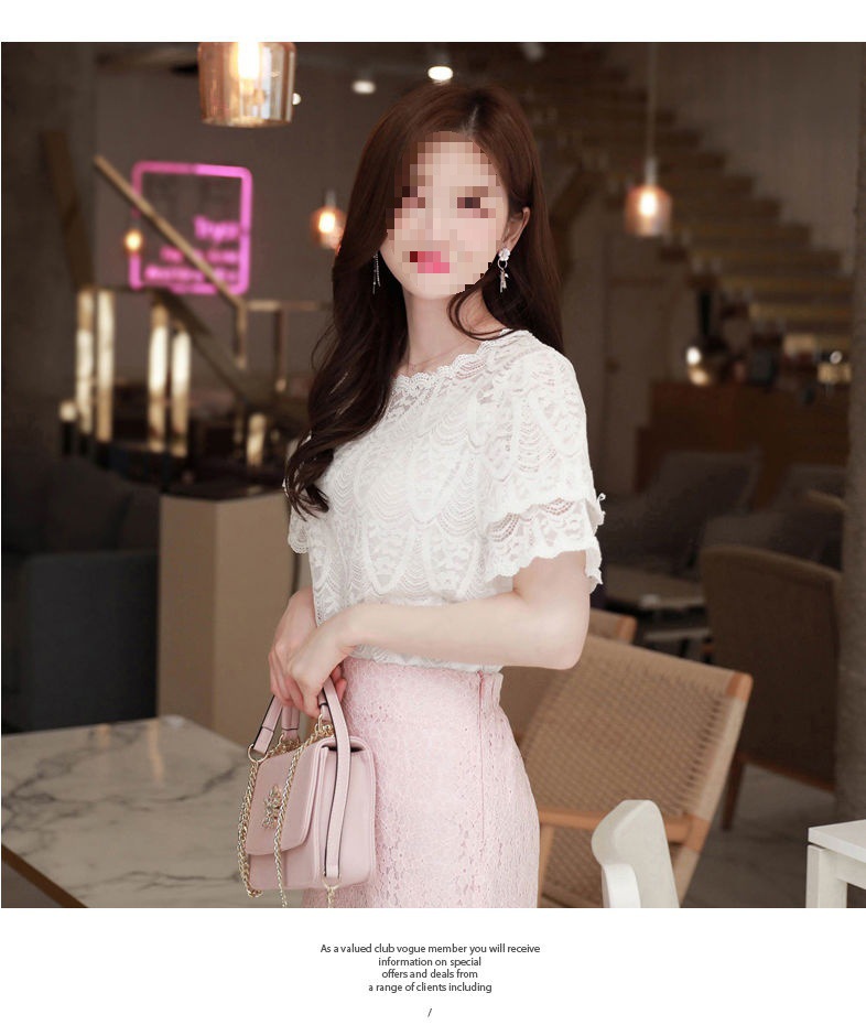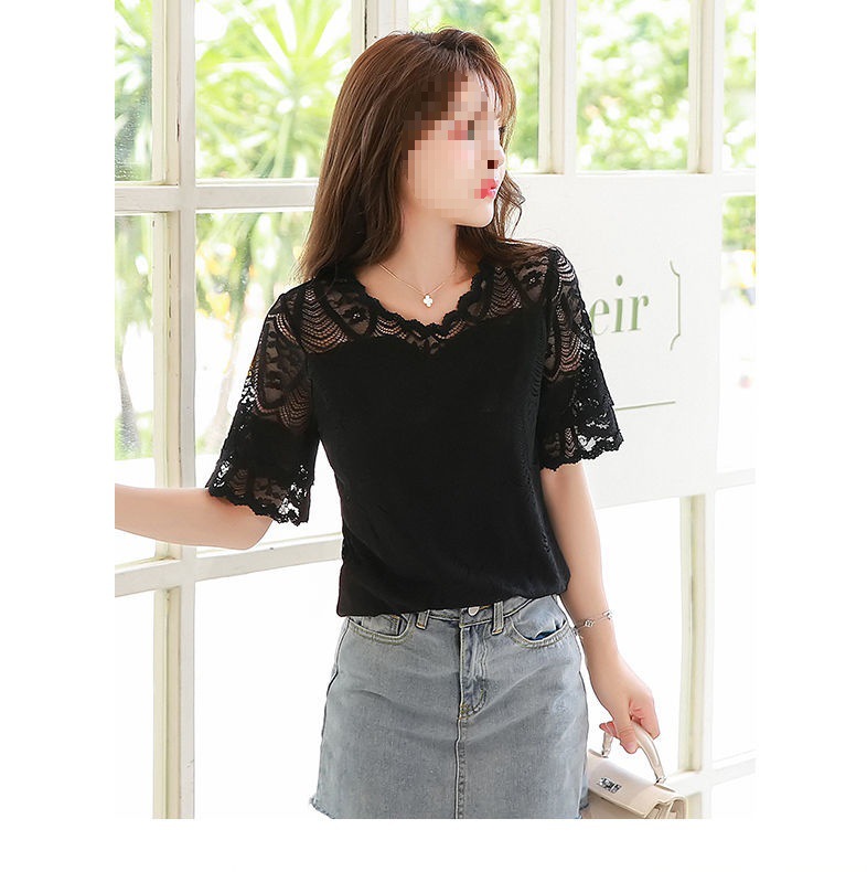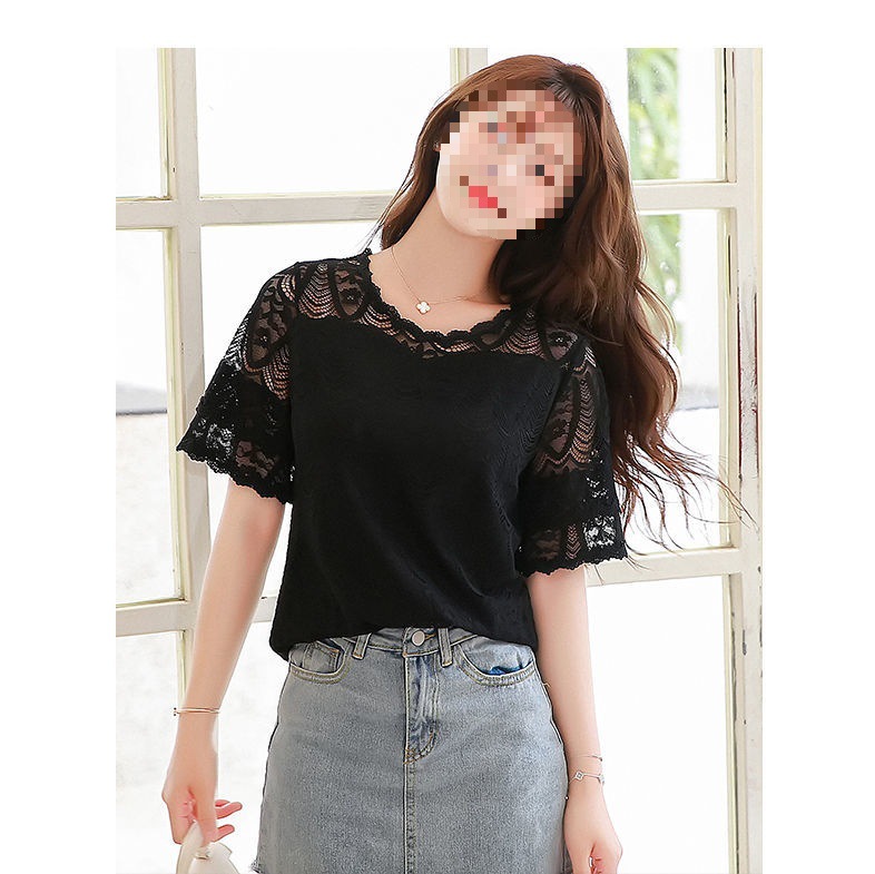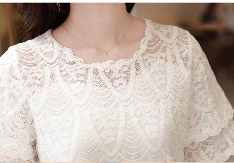여름 여성을 위한 수용성 레이스 탑, 새로운 한국식 흰색 기질 중공 라운드 넥 반팔 쉬폰 바닥 셔츠