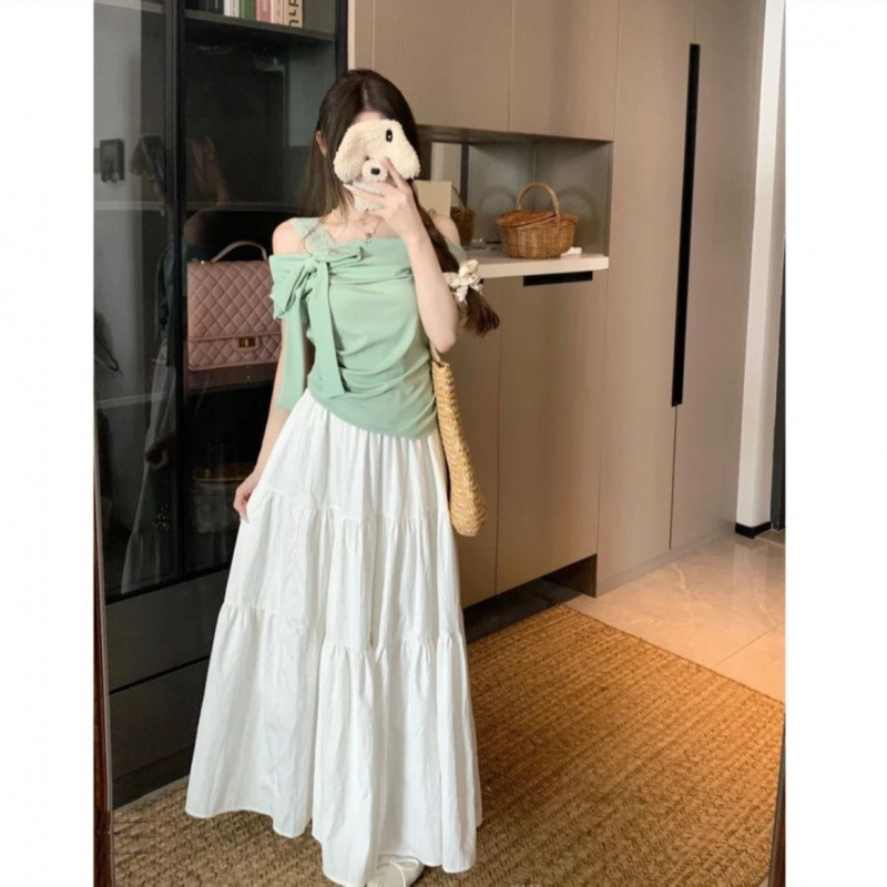 8395 원 숄더 퓨어 러스티 티셔츠 여성 여름 보우 오프 숄더 반팔 스위트 소녀 스타일 탑 여성용스토어 가기