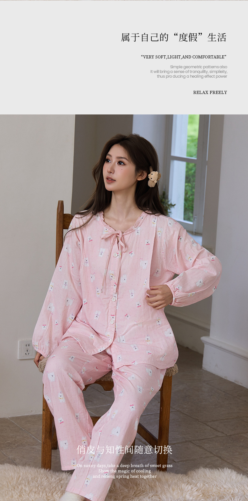 새로운 여성스러운 스타일의 순면 잠옷, 여성용 이중 거즈, 봄, 가을, 여름, 야외에서 착용 가능, 달콤하고 귀여운 가정복 세트