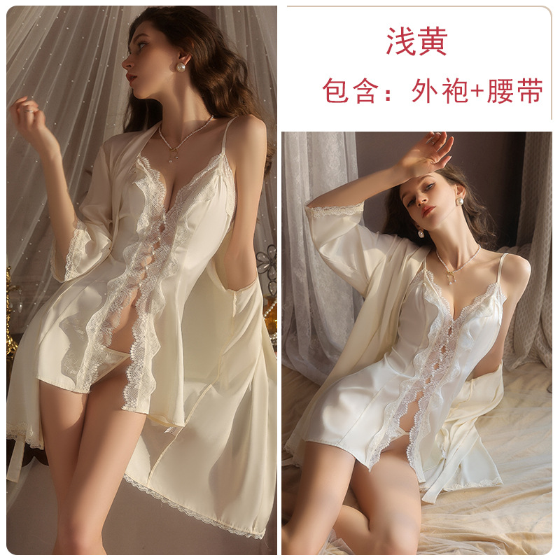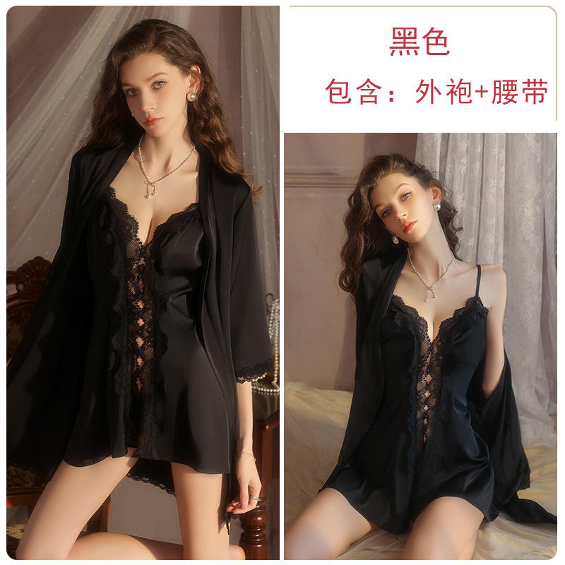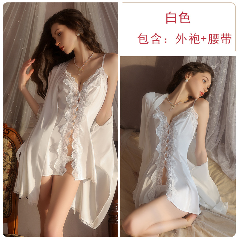DZ Guiruo 달콤하고 실키한 새틴 잠옷 순수한 욕망 게으른 레이스 딥 V 카디건 서스펜더 스커트 가운 세트 5219스토어 가기
