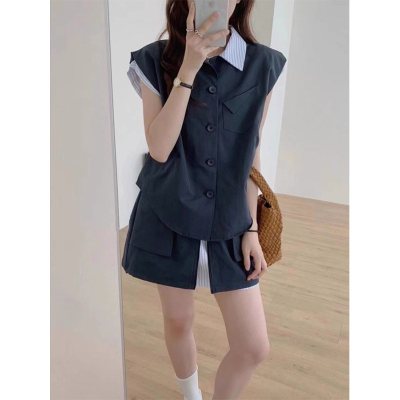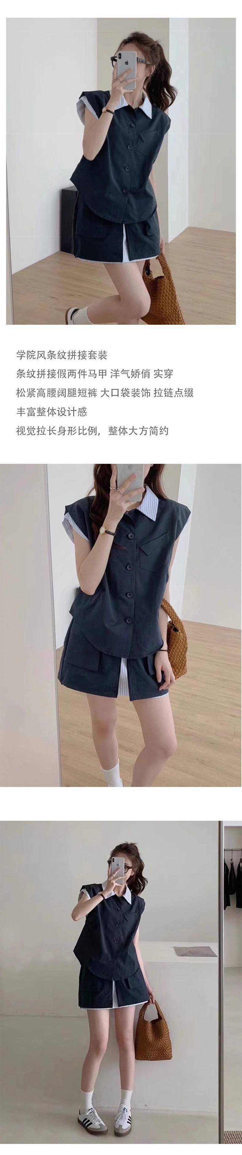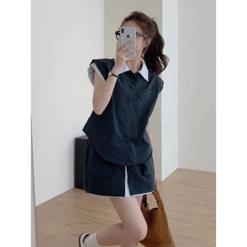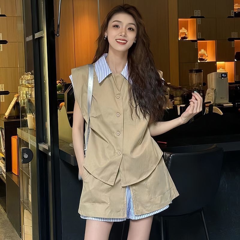 여성을위한 카키색 스트리트 연령 감소 정장 스커트 여름 2024 새로운 가짜 투피스 스트라이프 스플 라이스 탑 반바지 투피스 세트스토어 가기