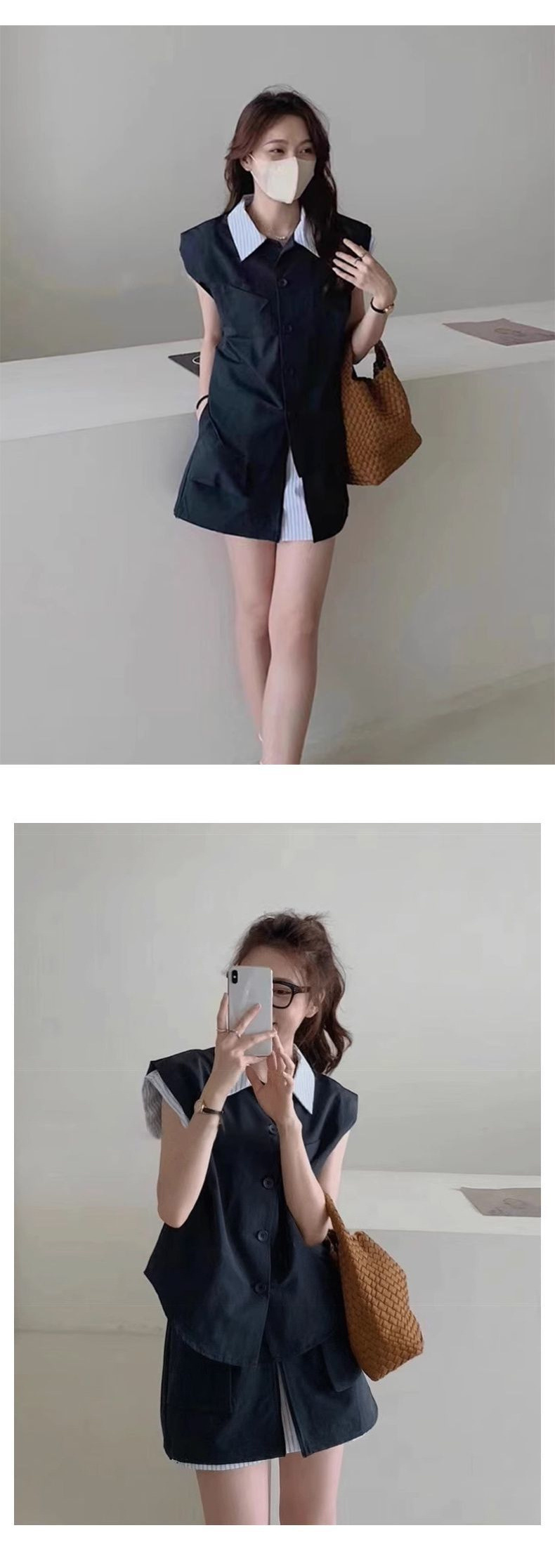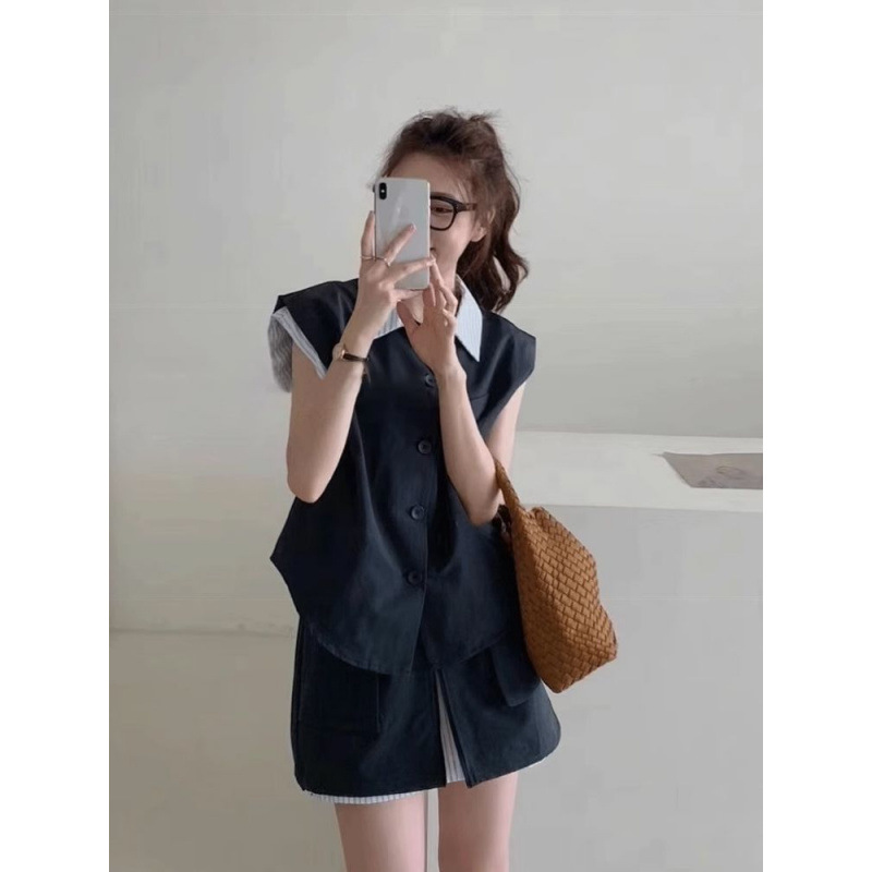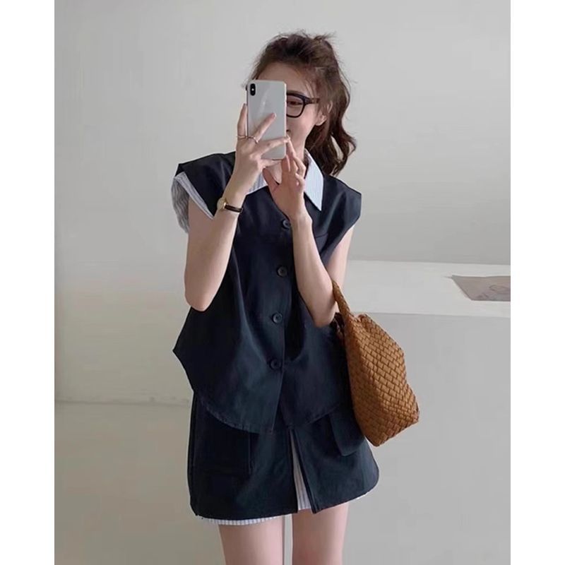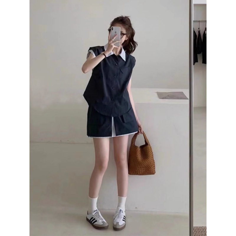 여성을위한 카키색 스트리트 연령 감소 정장 스커트 여름 2024 새로운 가짜 투피스 스트라이프 스플 라이스 탑 반바지 투피스 세트스토어 가기