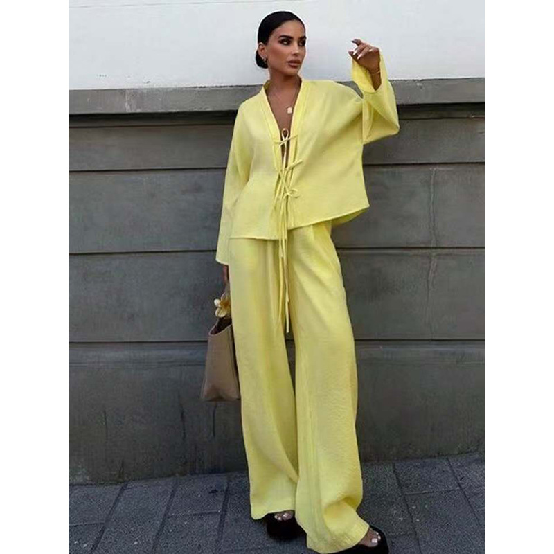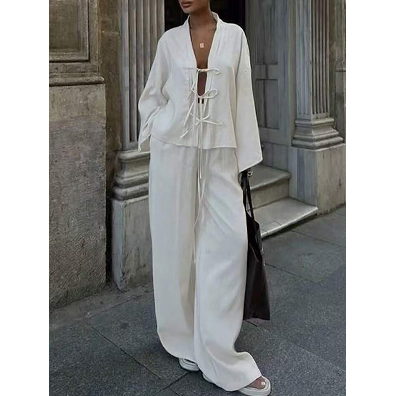 아마존 캐주얼 정장 여성 2025 가을 겨울 신작 루즈한 레이스 업 섹시 탑 와이드 팬츠 투피스 세트 재고 있음스토어 가기