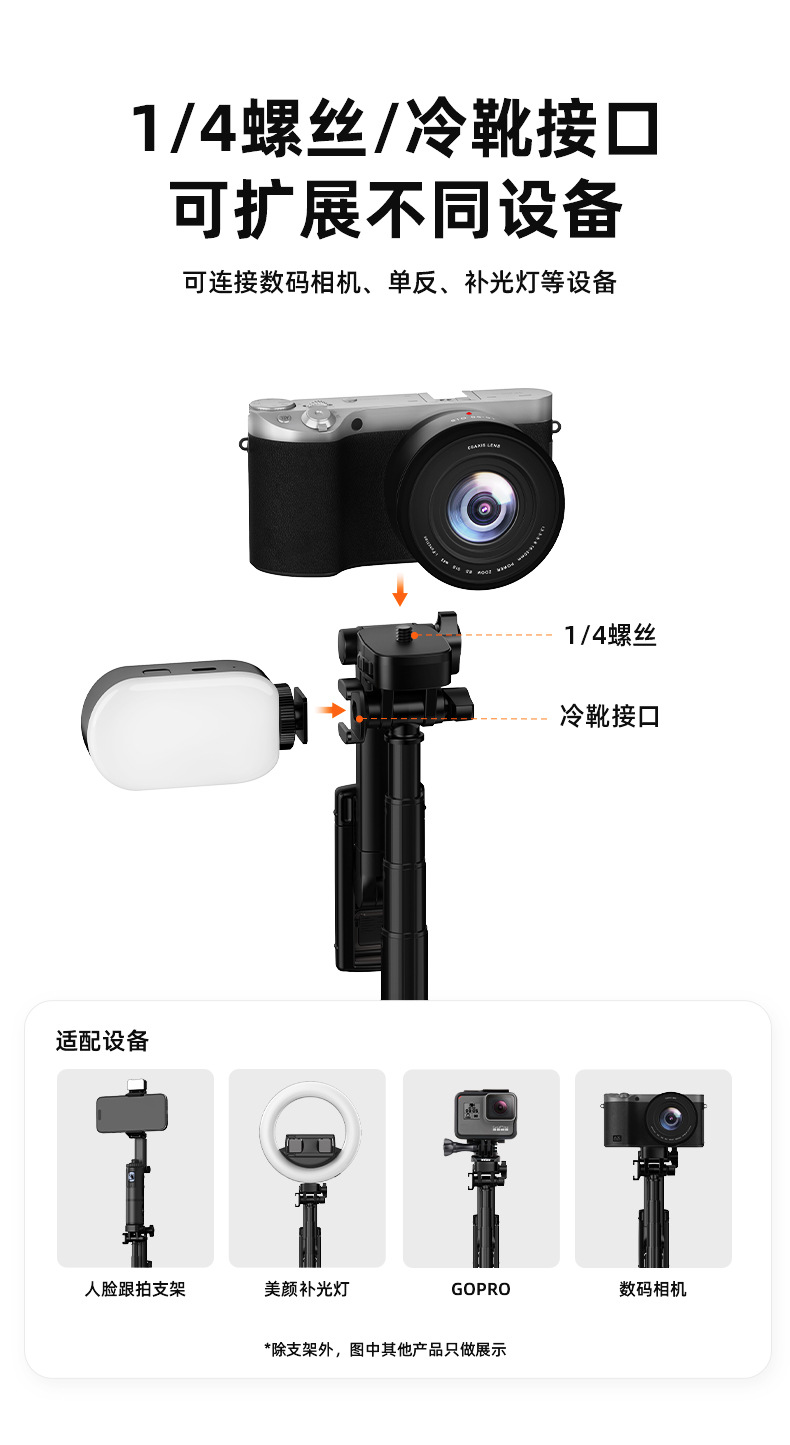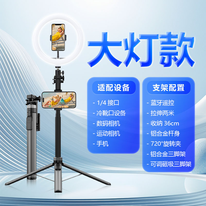 • 듀얼 카메라 라이브 방송 조명 모델 [ 1.9m ] 휴대폰 및 카메라용 범용 + 알루미늄 합금 샤프트 + 충전 리모콘 + 자기 삼각대