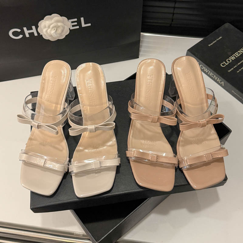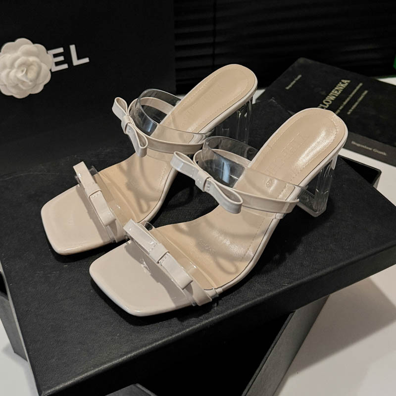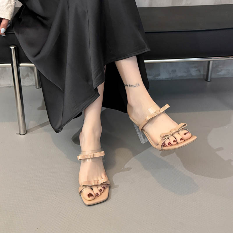 아름다운 요정 스타일 크리스탈 하이힐 샌들 2025 여름 새로운 투명 나비 매듭 두꺼운 굽 다용도 외부 샌들스토어 가기
