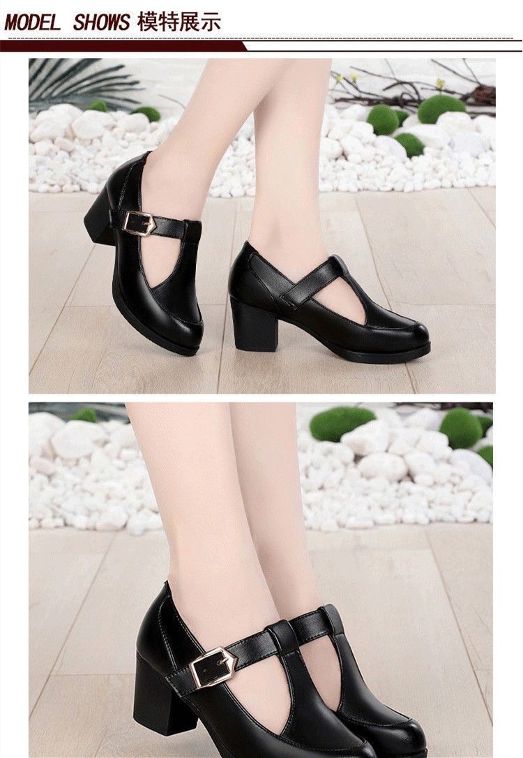 2025 여름 부드러운 가죽 미끄럼 방지 미드 힐 T 자형 버클 가죽 신발 하이힐 라운드 발가락 두꺼운 굽 중년 어머니 여성 신발스토어 가기