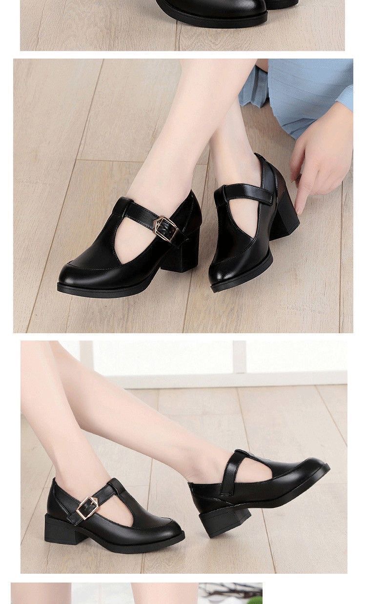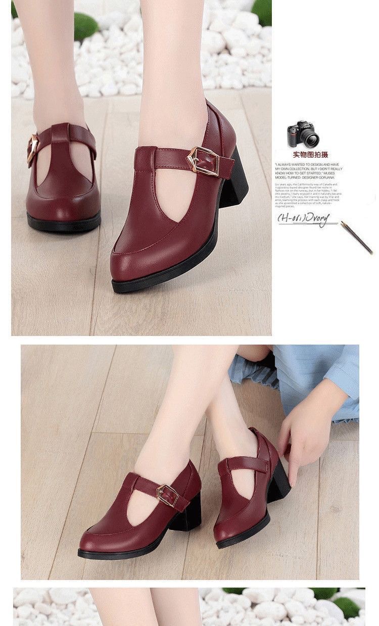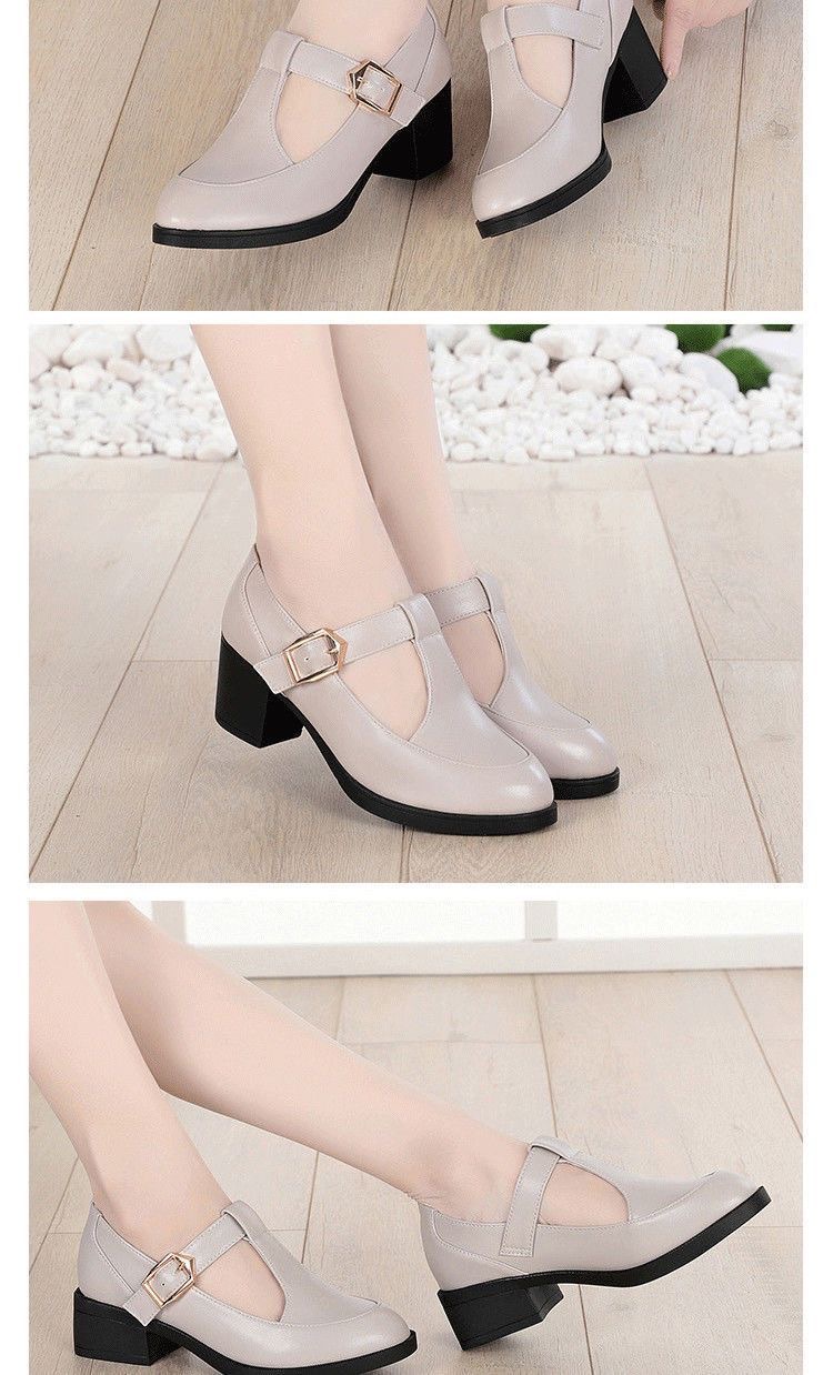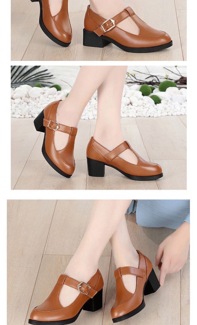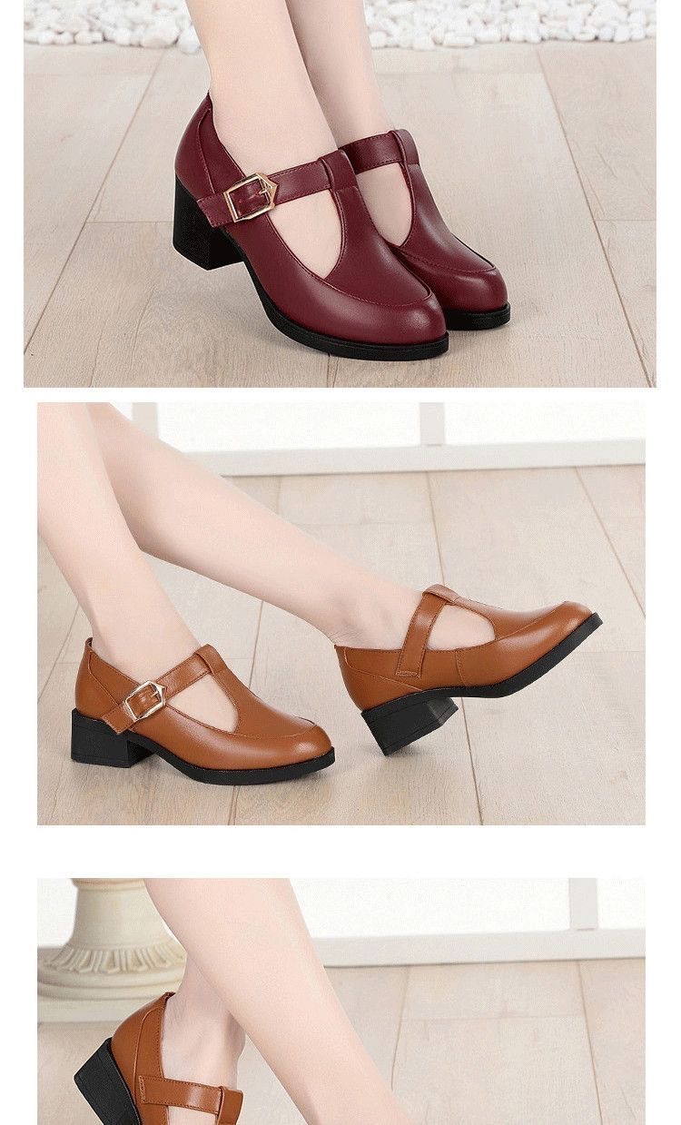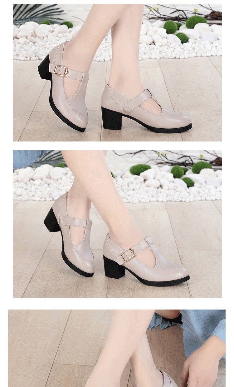 2025 여름 부드러운 가죽 미끄럼 방지 미드 힐 T 자형 버클 가죽 신발 하이힐 라운드 발가락 두꺼운 굽 중년 어머니 여성 신발