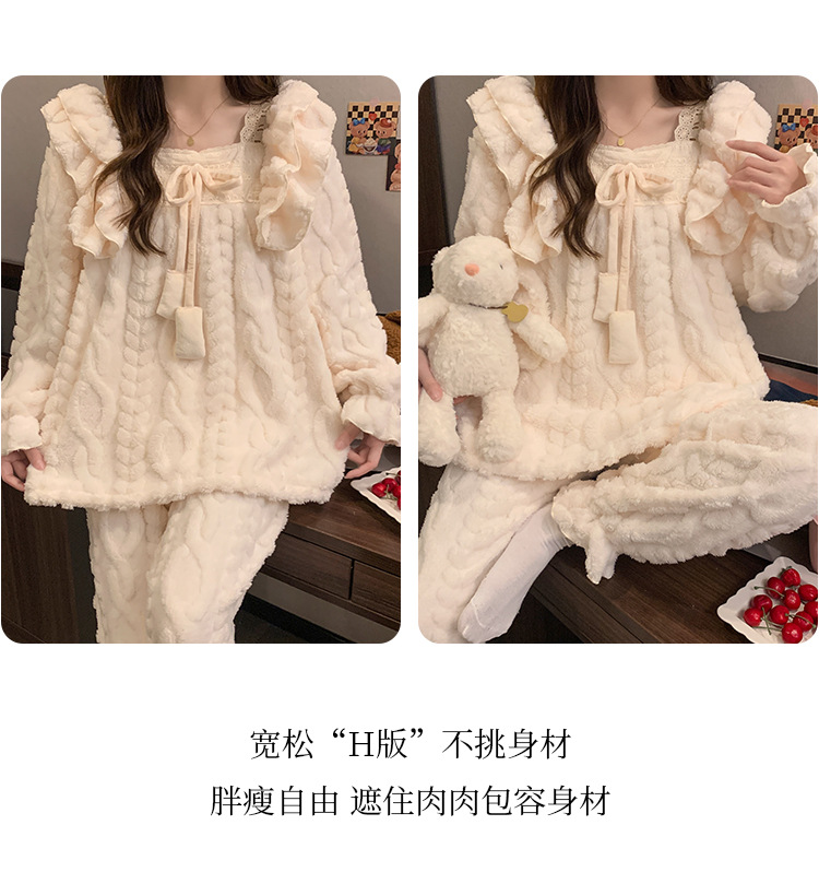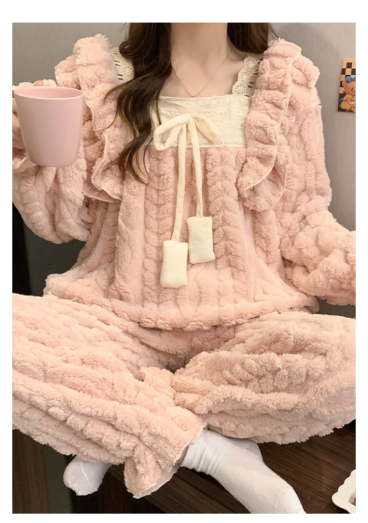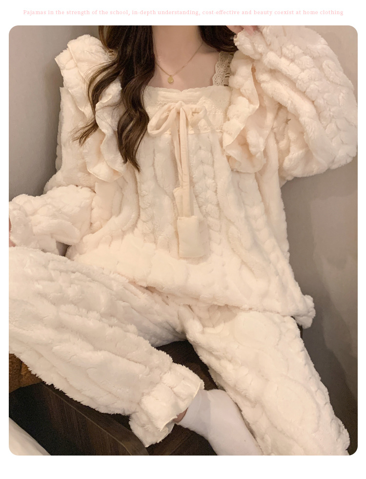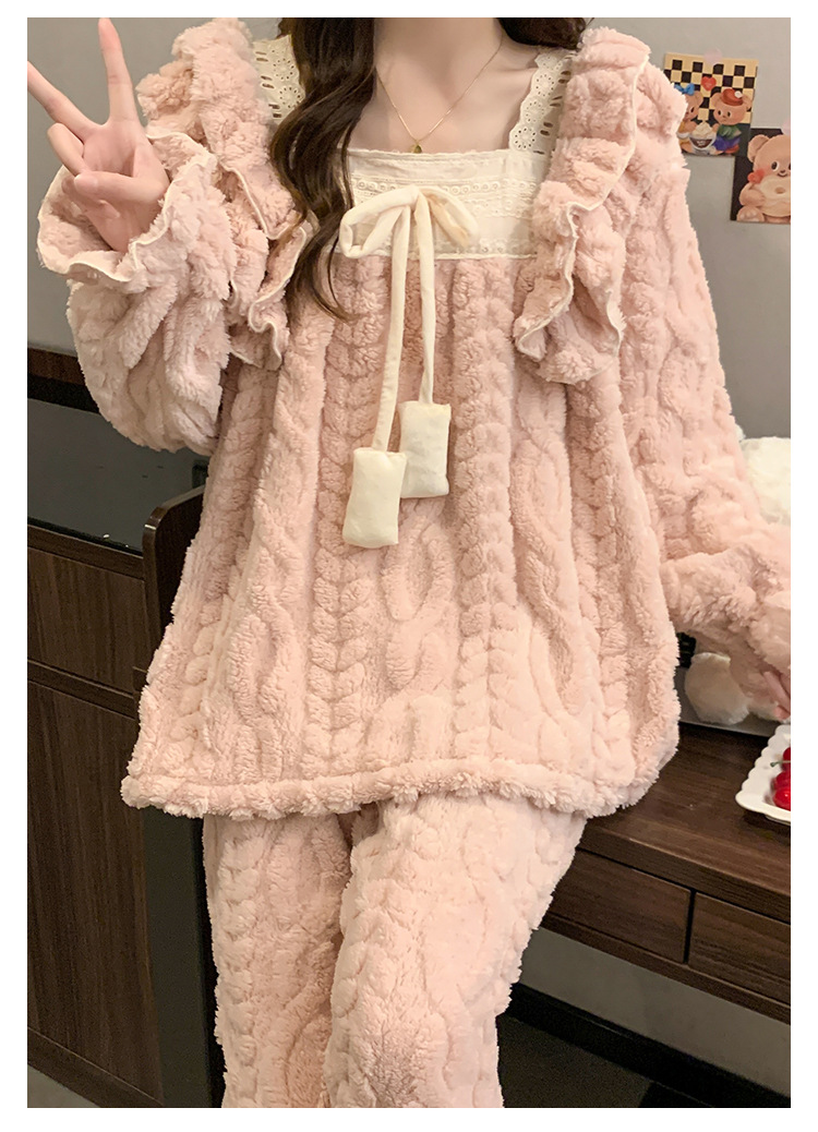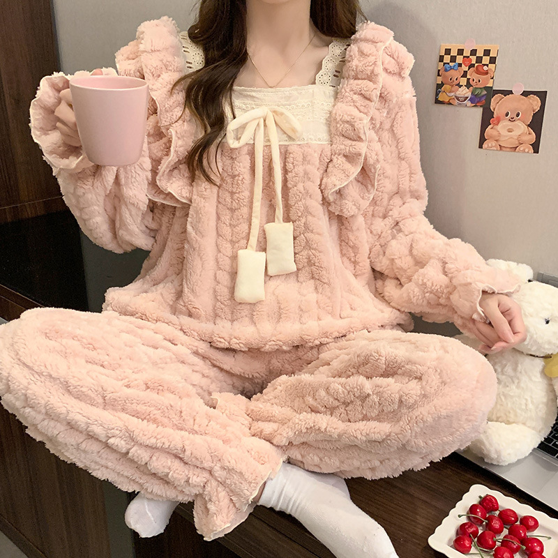 여성을위한 플란넬 잠옷 겨울 두꺼운 2025 새로운 산호 벨벳 가을, 겨울 스퀘어 칼라 달콤한 홈웨어 세트