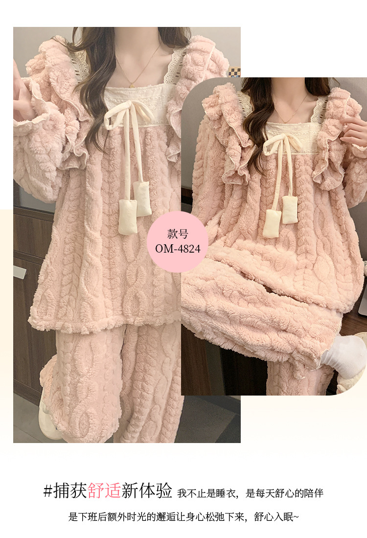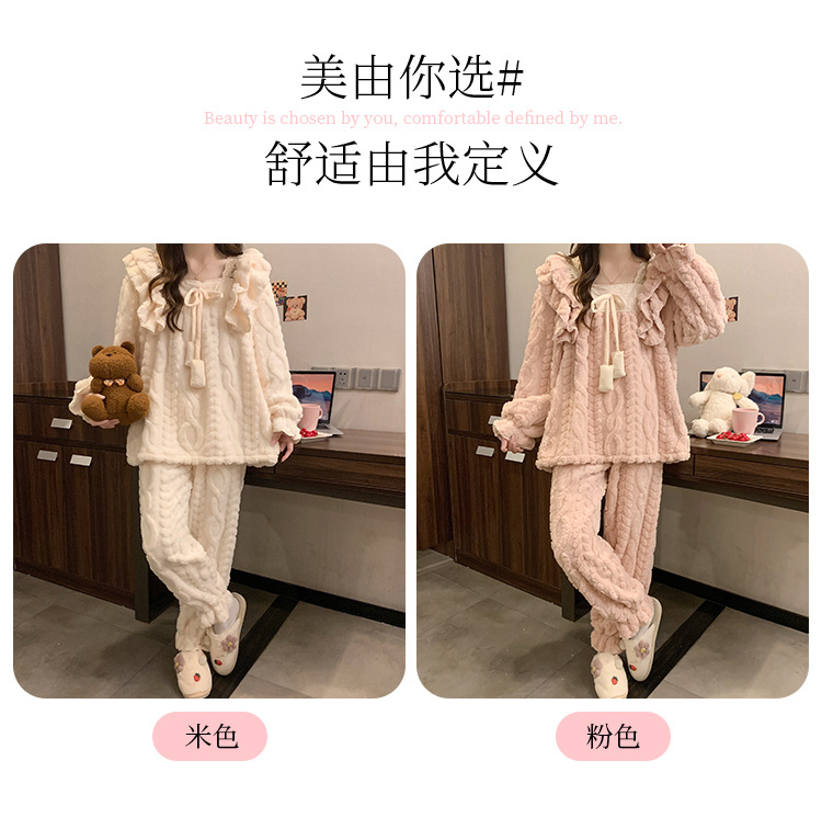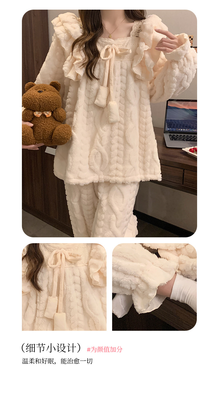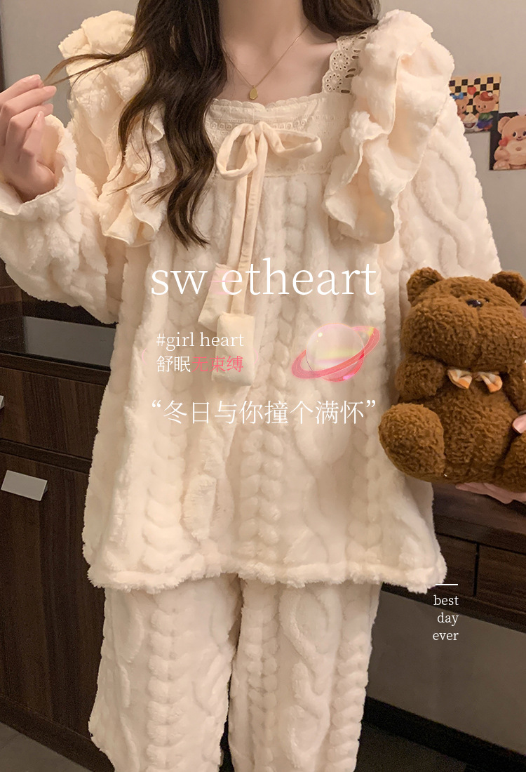 여성을위한 플란넬 잠옷 겨울 두꺼운 2025 새로운 산호 벨벳 가을, 겨울 스퀘어 칼라 달콤한 홈웨어 세트