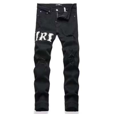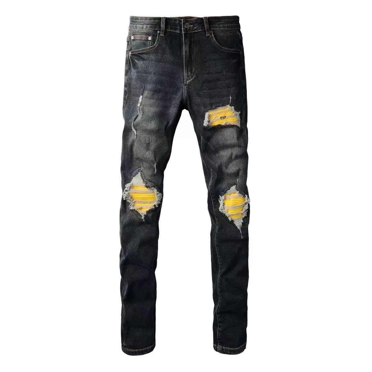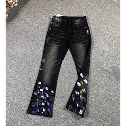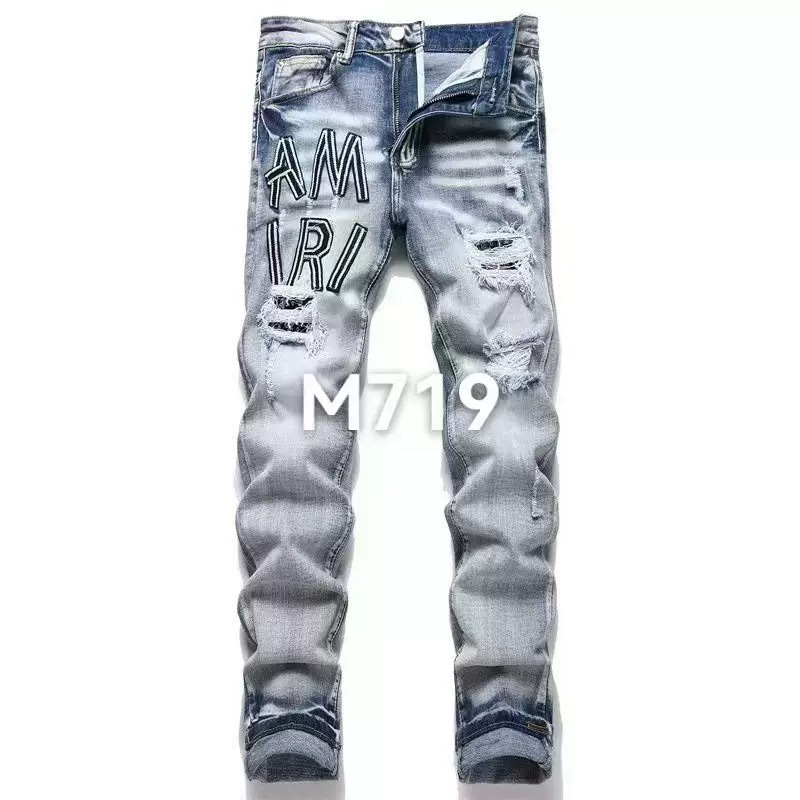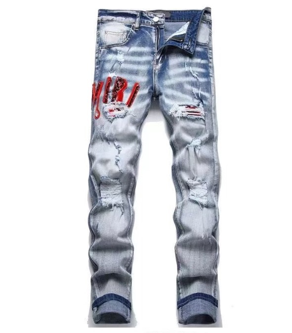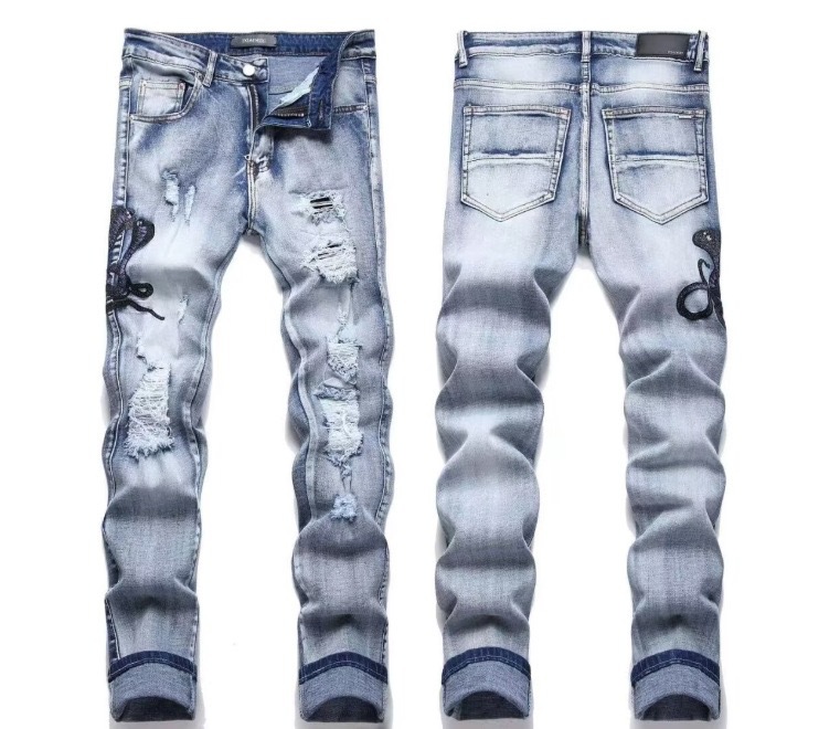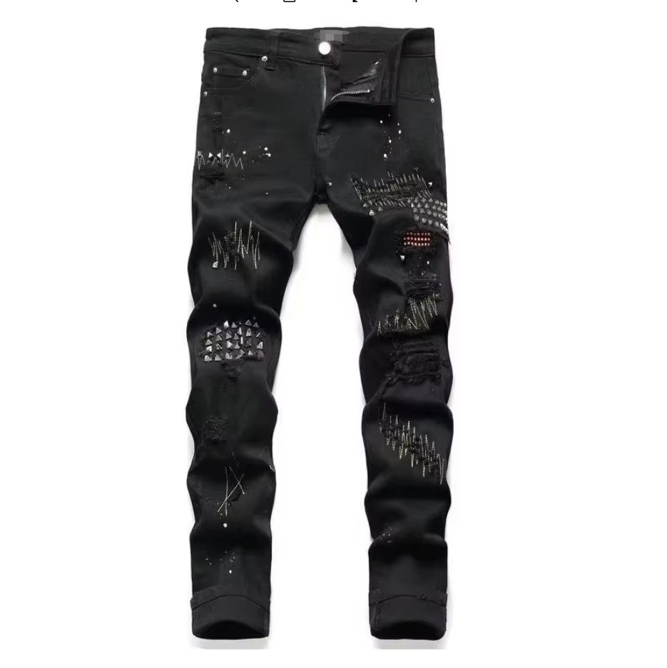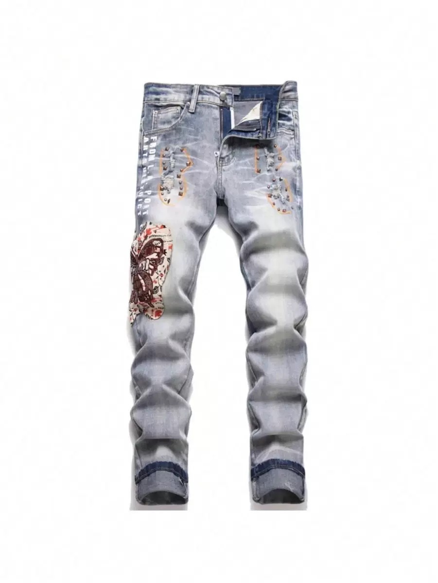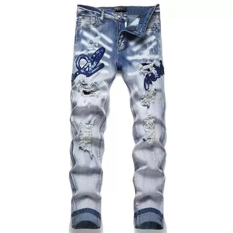 트렌디한 캐주얼 패치 슬림핏 트렌디 브랜드 맞춤형 바지 트렌디한 새로운 스타일의 남성용 찢어진 패치 자수 청바지스토어 가기