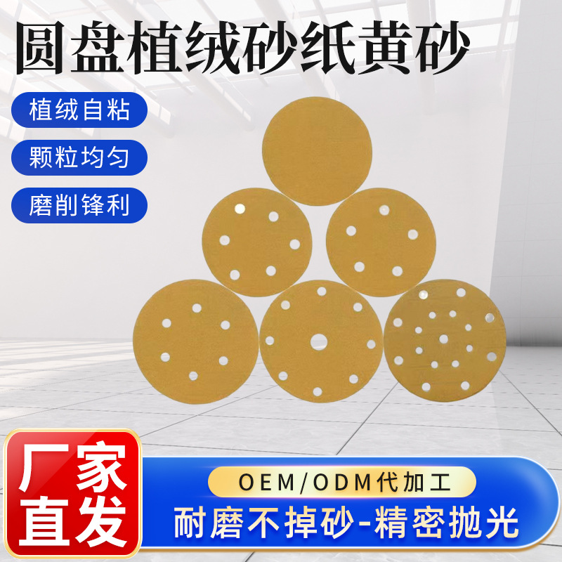 제조업체는 노란색 모래 플로킹 원형 디스크 사포, 막힘 방지 사포 시트, 연마 및 연마 브러시 시트, 벨벳 시트를 공급합니다.