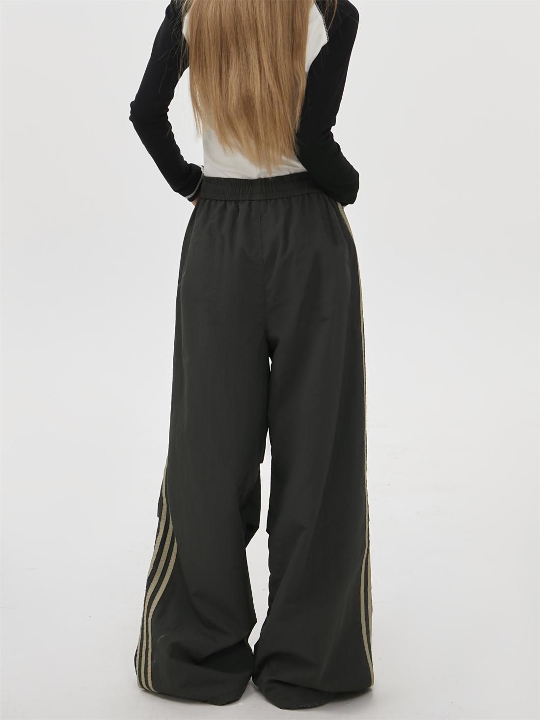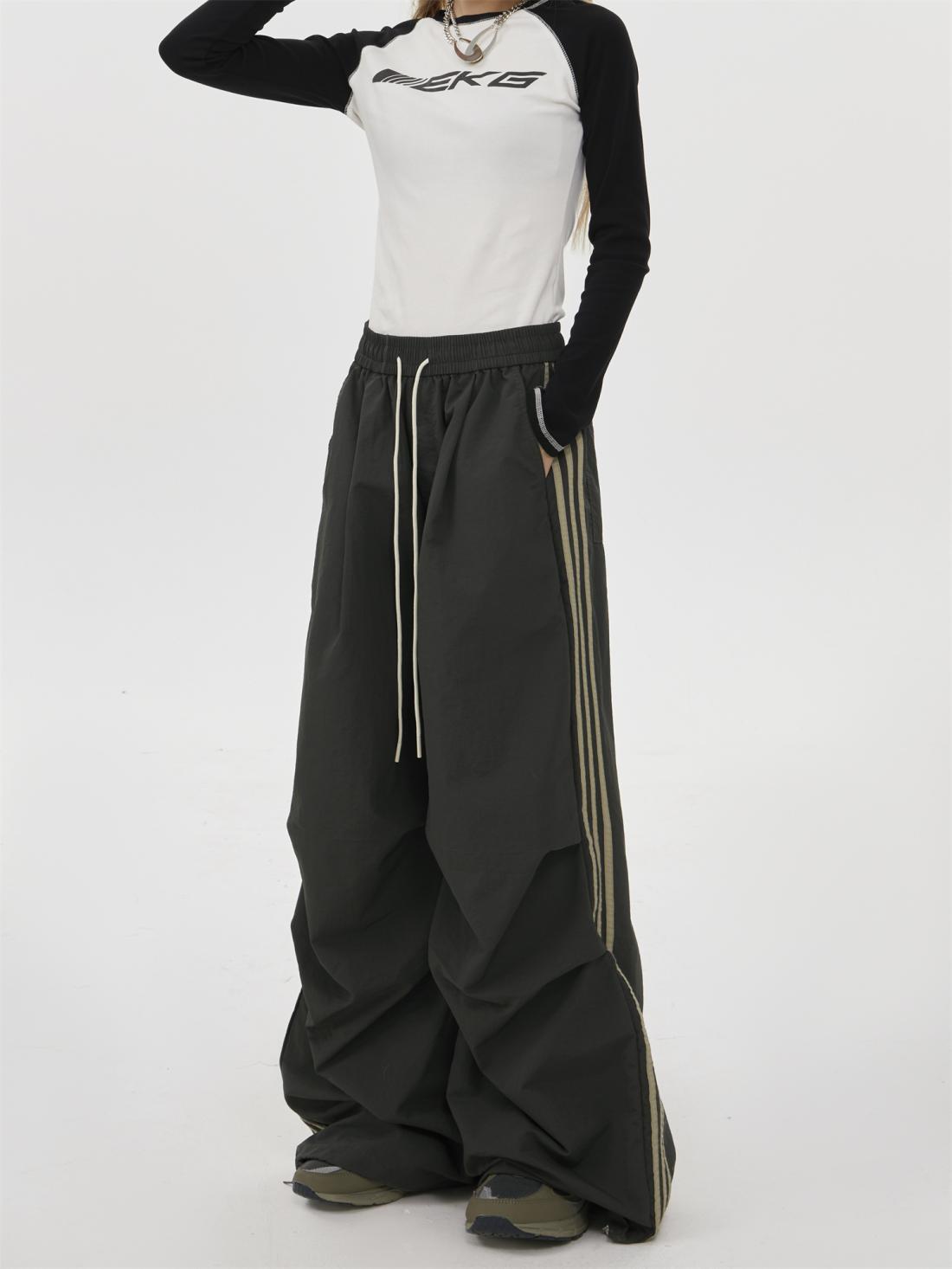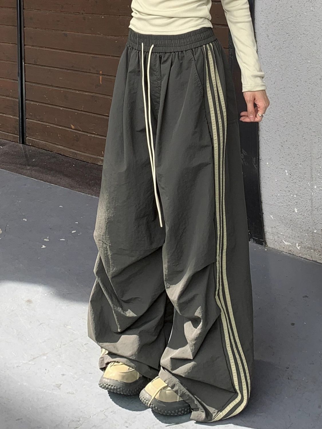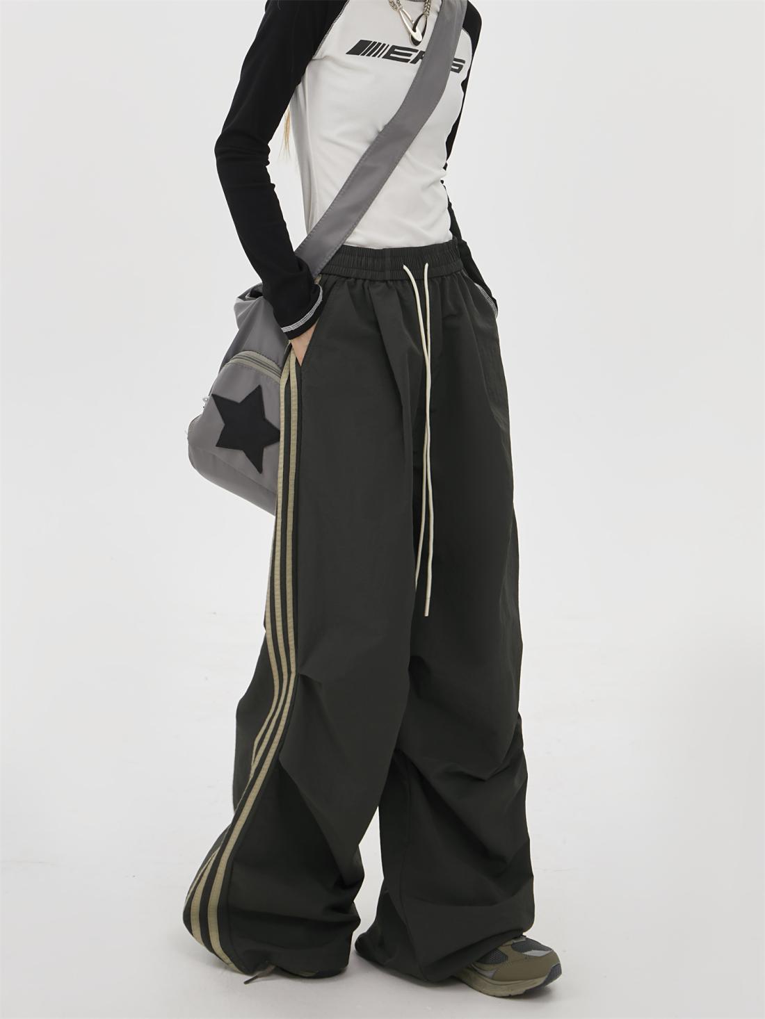 멋진 소녀의 세 줄무늬 공수 바지 속건성 초가을 새로운 미국 하이 스트리트 와이드 레그 다용도 스트레이트 팬츠 트렌디스토어 가기