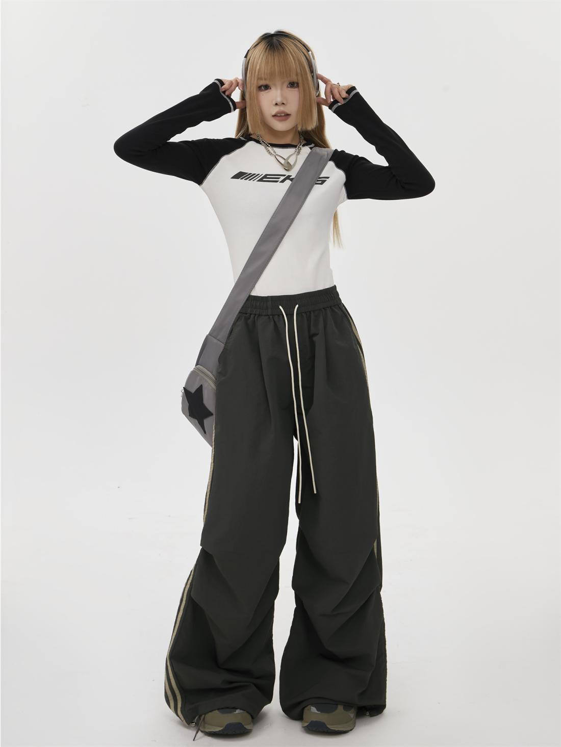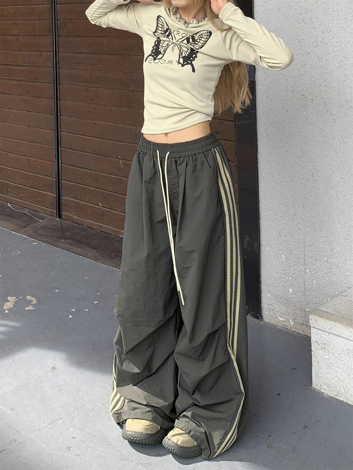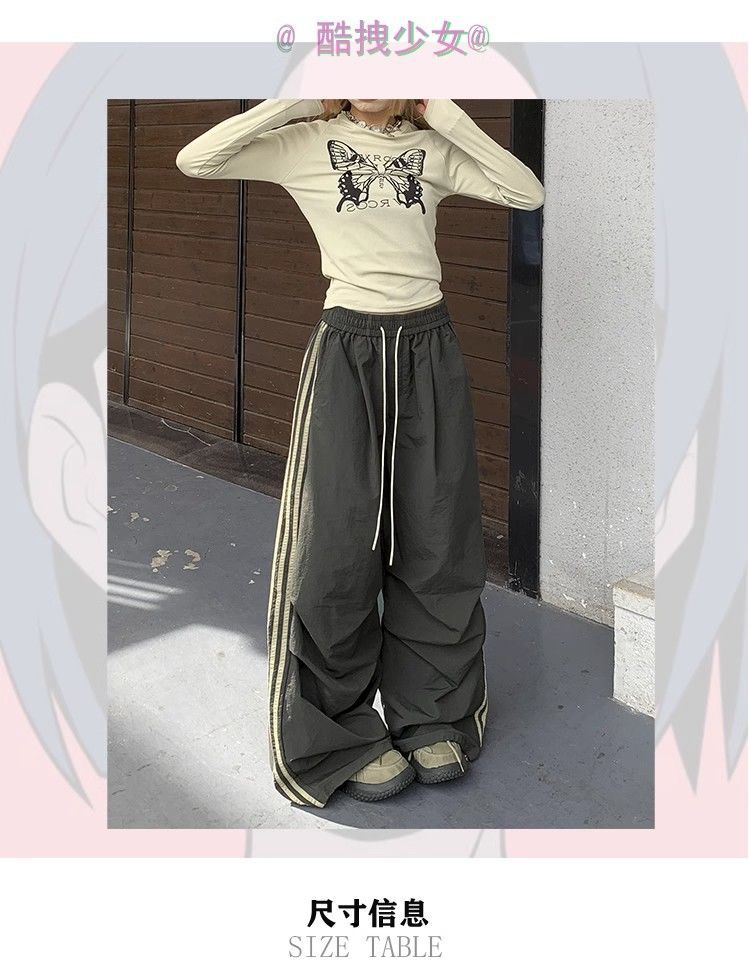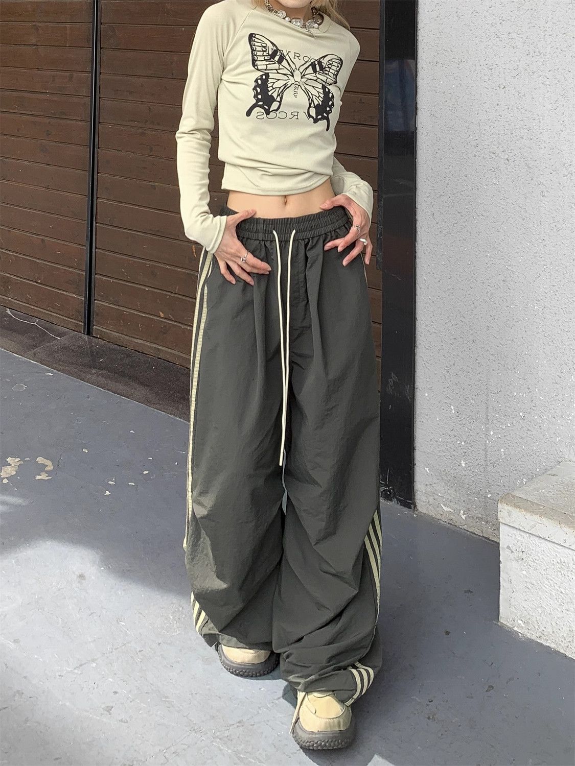 멋진 소녀의 세 줄무늬 공수 바지 속건성 초가을 새로운 미국 하이 스트리트 와이드 레그 다용도 스트레이트 팬츠 트렌디스토어 가기