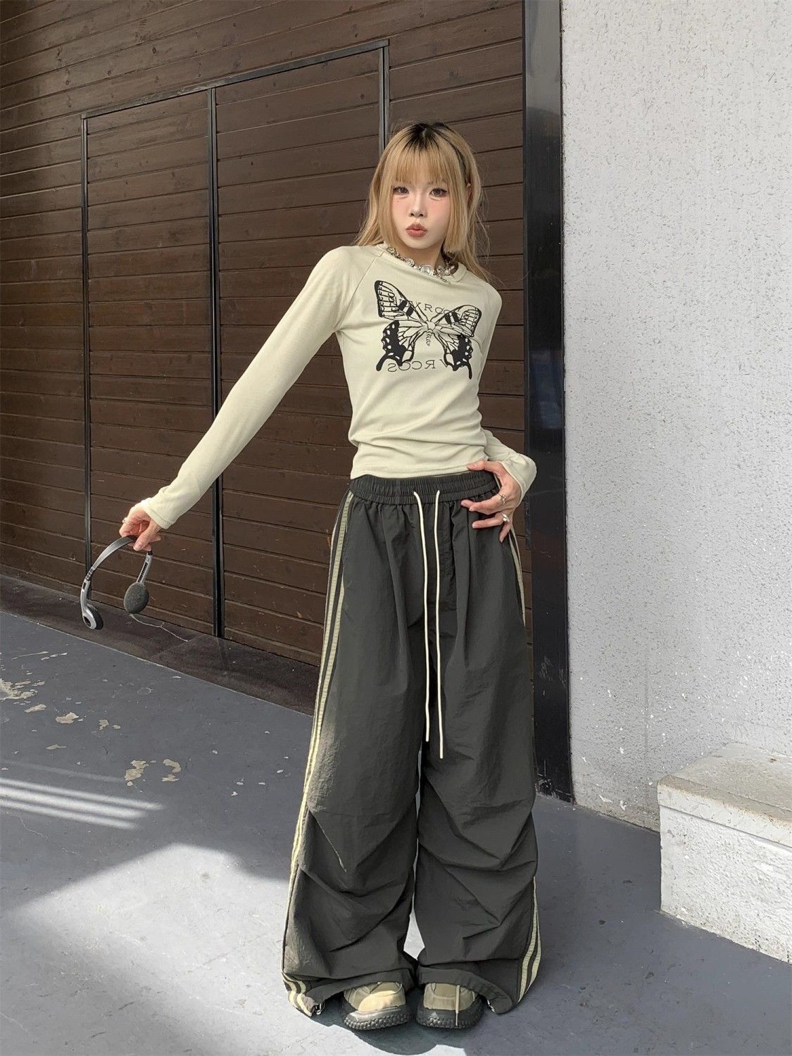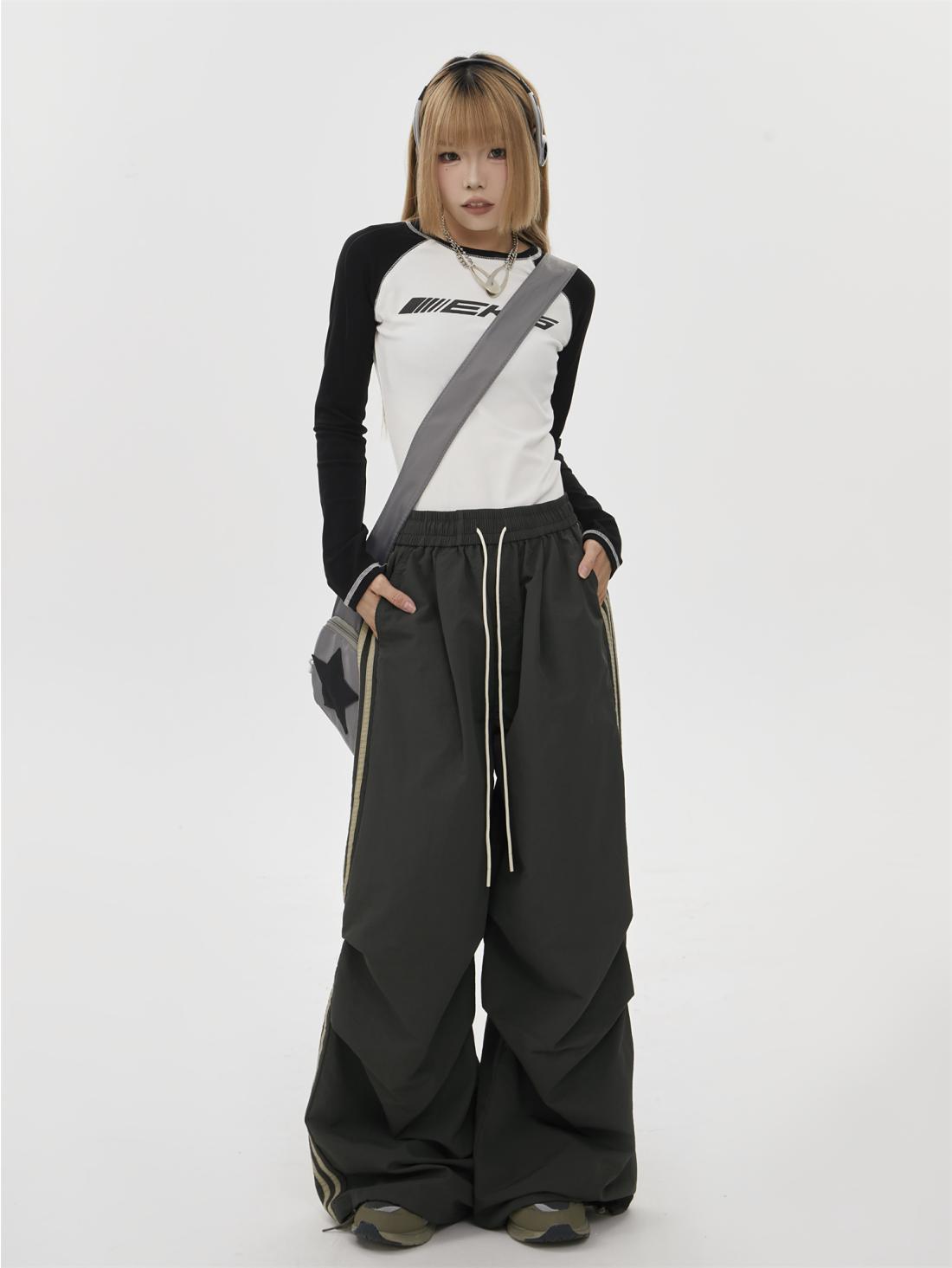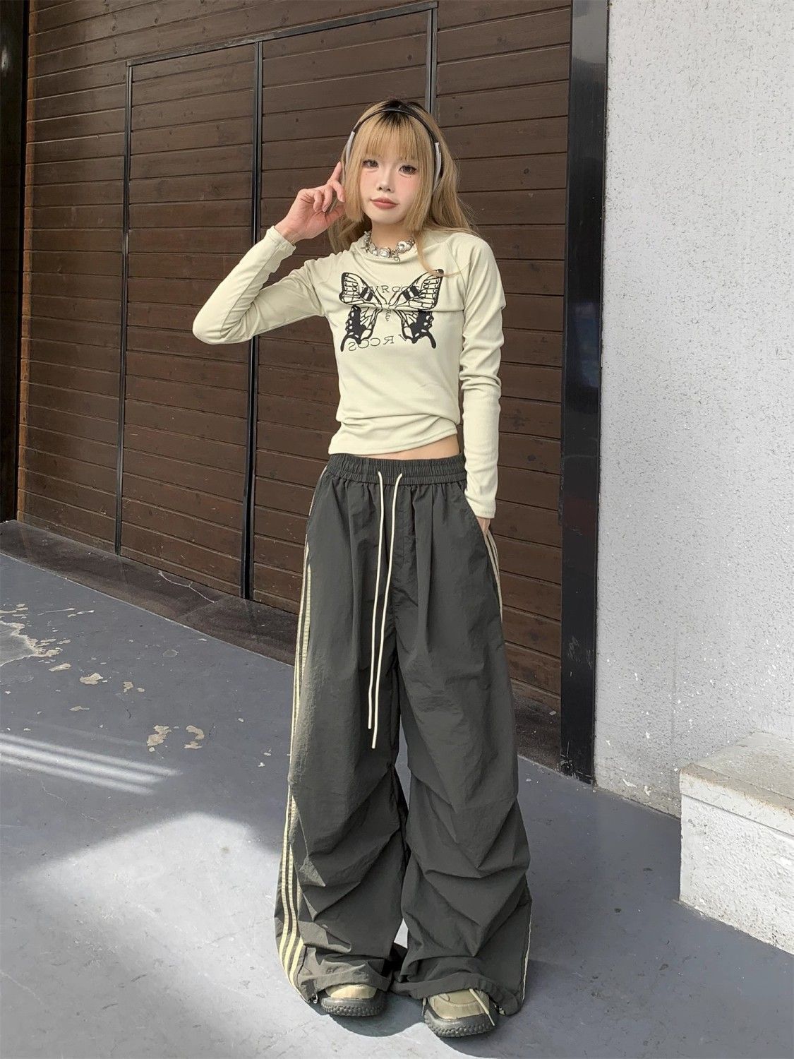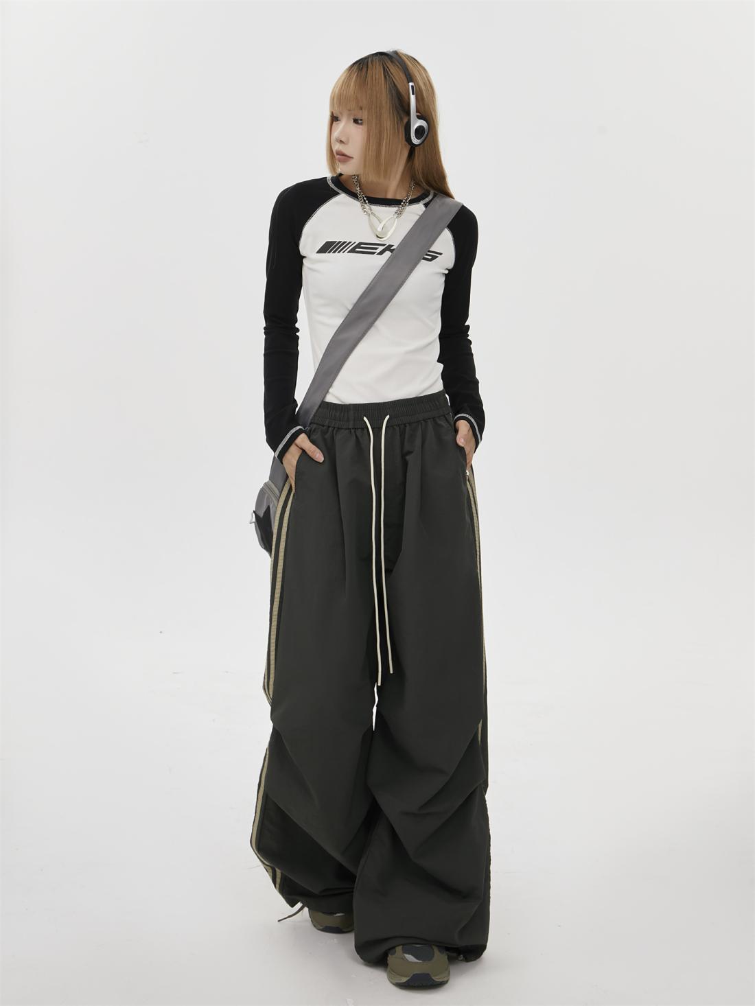 멋진 소녀의 세 줄무늬 공수 바지 속건성 초가을 새로운 미국 하이 스트리트 와이드 레그 다용도 스트레이트 팬츠 트렌디스토어 가기