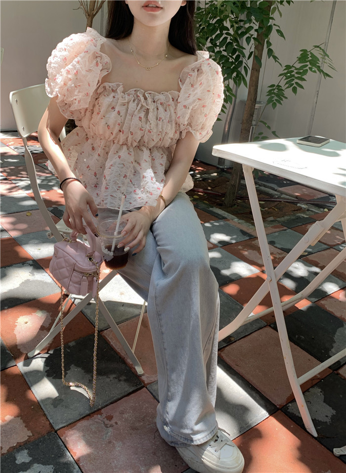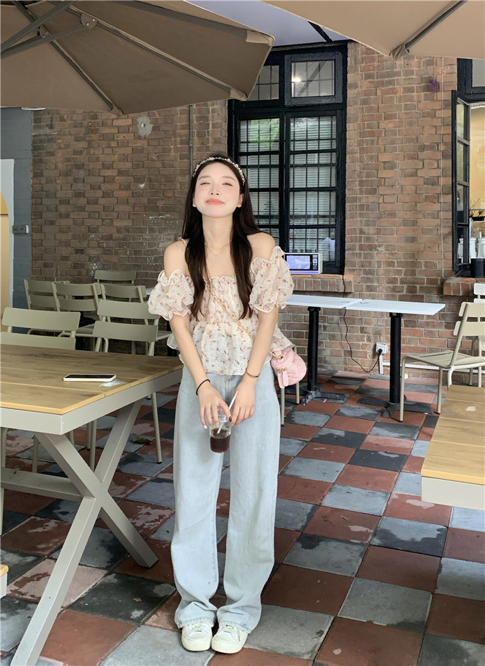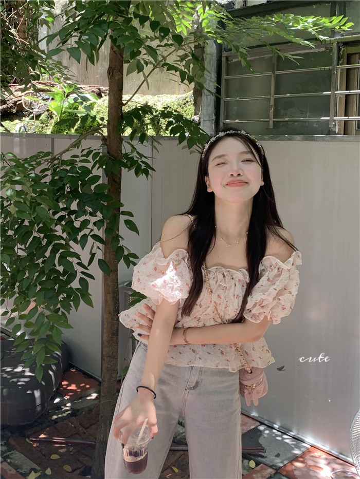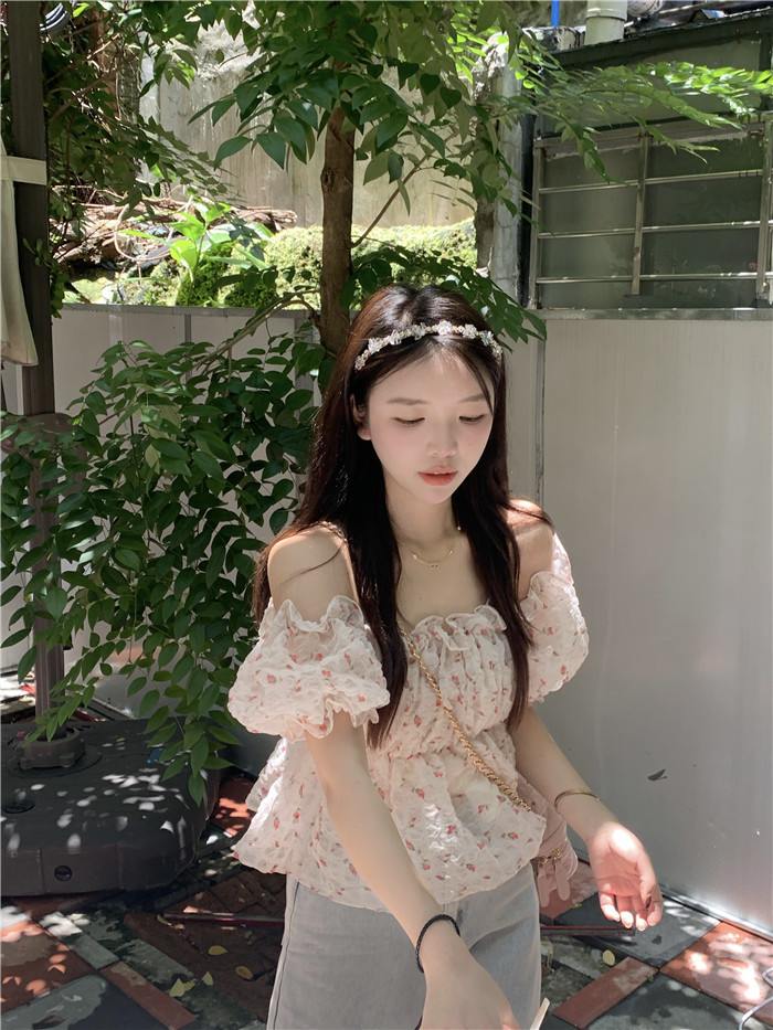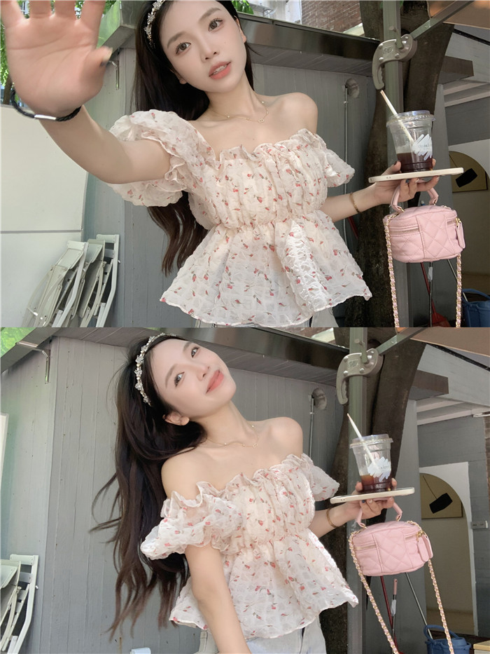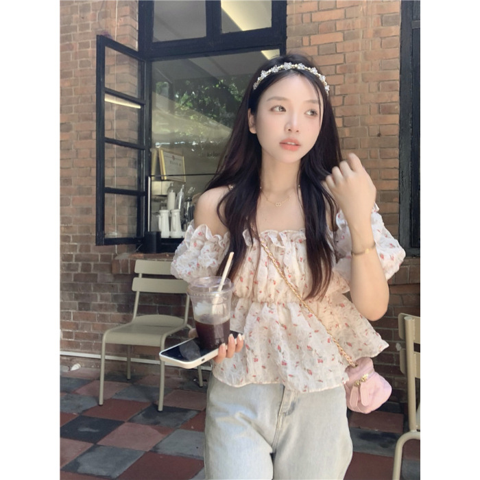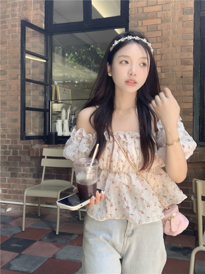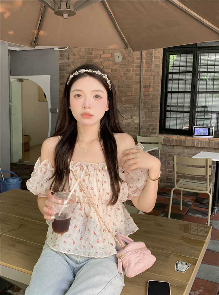 여성용 원 숄더 꽃무늬 쉬폰 셔츠 여름 프렌치 디자인 틈새 시크 슈퍼 요정 스위트 티 브레이크 쇼트 탑스토어 가기