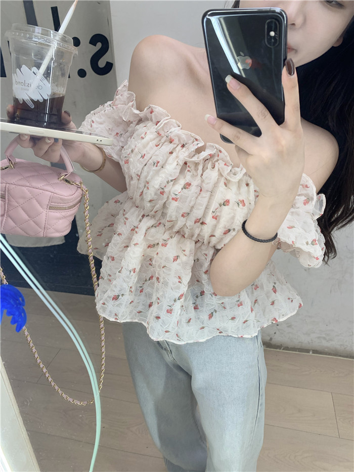 여성용 원 숄더 꽃무늬 쉬폰 셔츠 여름 프렌치 디자인 틈새 시크 슈퍼 요정 스위트 티 브레이크 쇼트 탑