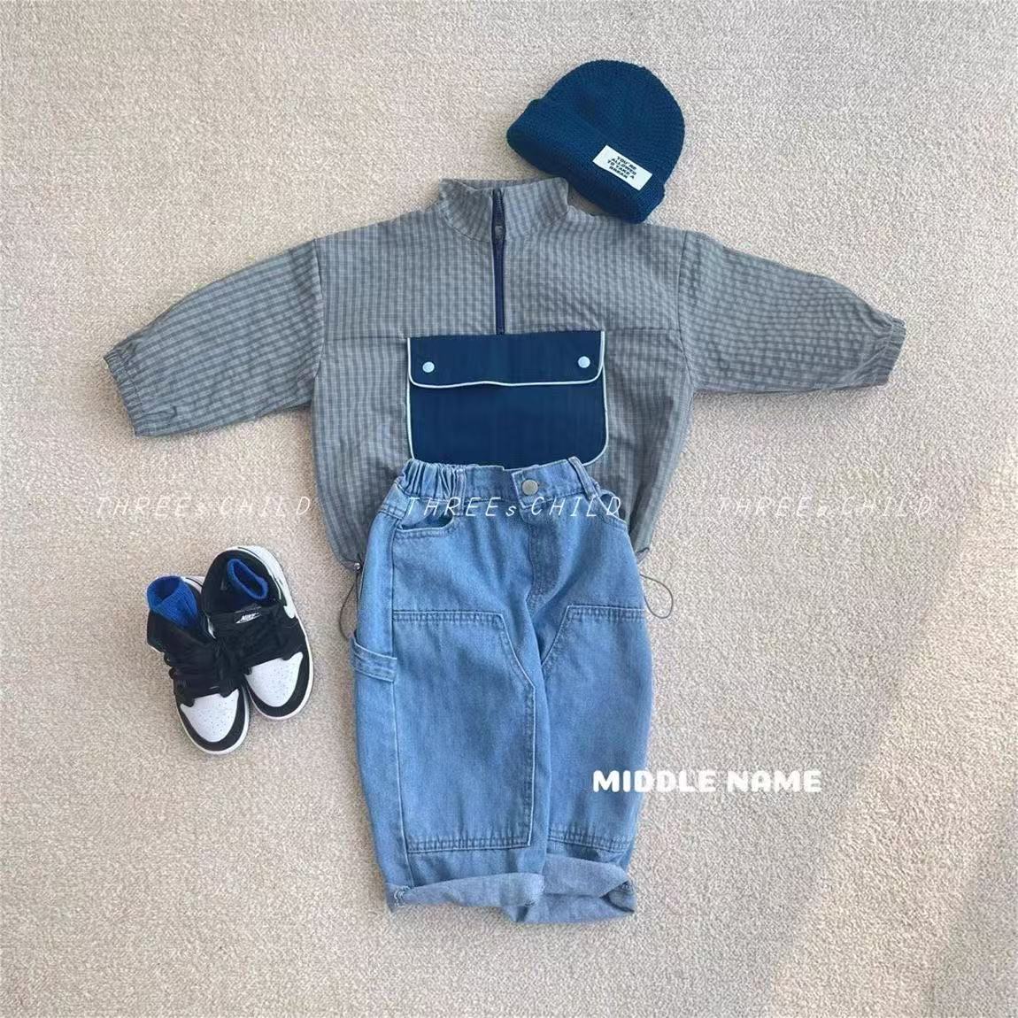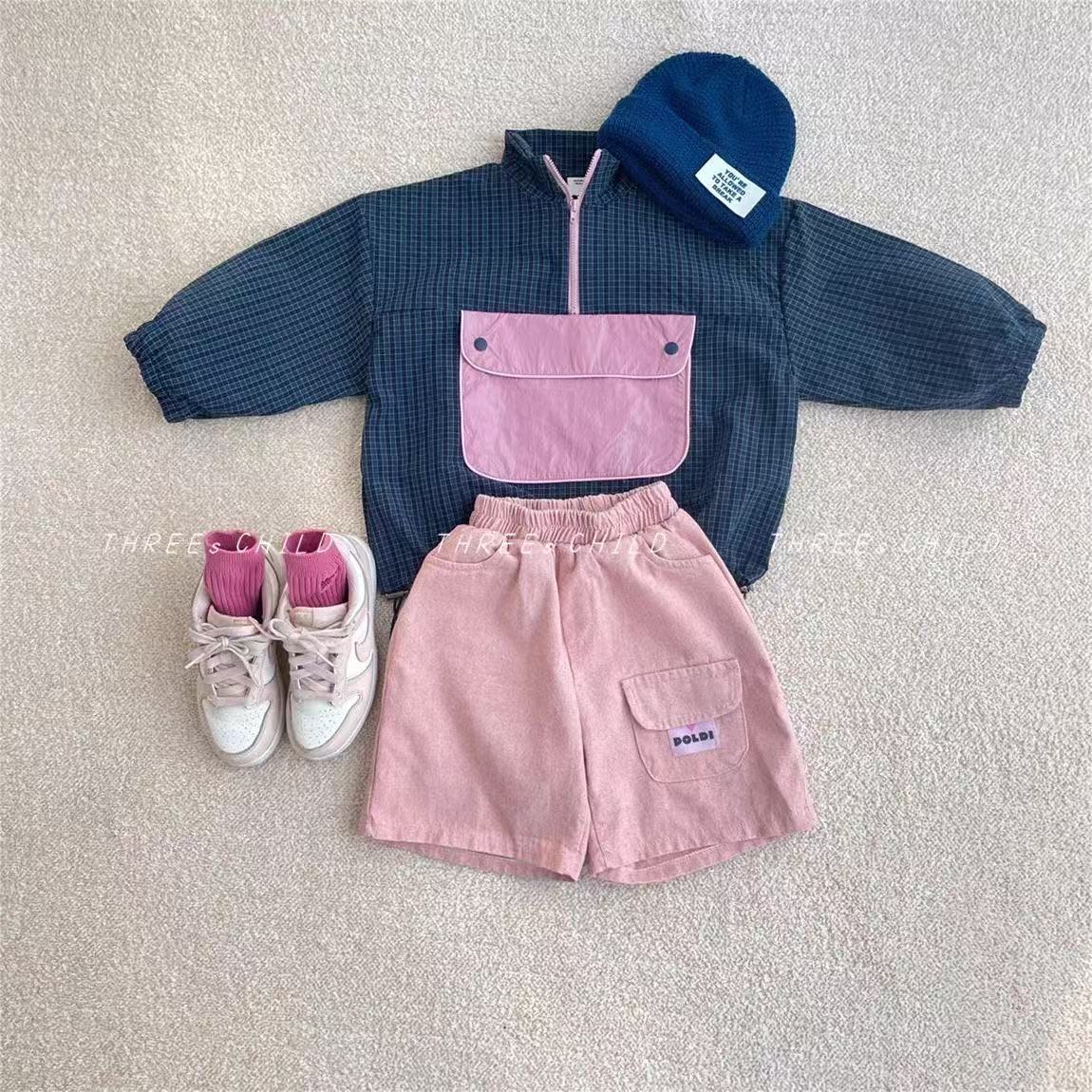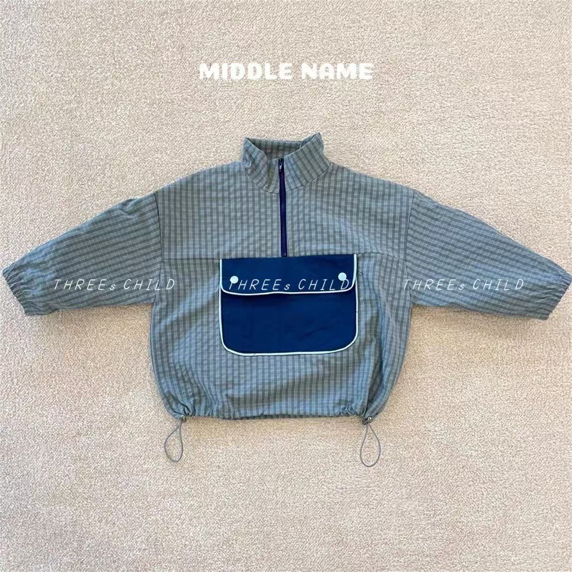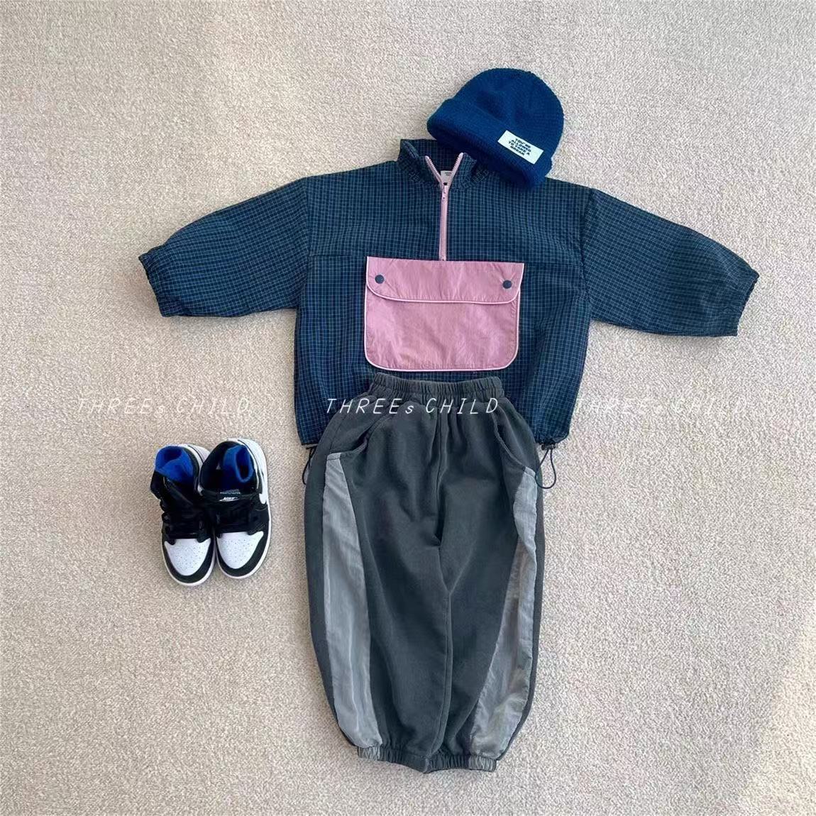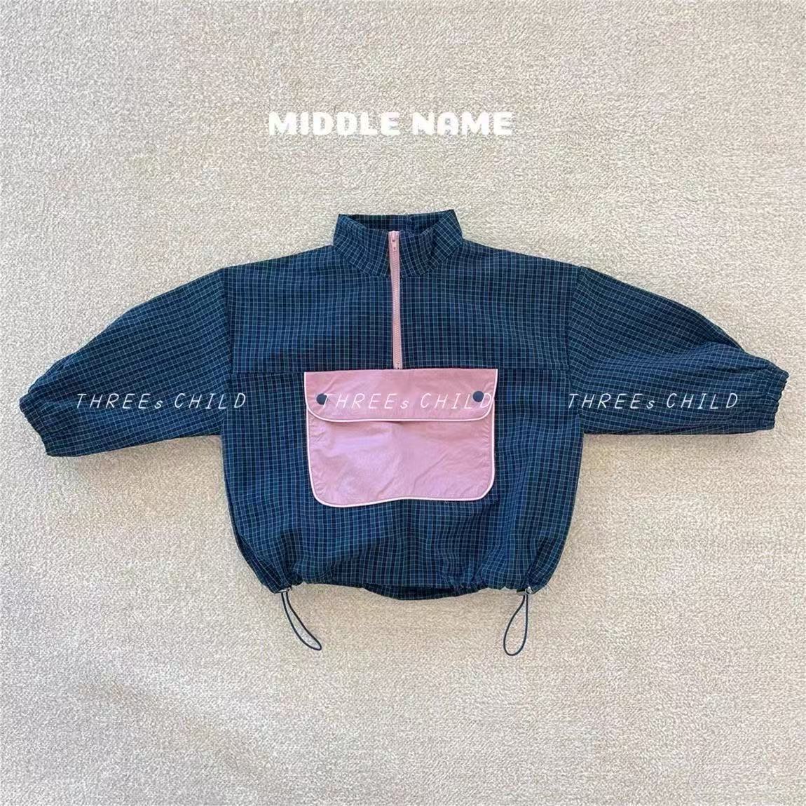 한국 아동복 남성 여성 베이비 아동 봄 대형 포켓 컬러 블록 체크 무늬 풀오버 재킷 코트