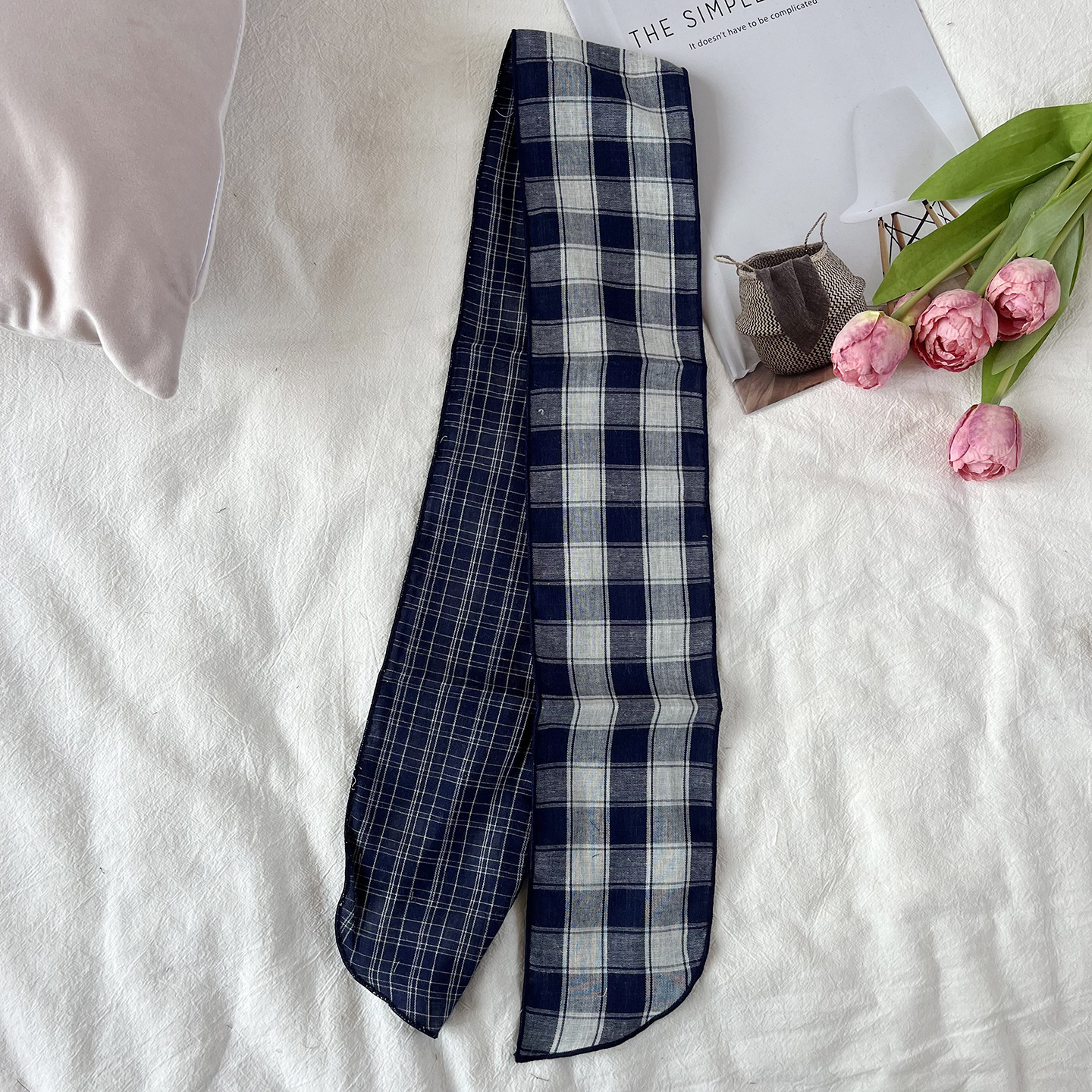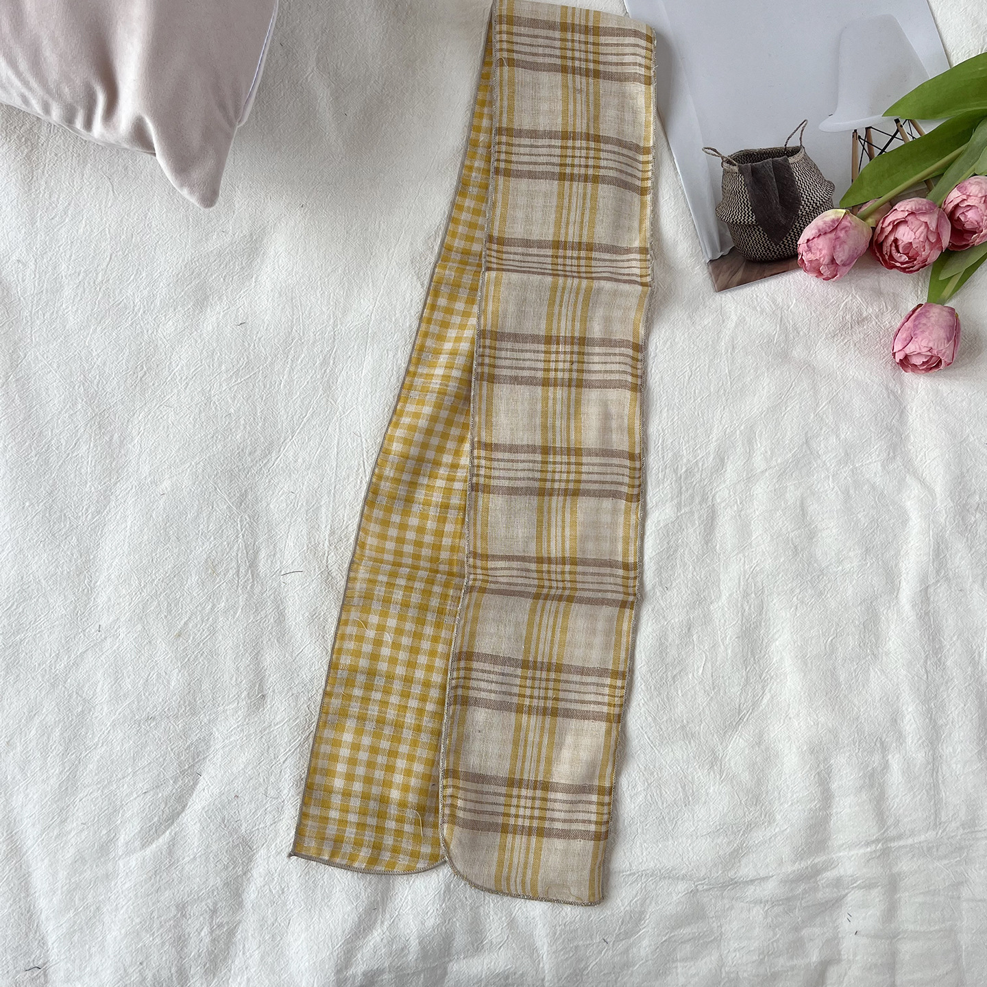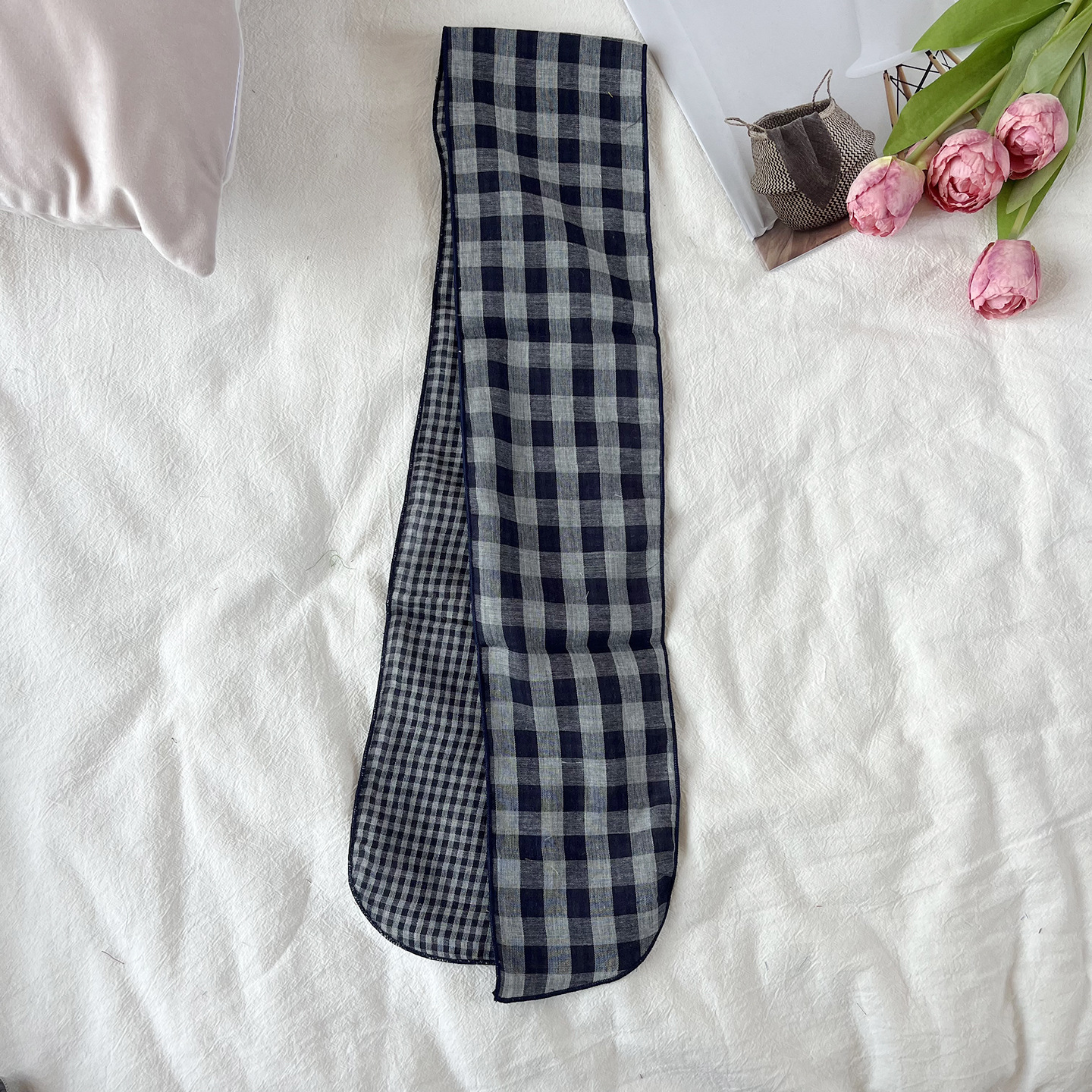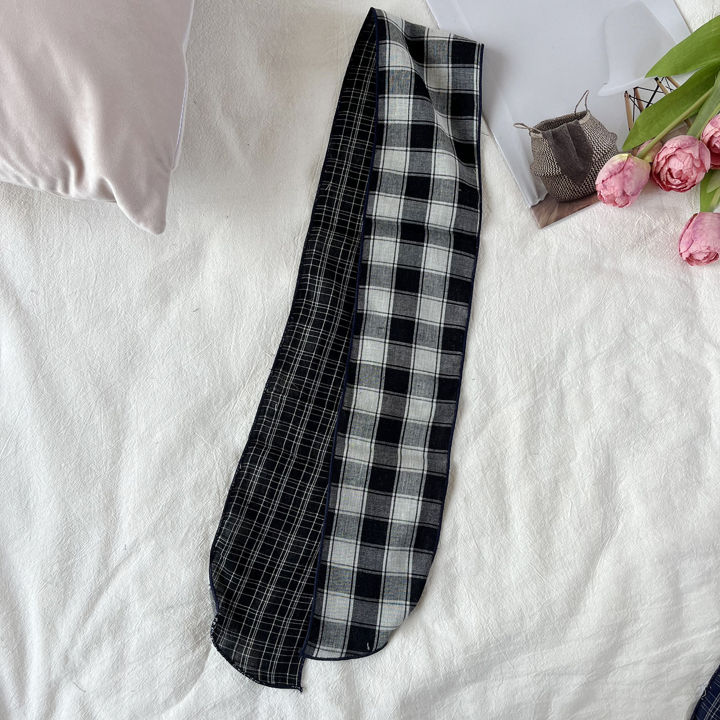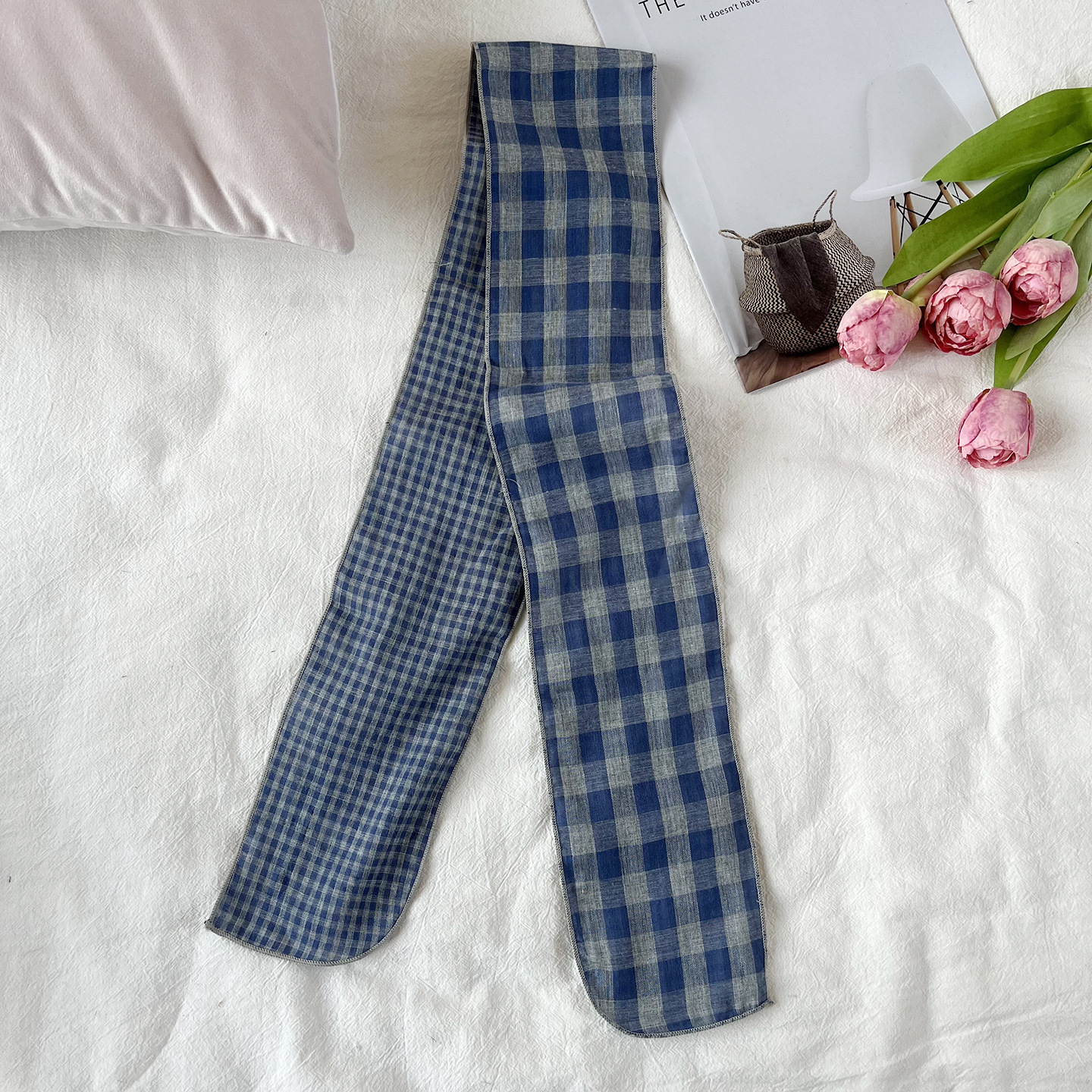 한국 복고풍 순면 양면 격자 무늬 실크 스카프 봄과 가을 얇은 다용도 넥 데코레이션 스카프 틈새 디자인 리본