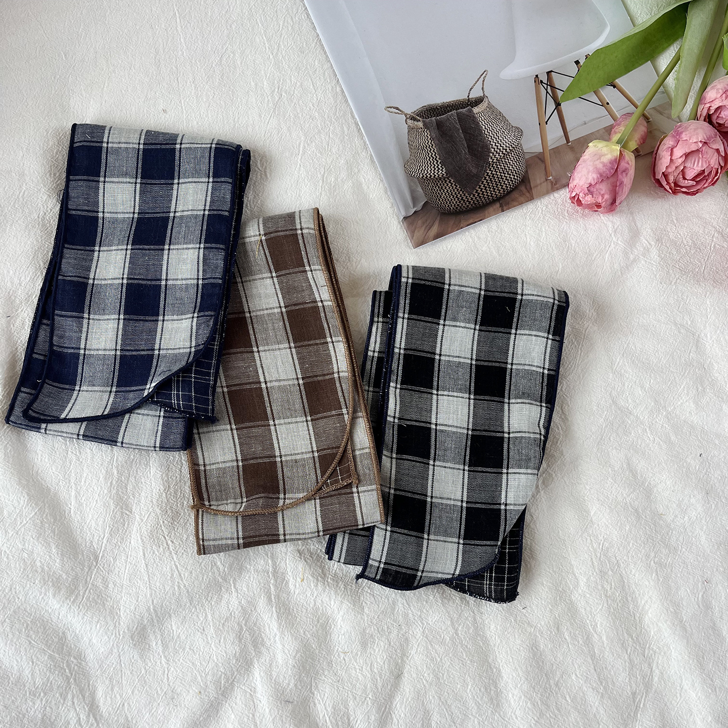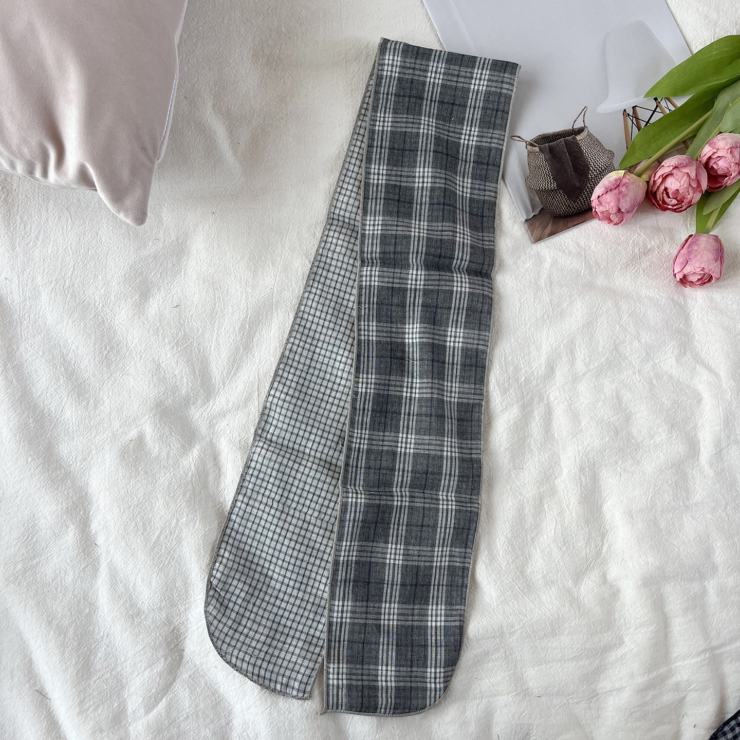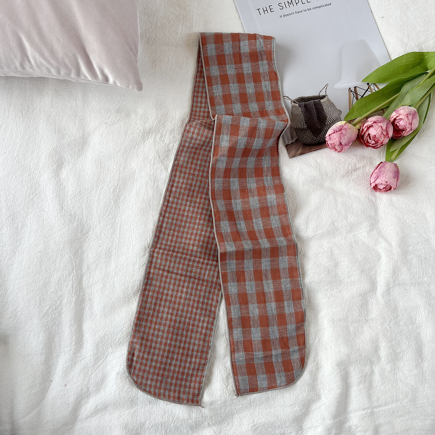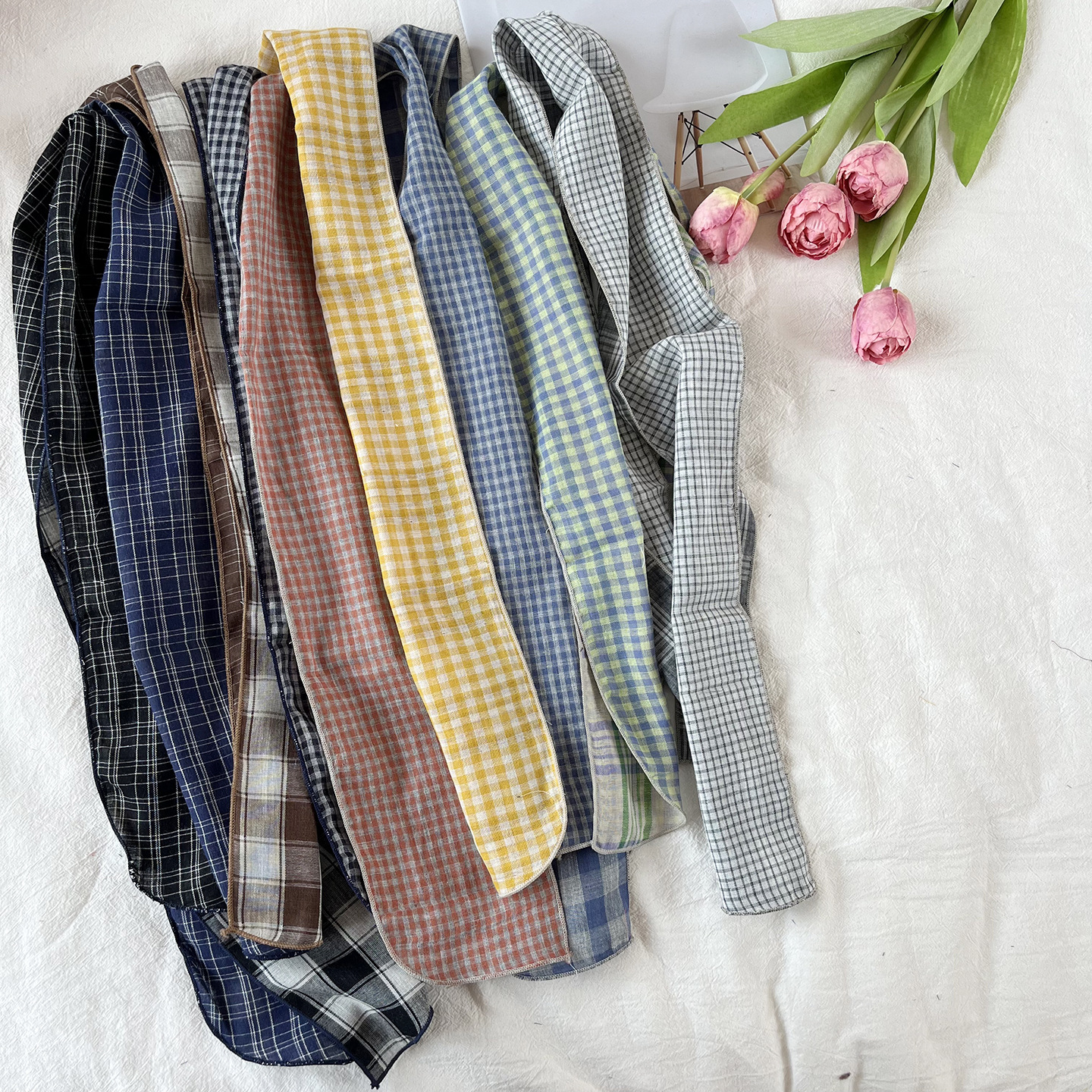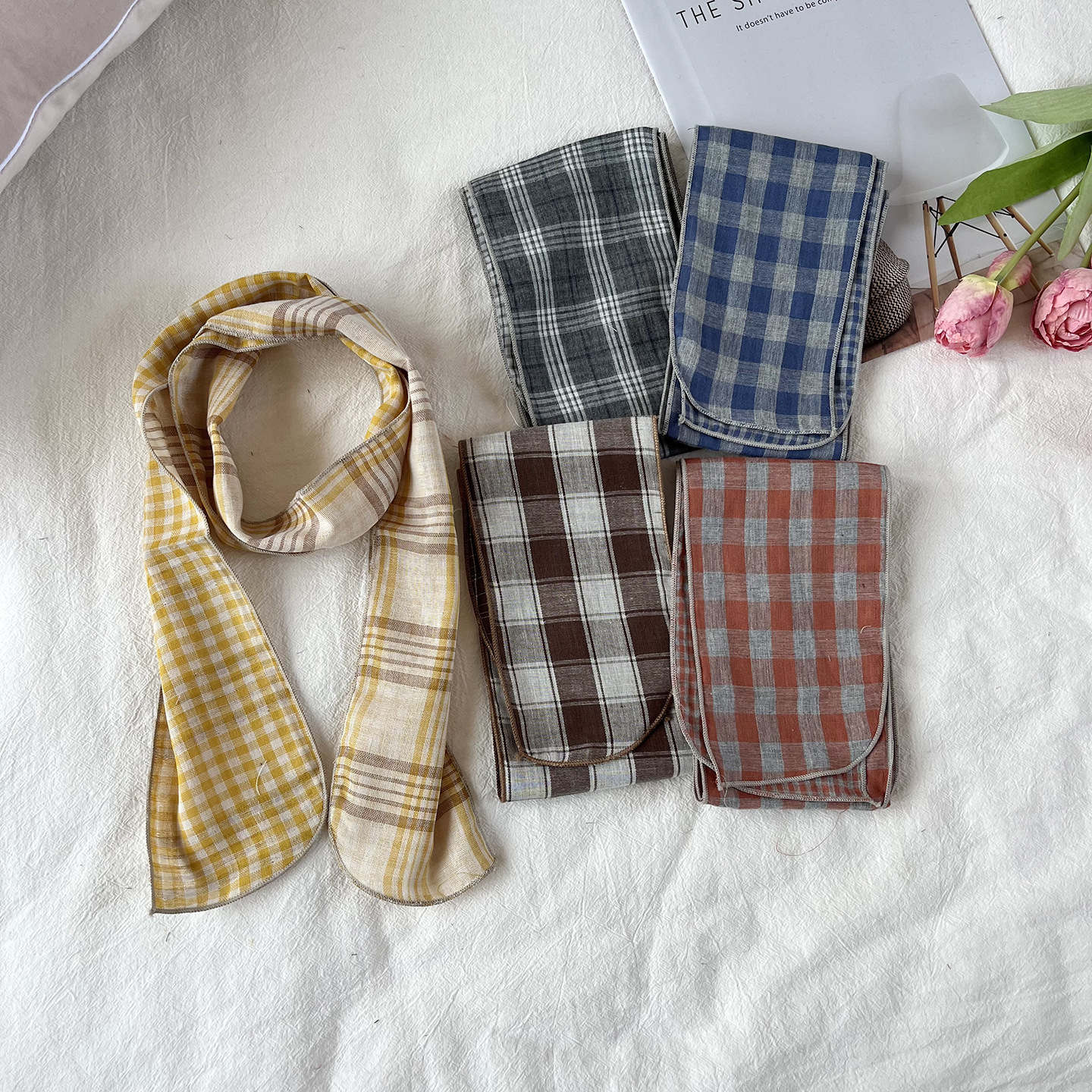 한국 복고풍 순면 양면 격자 무늬 실크 스카프 봄과 가을 얇은 다용도 넥 데코레이션 스카프 틈새 디자인 리본