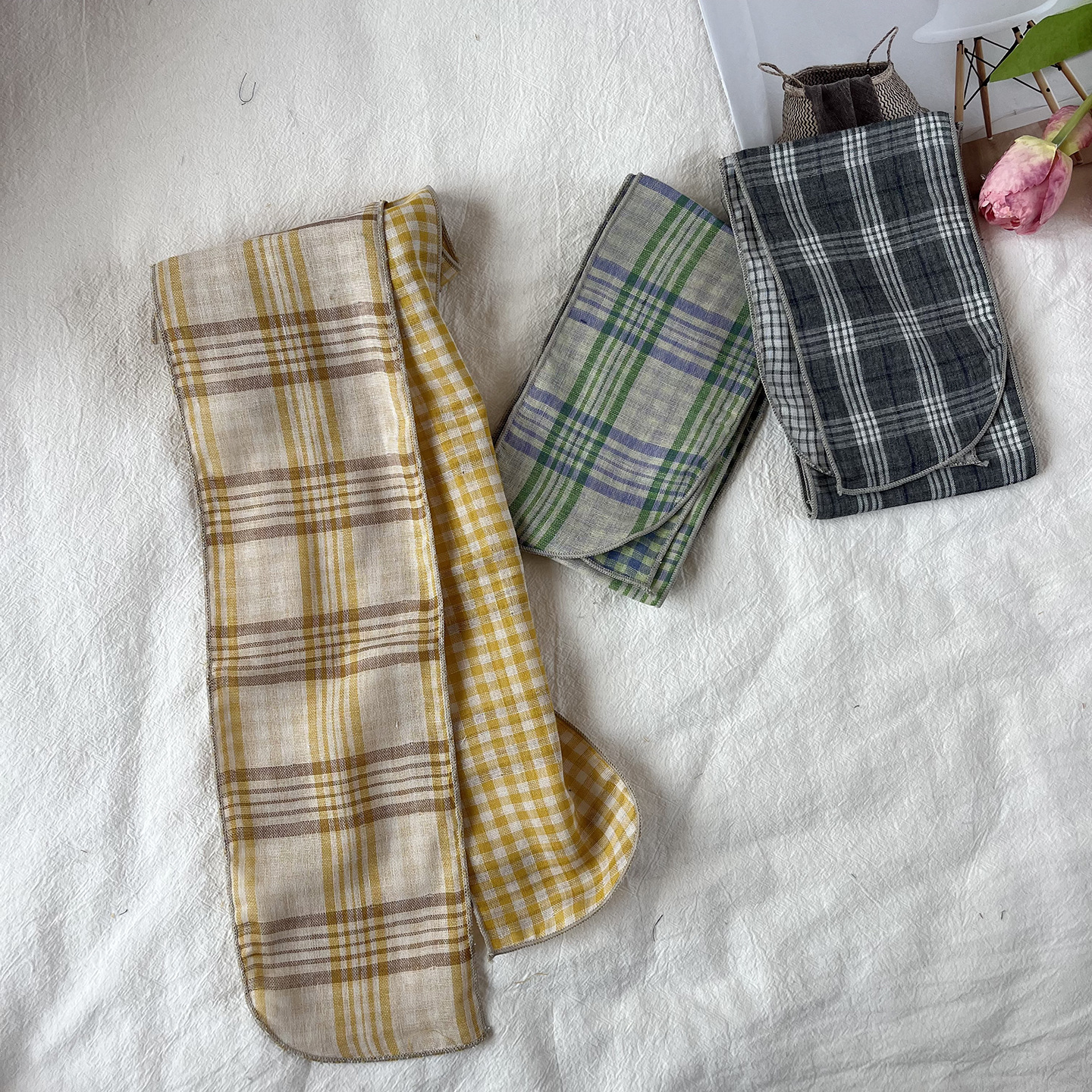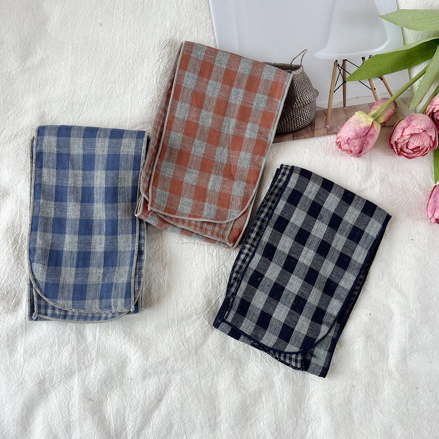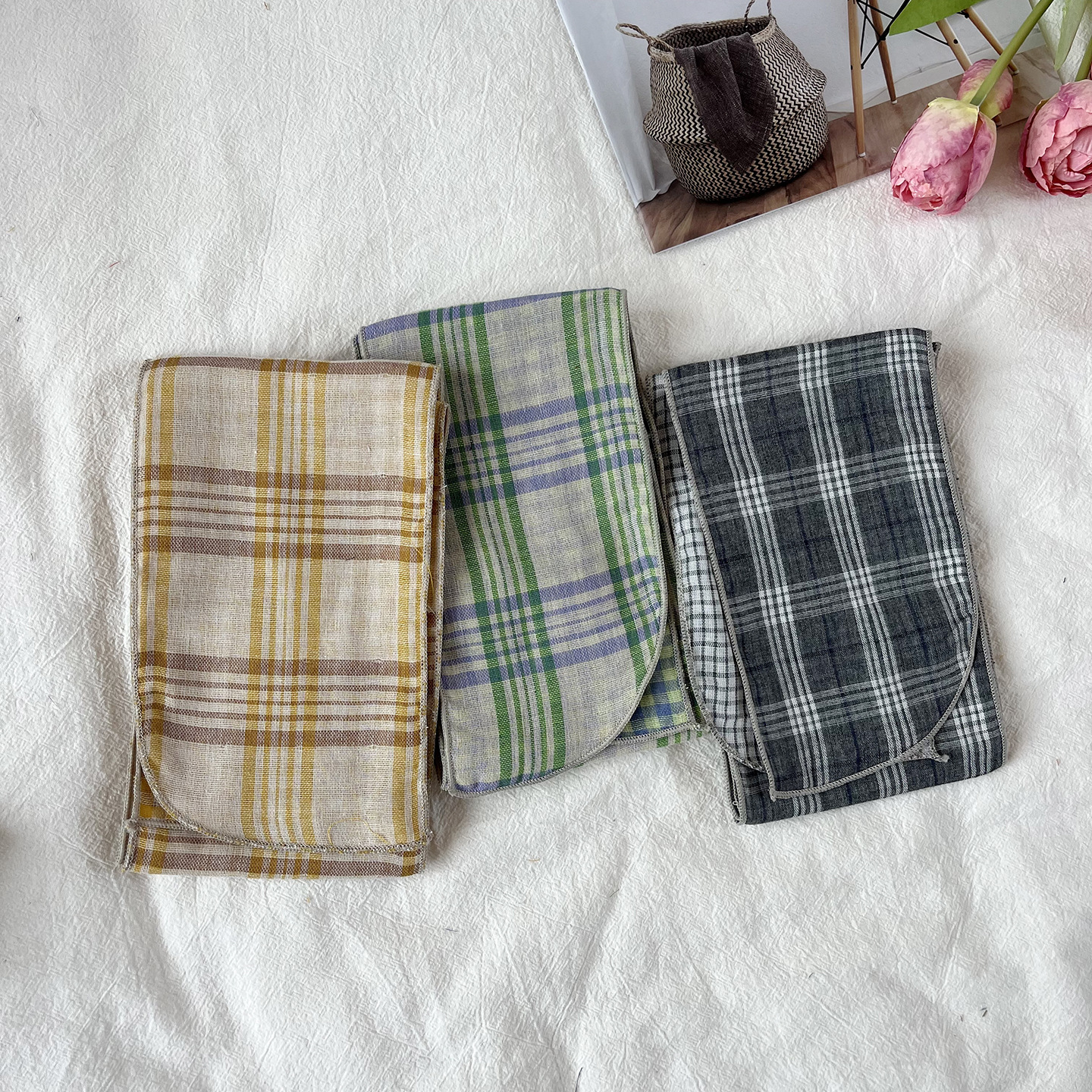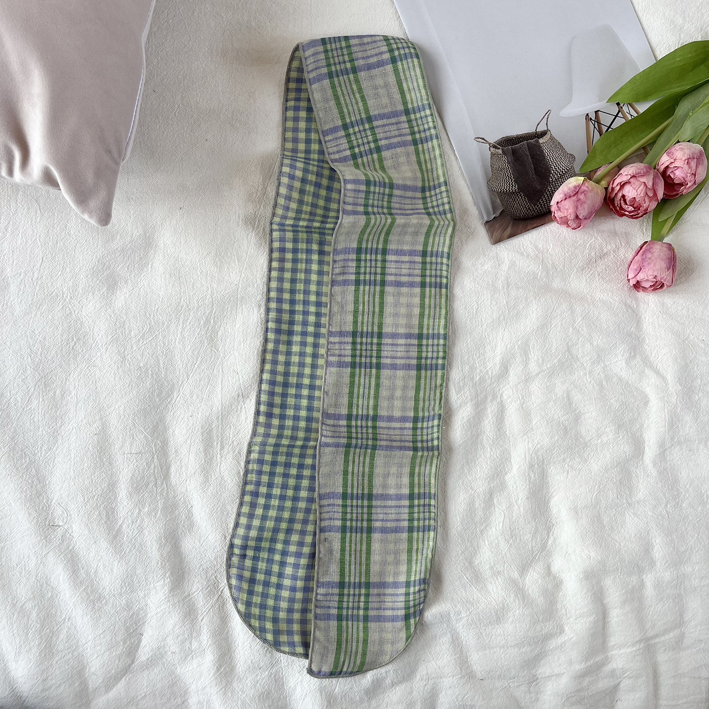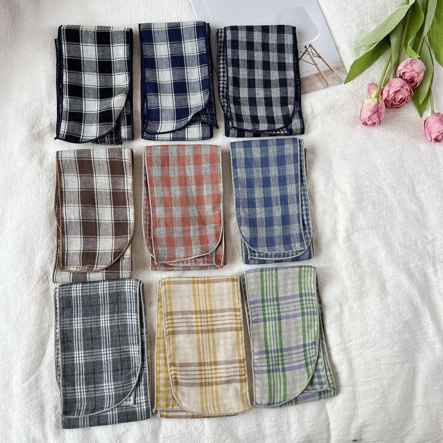 한국 복고풍 순면 양면 격자 무늬 실크 스카프 봄과 가을 얇은 다용도 넥 데코레이션 스카프 틈새 디자인 리본