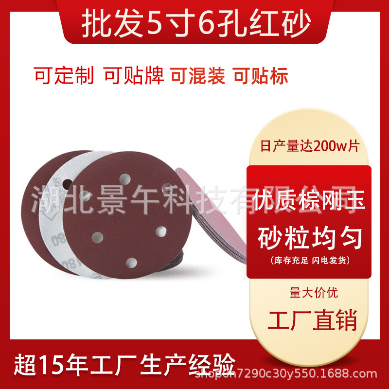 Sharp Red Sand 5인치 6홀 플로킹 사포 시트 자체 접착 알루미늄 산화물 사포 벨벳 사포 연삭 철제 사포스토어 가기