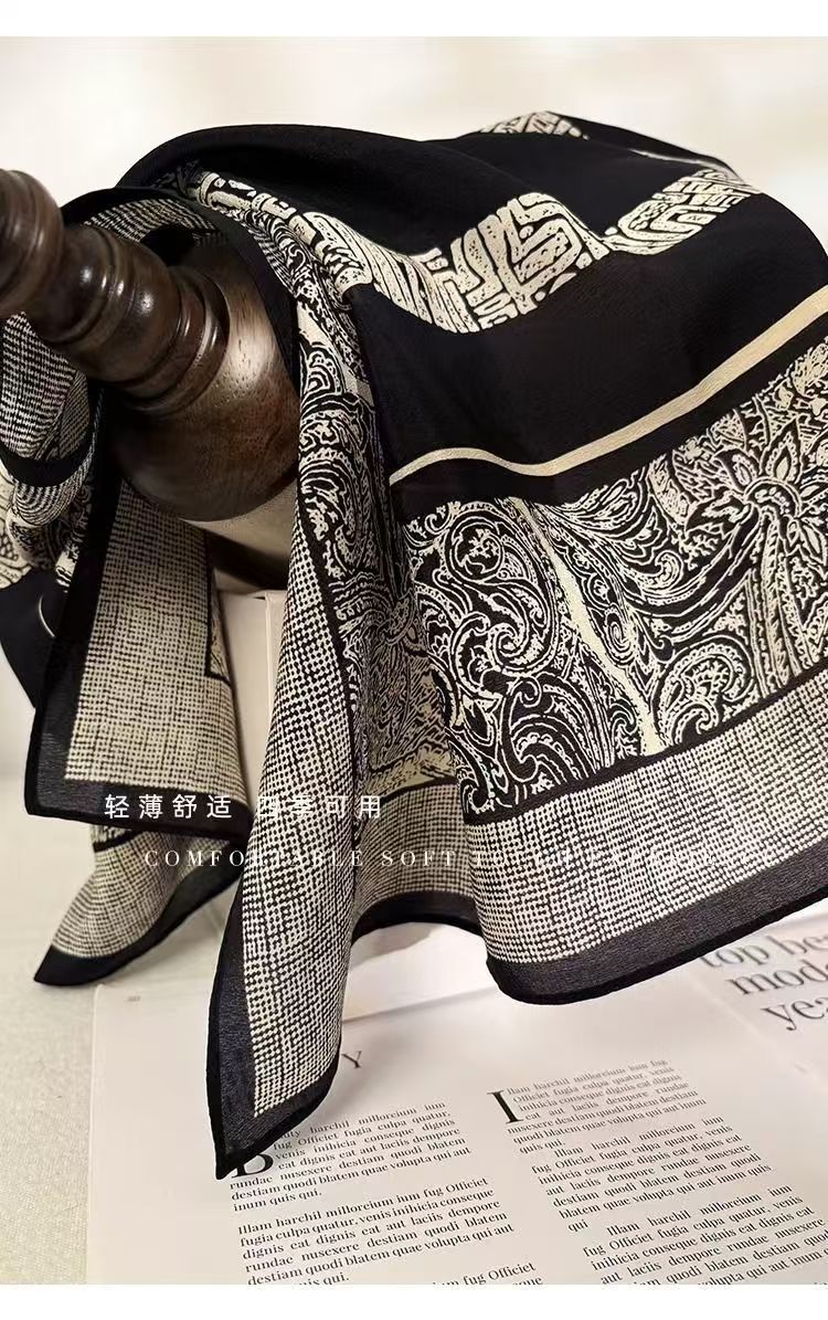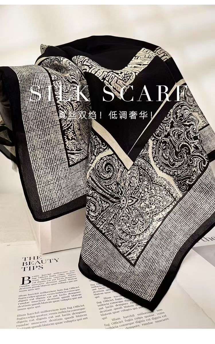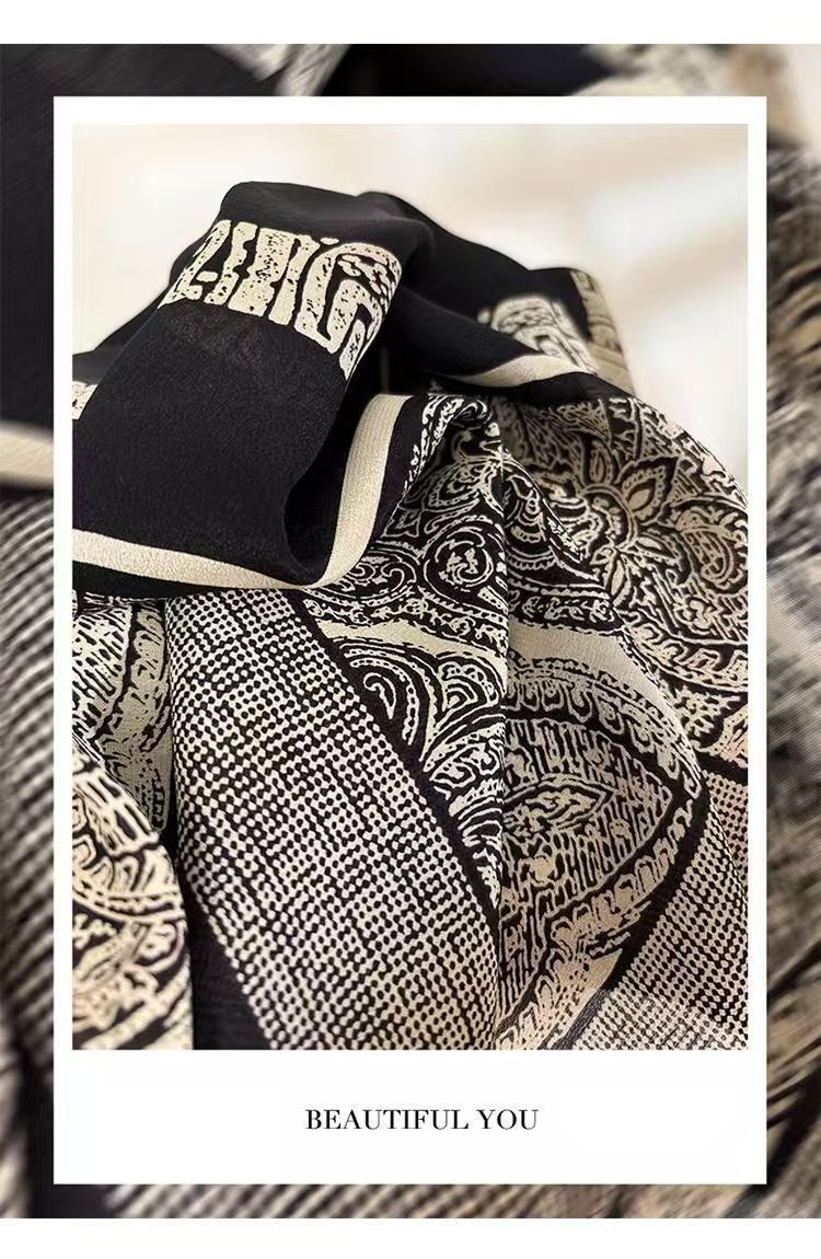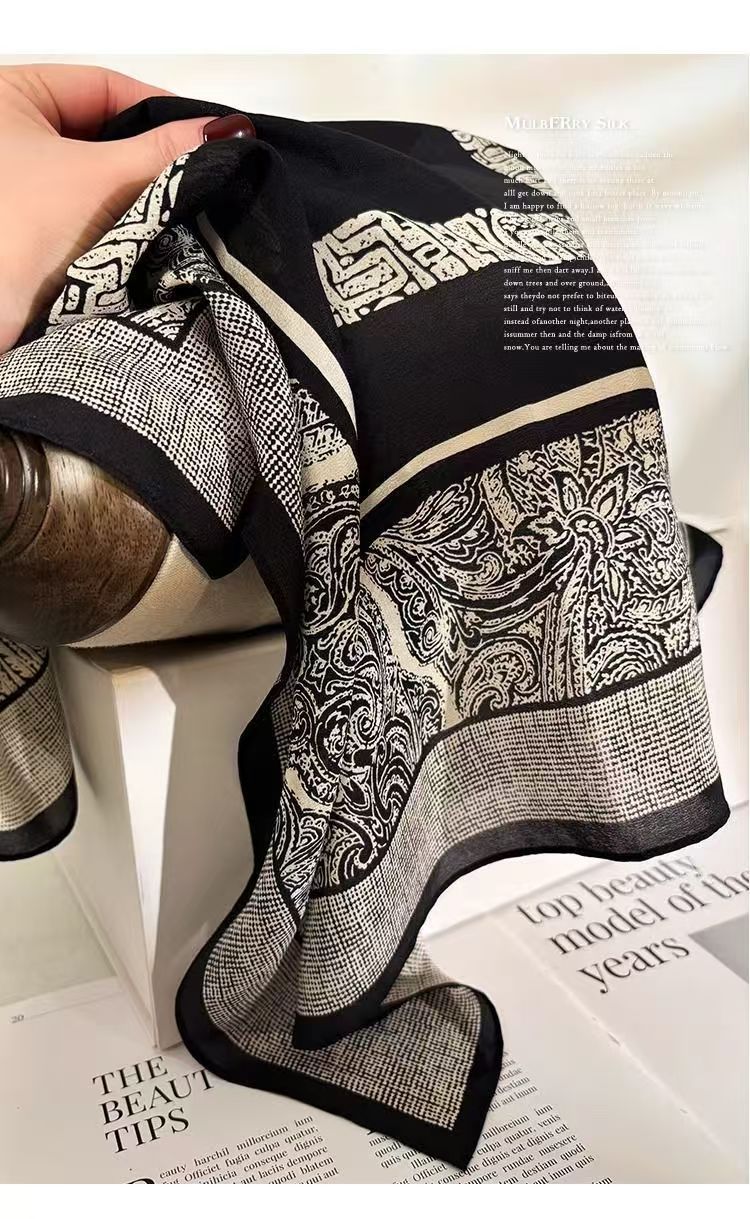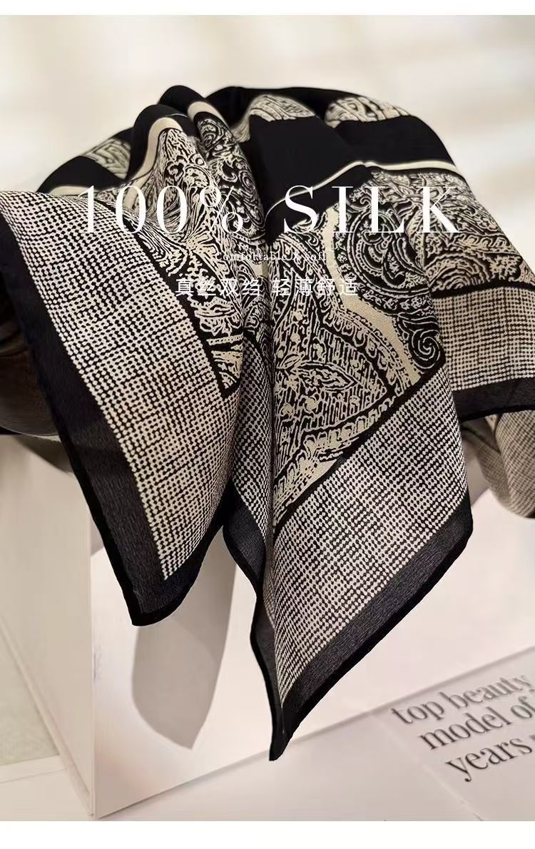 100% 뽕나무 실크 흑백 바로크 65 실크 크레페 드 신 스카프 여성 봄, 여름, 가을 하이 엔드 복고풍 실크 스카프