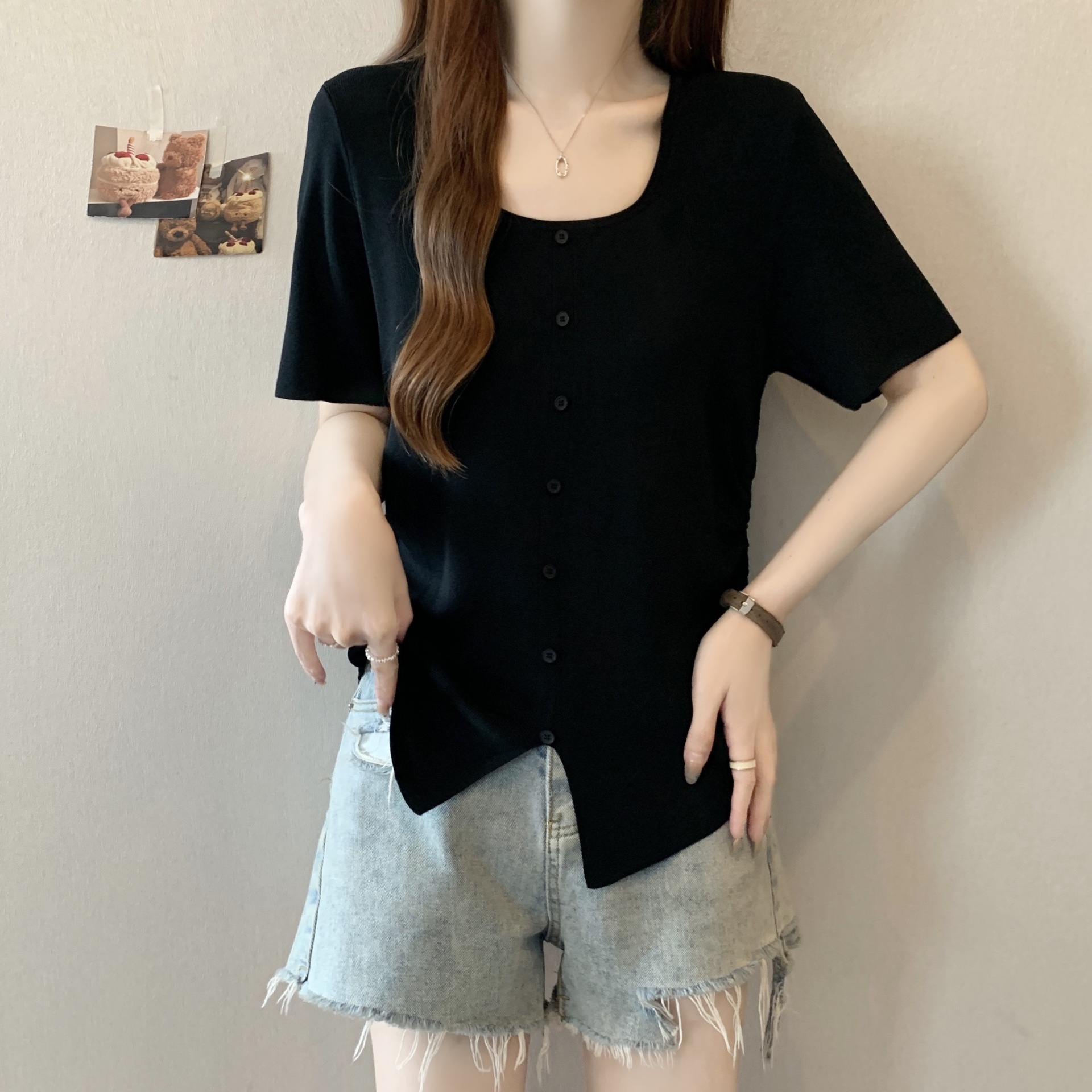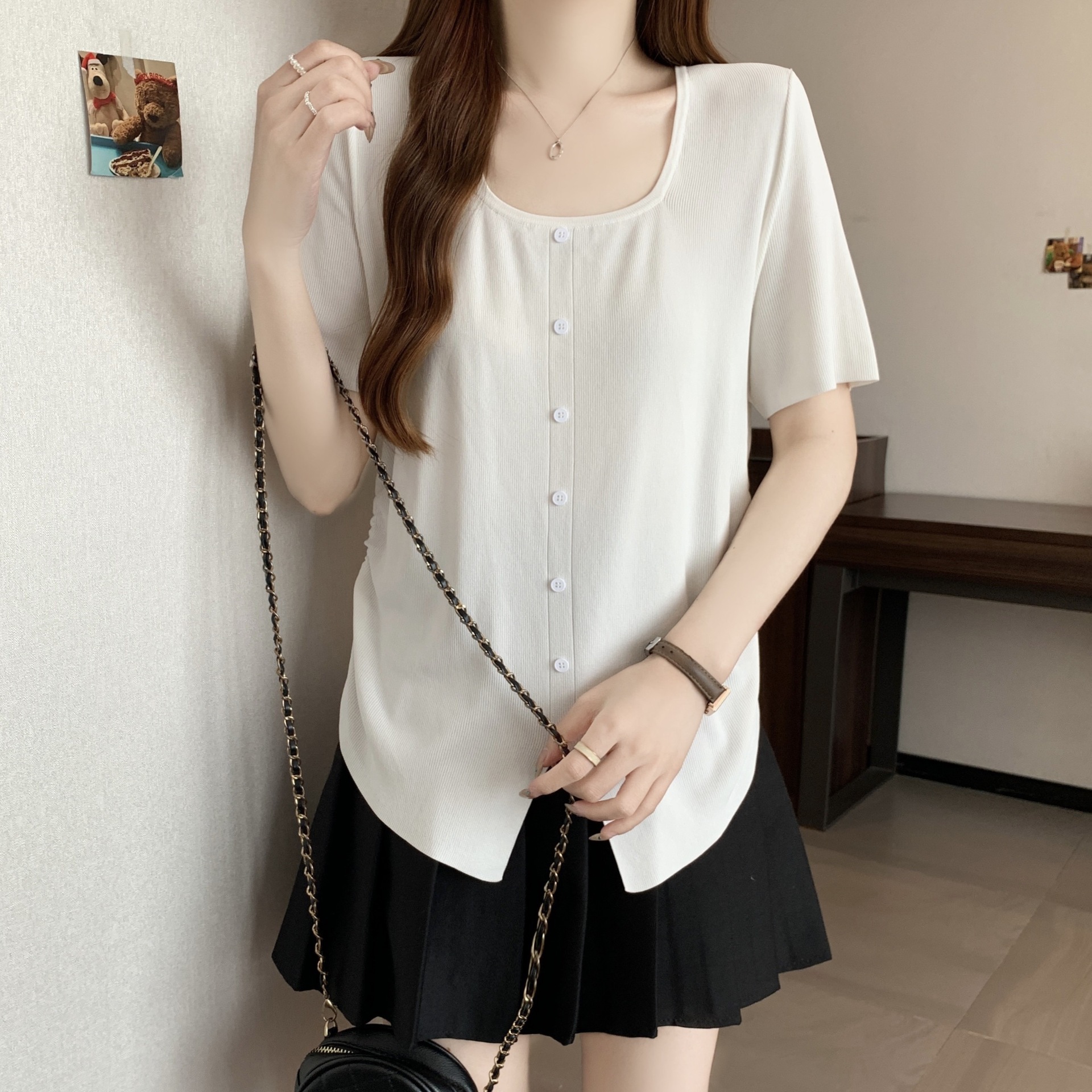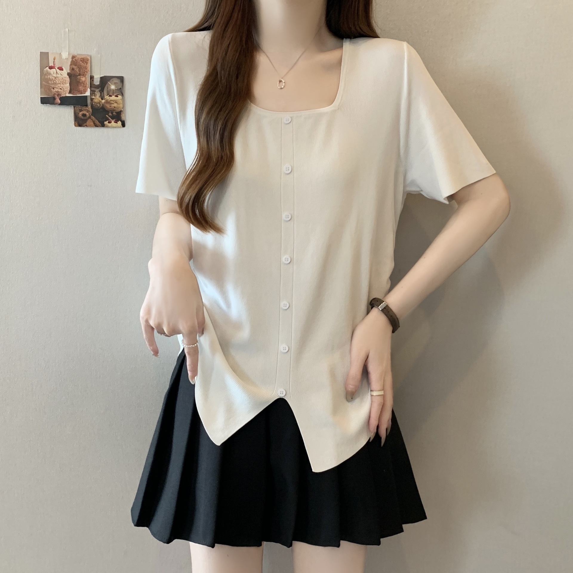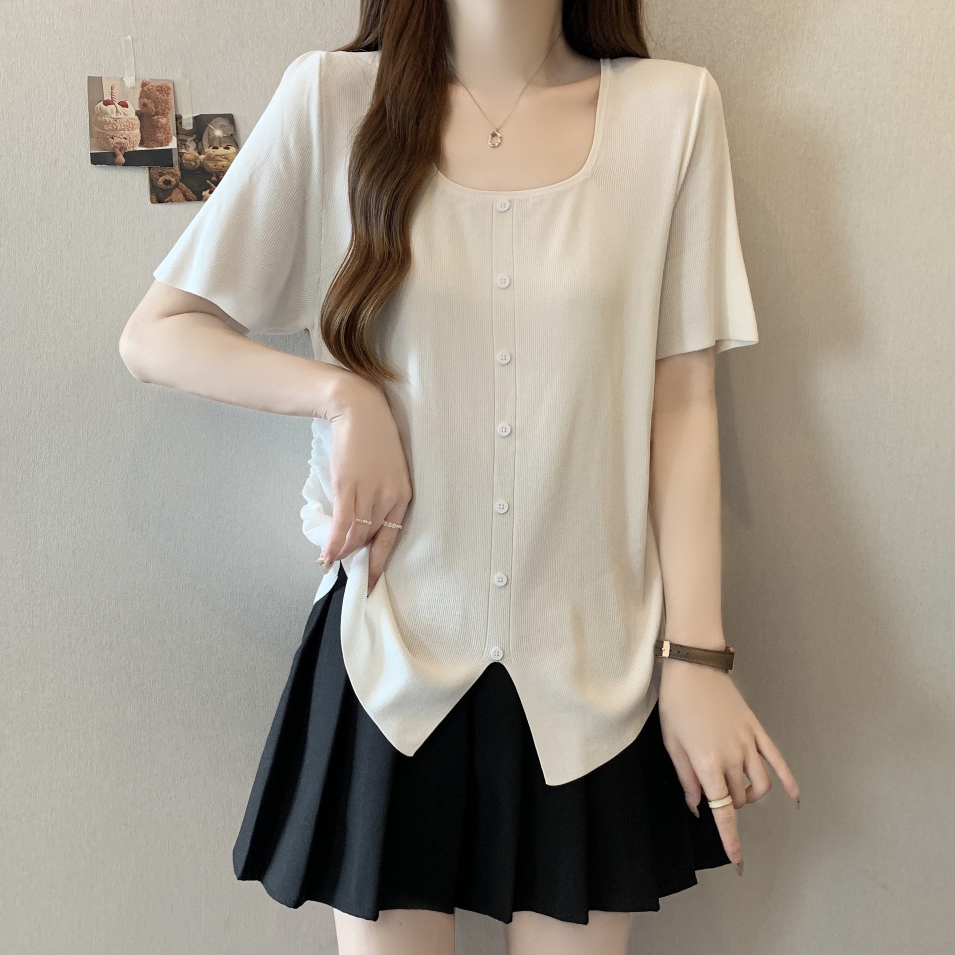 뚱뚱한 여성을위한 여름 얇은 니트 허리 반팔 티셔츠 플러스 사이즈 스퀘어 넥 싱글 브레스트 디자인 루즈 슬리밍 탑 여성용스토어 가기