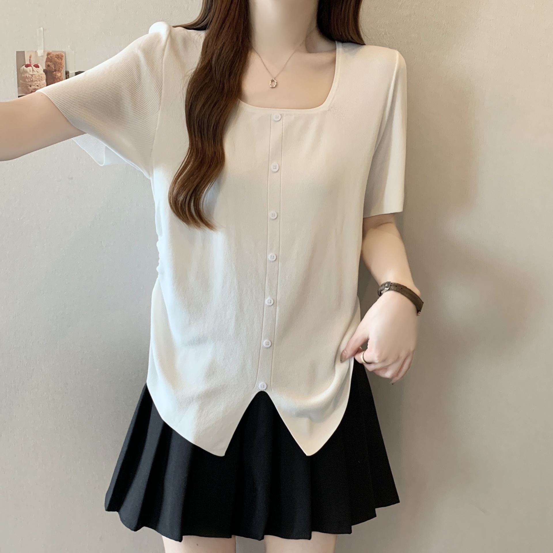 뚱뚱한 여성을위한 여름 얇은 니트 허리 반팔 티셔츠 플러스 사이즈 스퀘어 넥 싱글 브레스트 디자인 루즈 슬리밍 탑 여성용