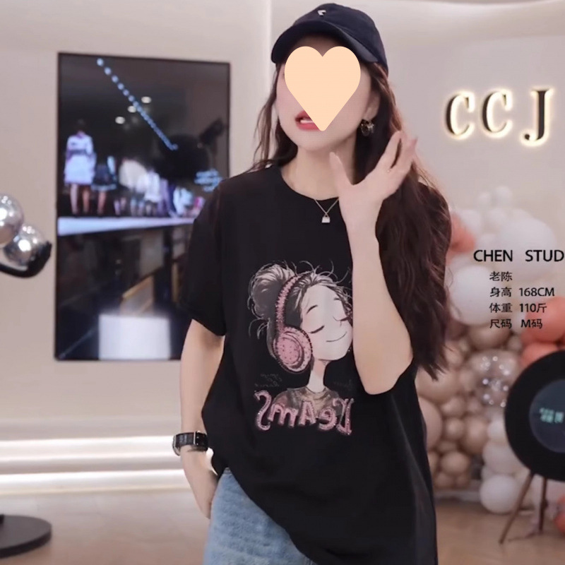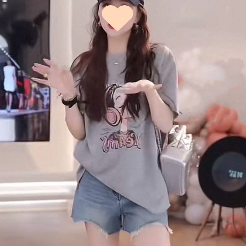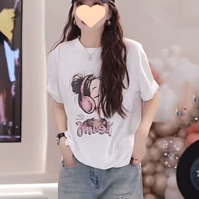여름 새 음악 소녀 프린트 라운드 넥 루즈 바닥 셔츠 남성과 여성을위한 뒷 스트랩 레이스 스플 라이스 반팔 셔츠스토어 가기