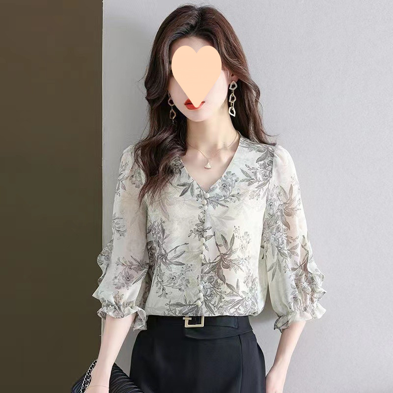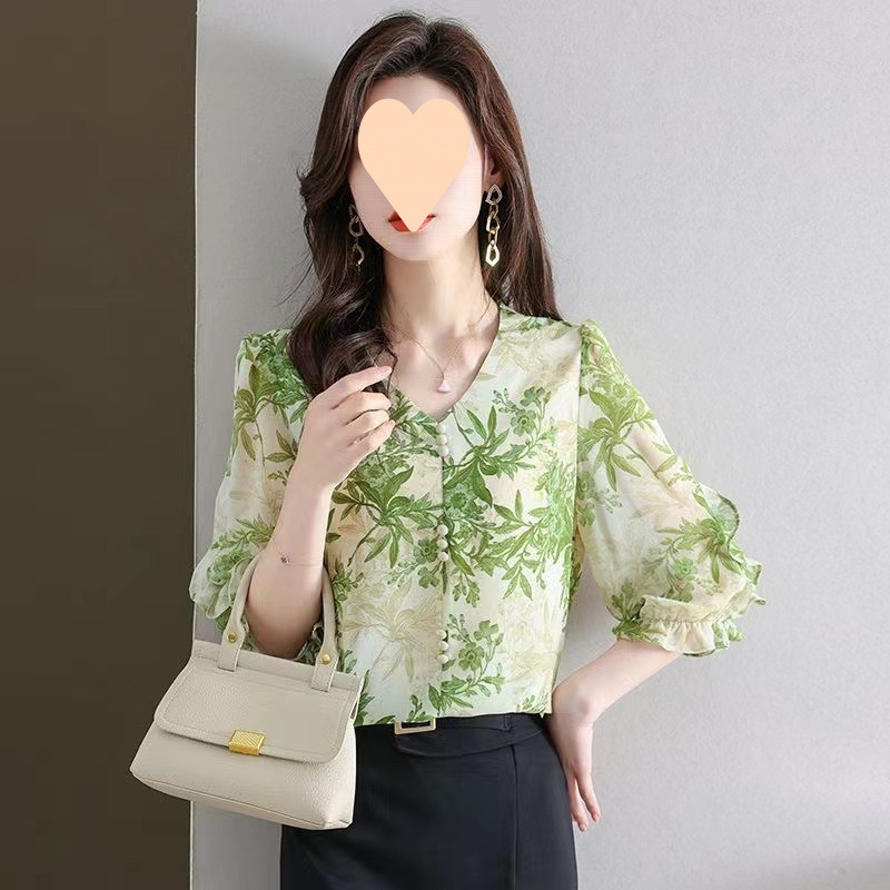 여성을위한 하이 엔드 패션 칼라 쉬폰 셔츠 2025 여름 새로운 기질 셔츠 퍼프 슬리브 느슨한 7 점 소매 탑