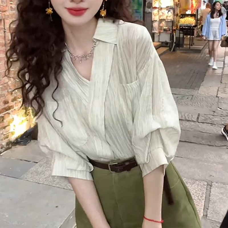 여성을위한 프렌치 라이트 그린 v 넥 반팔 쉬폰 셔츠 2025 뉴 여름 셔츠 하이 엔드 퍼프 슬리브 탑스토어 가기