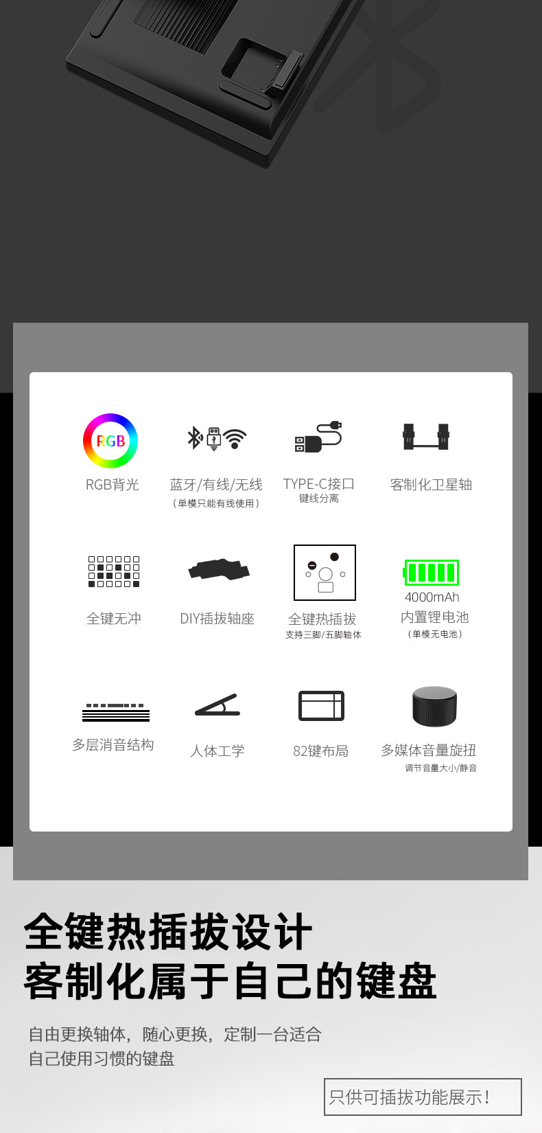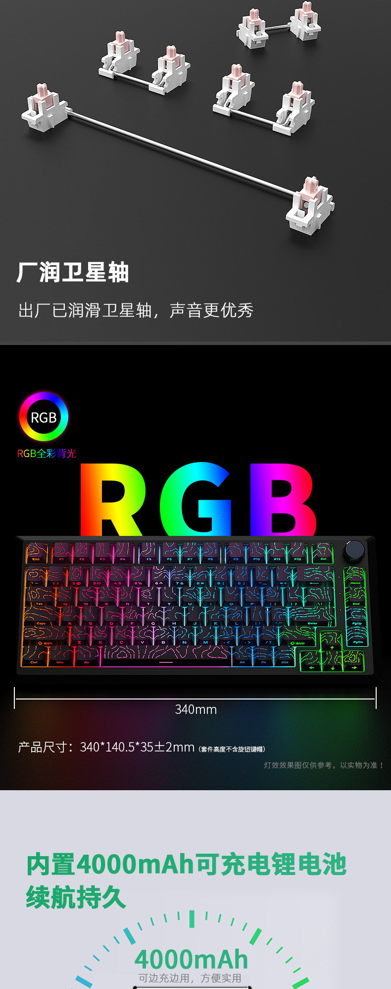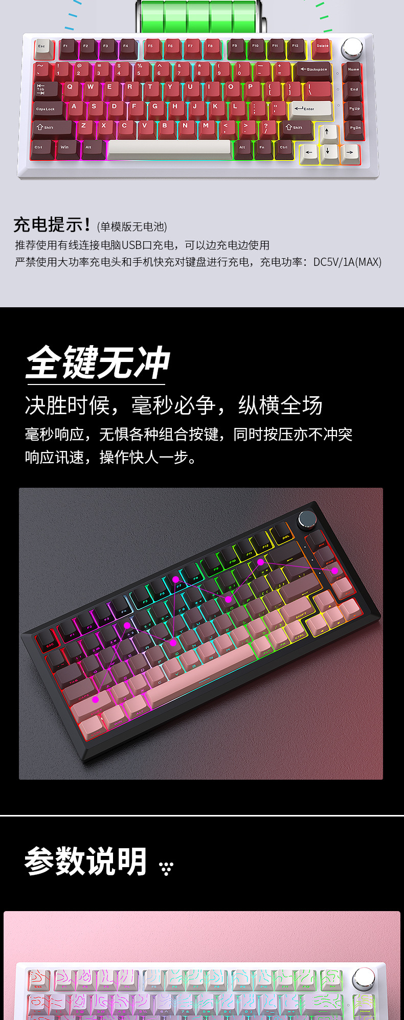 温馨提示:请只用键盘原配充电线连接电脑充电,勿连接手机充电器、充电宝或是其它快充设备充电,以免损坏键盘!此操作不在保修范围内。如果紧急情况下只能用充电器,请务必且只能用5V 1A充电器充电。