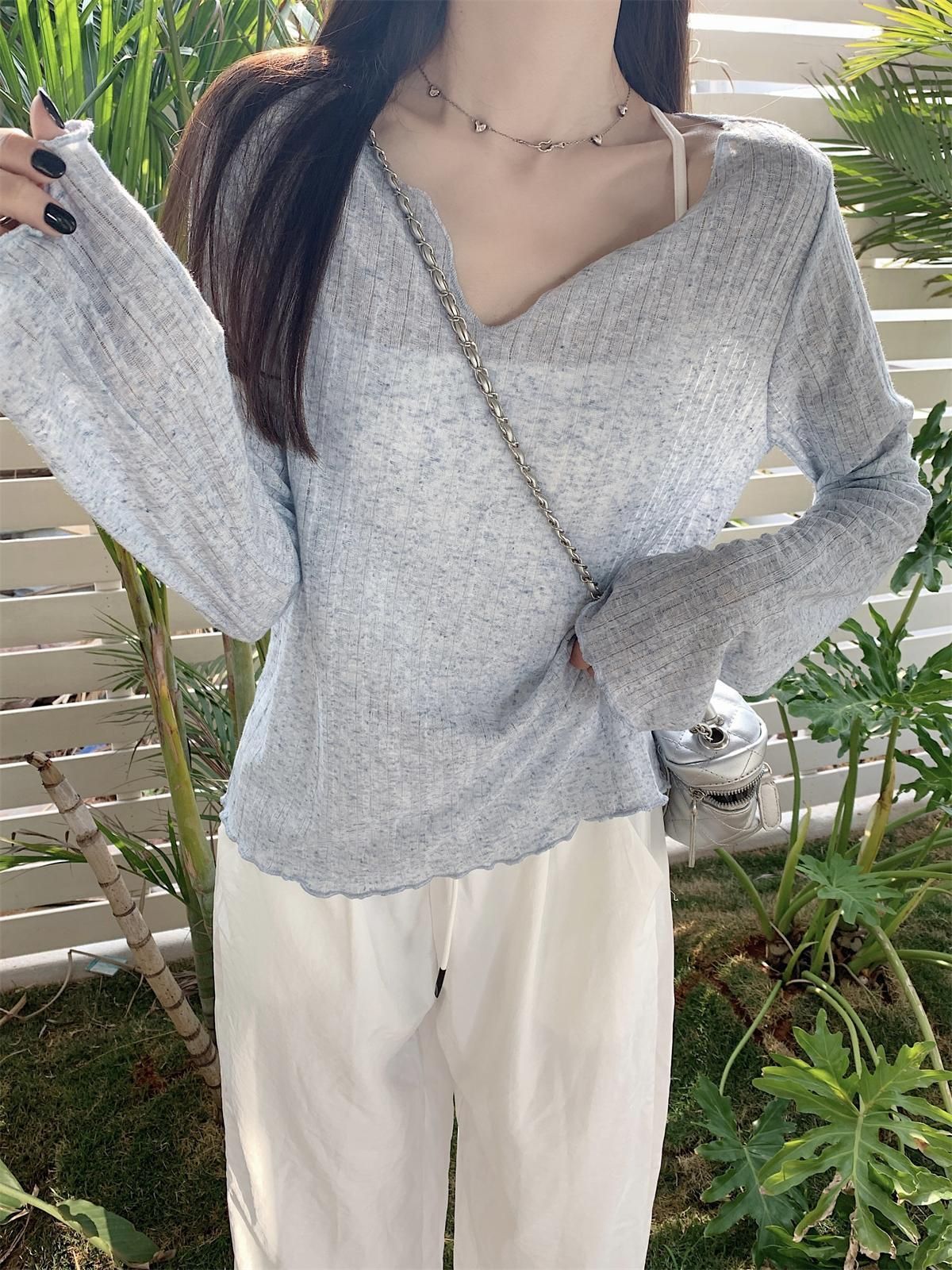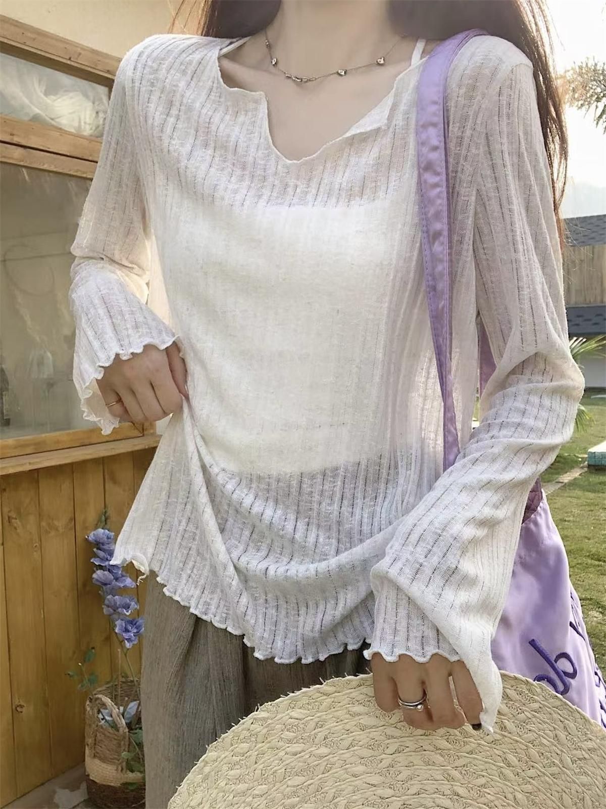 여성을 위한 편안하고 살짝 비치는 자외선 차단 블라우스 2025 여름 가볍고 얇은 긴팔 티셔츠 귀를 뽑아낸 루즈한 바닥 탑