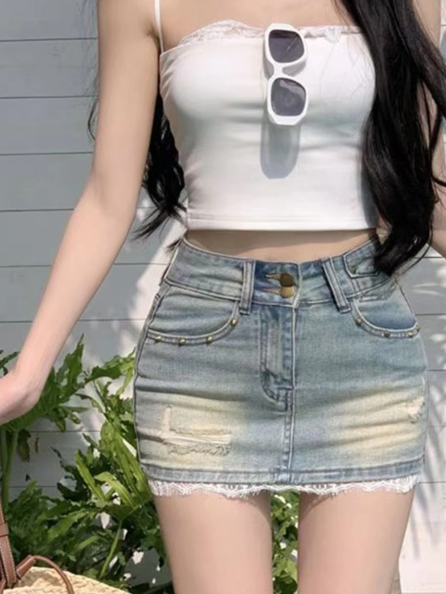 여성용 러플 데님 스커트, 여름 하이웨이스트 케이크 스커트, 슬리밍 힙 커버, A라인, 몸집이 작은 핫걸, 초짧은 피쉬테일 스커트