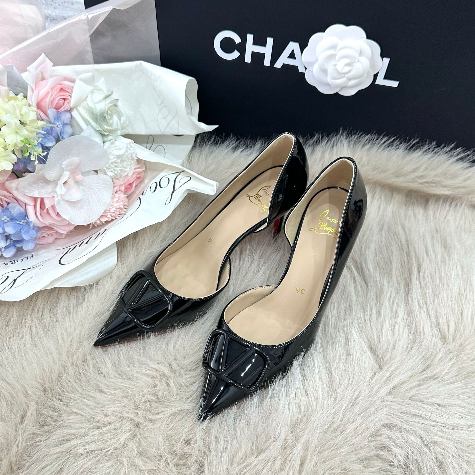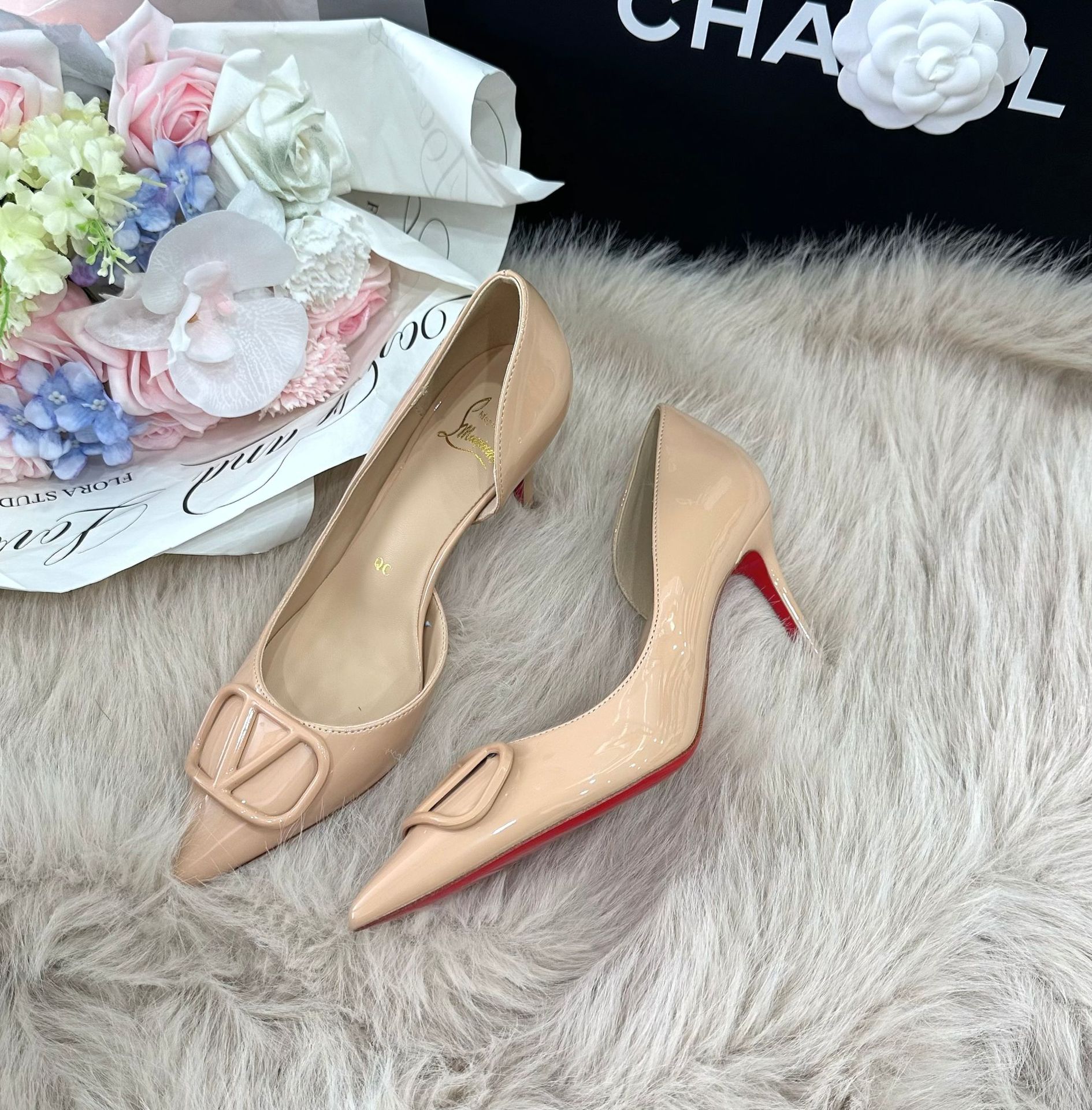 25C1 여성을위한 V 버클 하이힐 가을, 여름, 겨울 새로운 스타일 프렌치 레드 바닥 뾰족한 틈새 섹시 사이드 빈 여성 신발스토어 가기