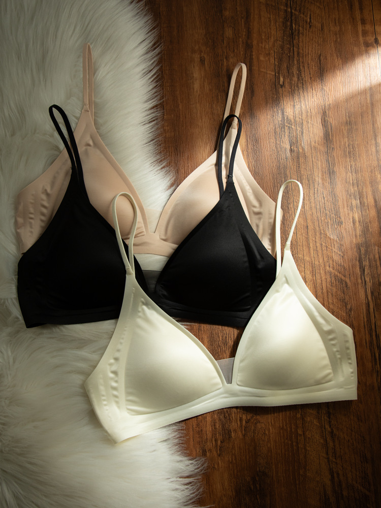 공장 직접 판매 밀크 새틴 프렌치 딥 브이넥 속옷 여성용 스파게티 스트랩 심리스 트라이앵글 컵 작은 가슴 와이어 프리 브라스토어 가기