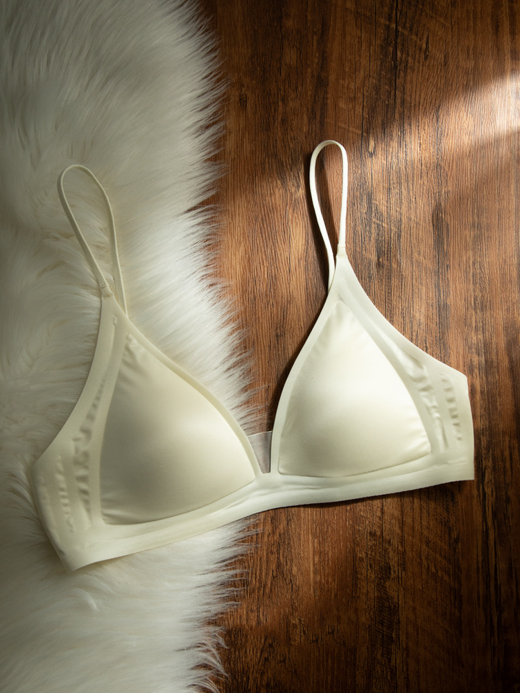 공장 직접 판매 밀크 새틴 프렌치 딥 브이넥 속옷 여성용 스파게티 스트랩 심리스 트라이앵글 컵 작은 가슴 와이어 프리 브라