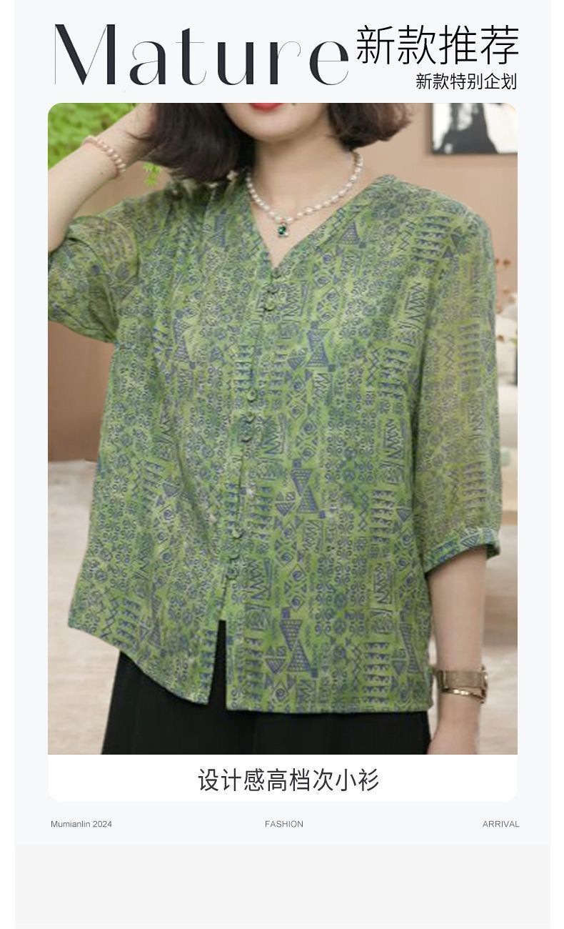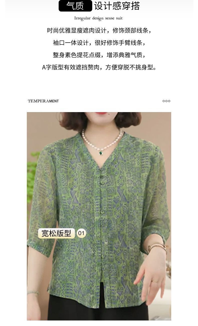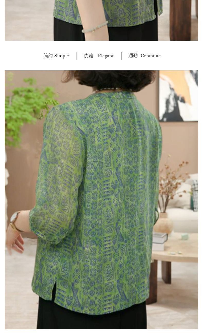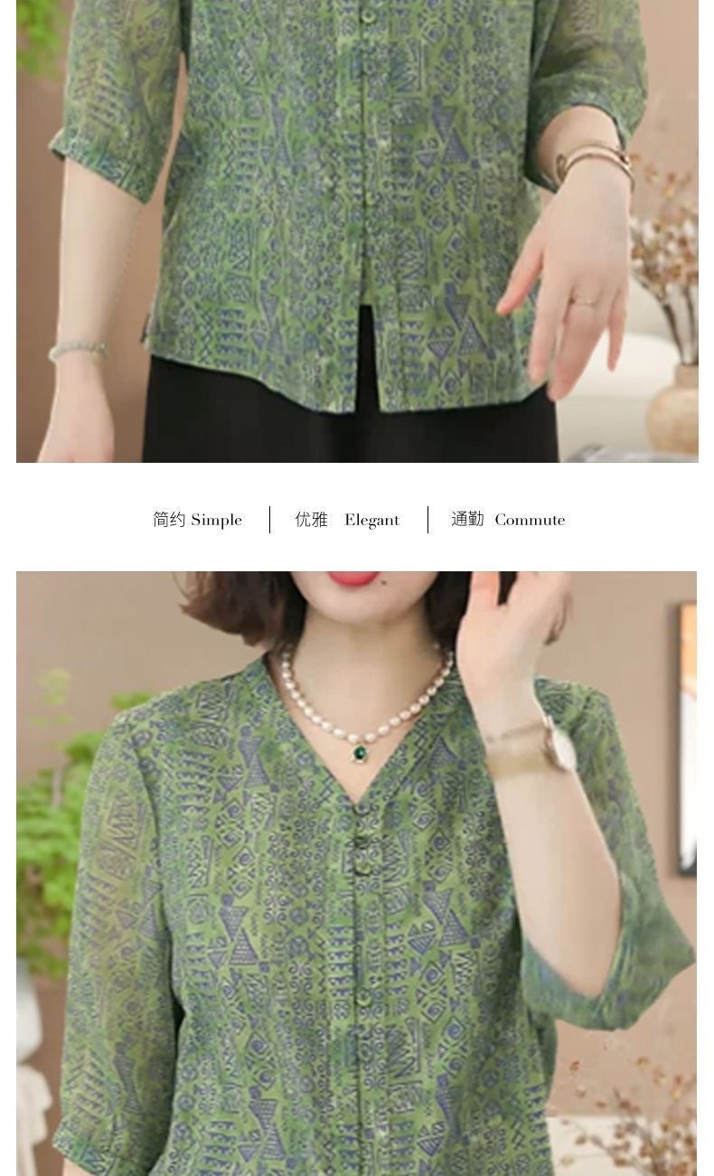여름 신상 7부소매 프린트 셔츠, 여성용 미드슬리브 셔츠, 엄마복, 플러스 사이즈 여성용 슬리밍 쉬폰 셔츠스토어 가기