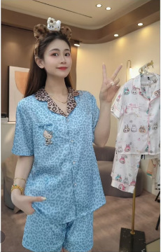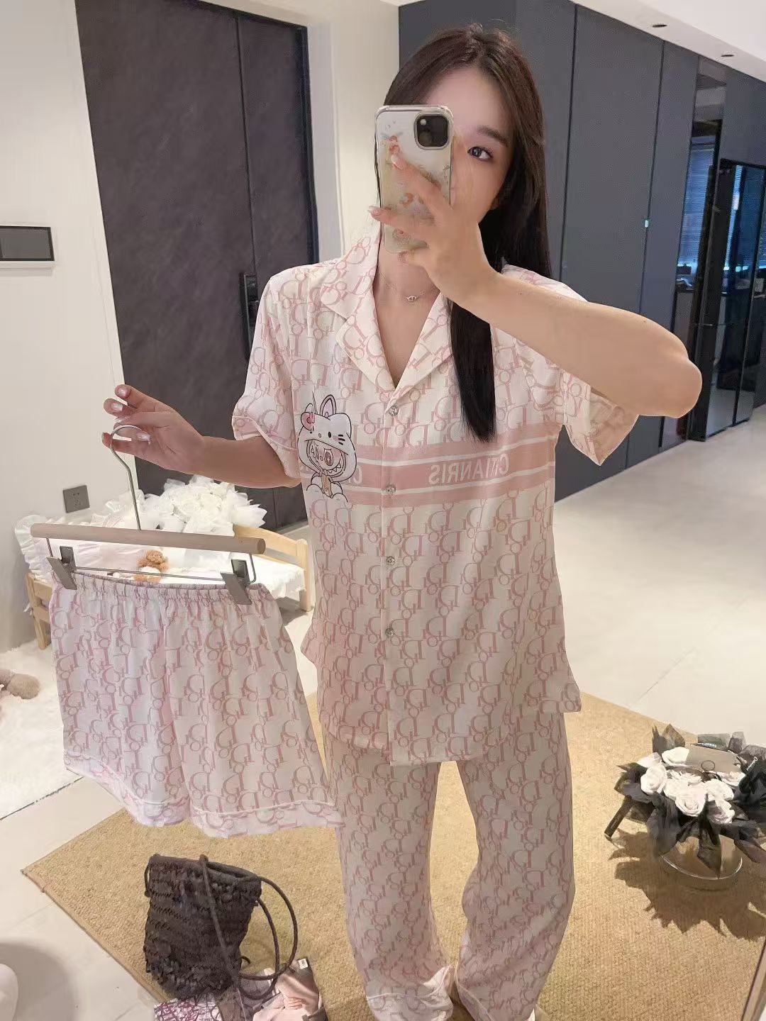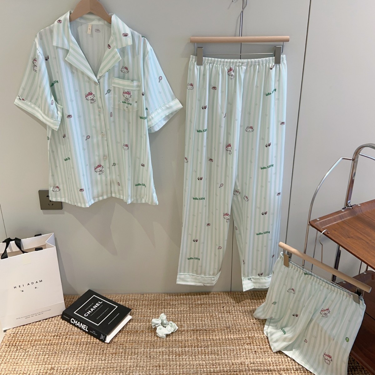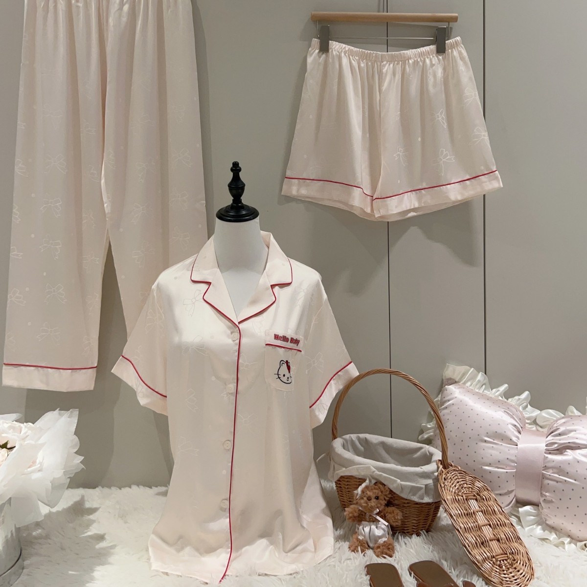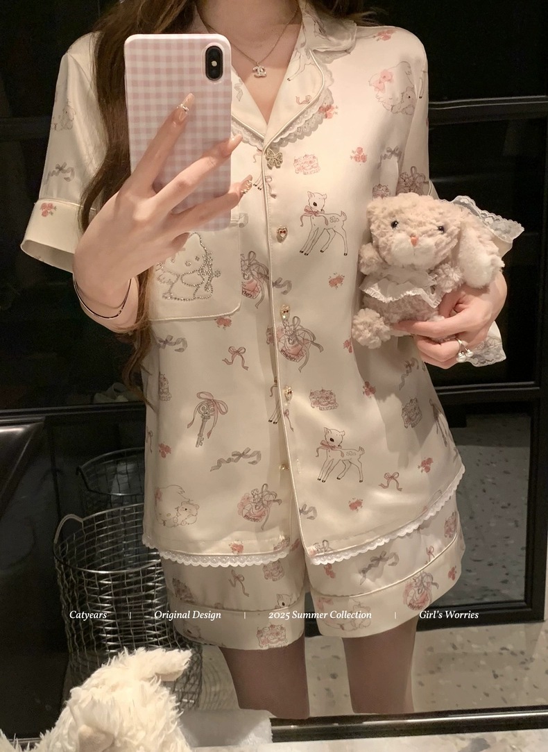 여성용 잠옷 여름 얇은 긴팔 바지 얼음 실크 2025 새로운 기능 스타일 KT 고양이 3 피스 홈웨어 세트스토어 가기