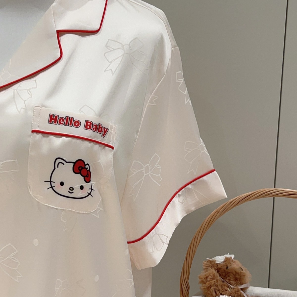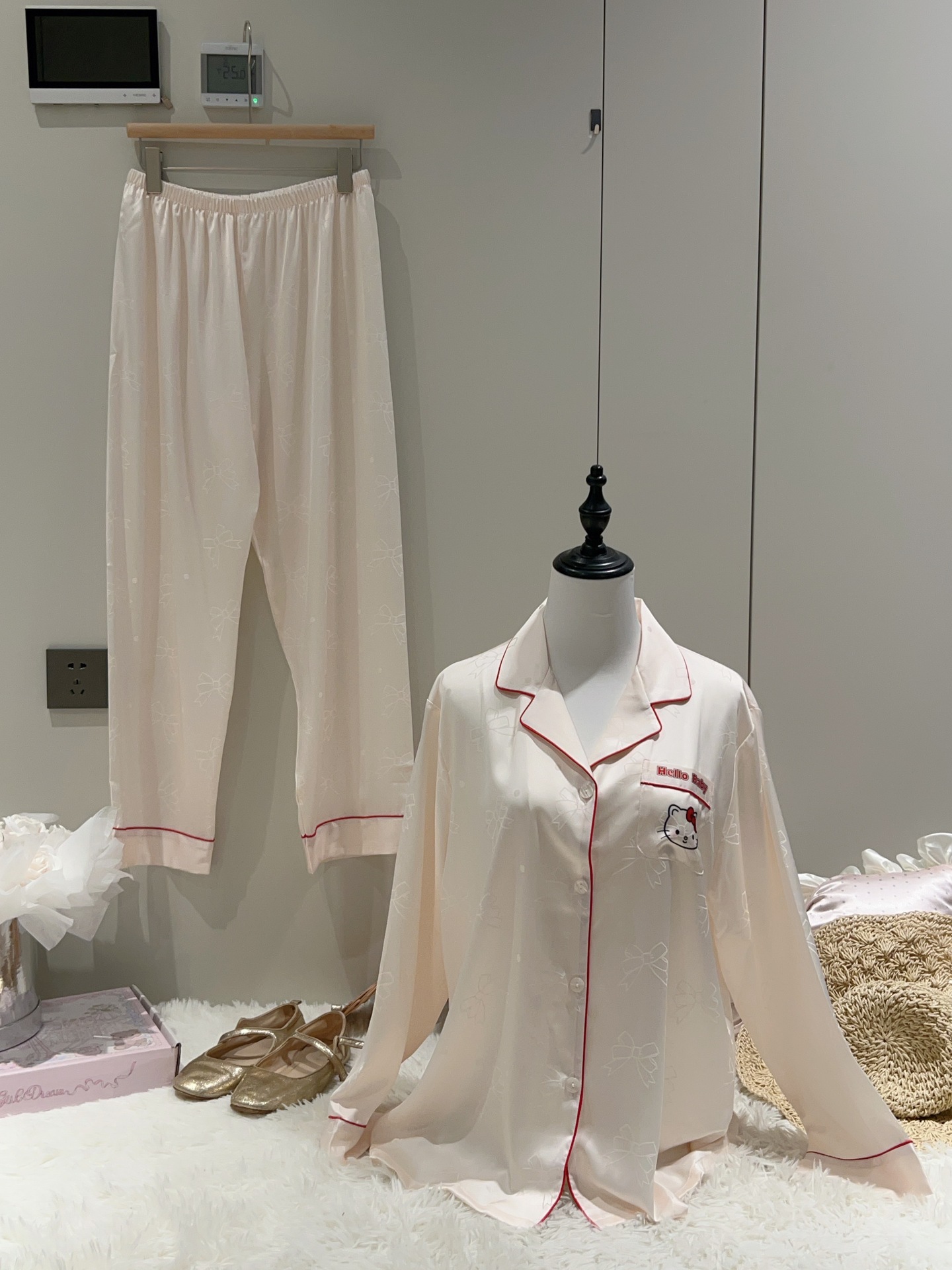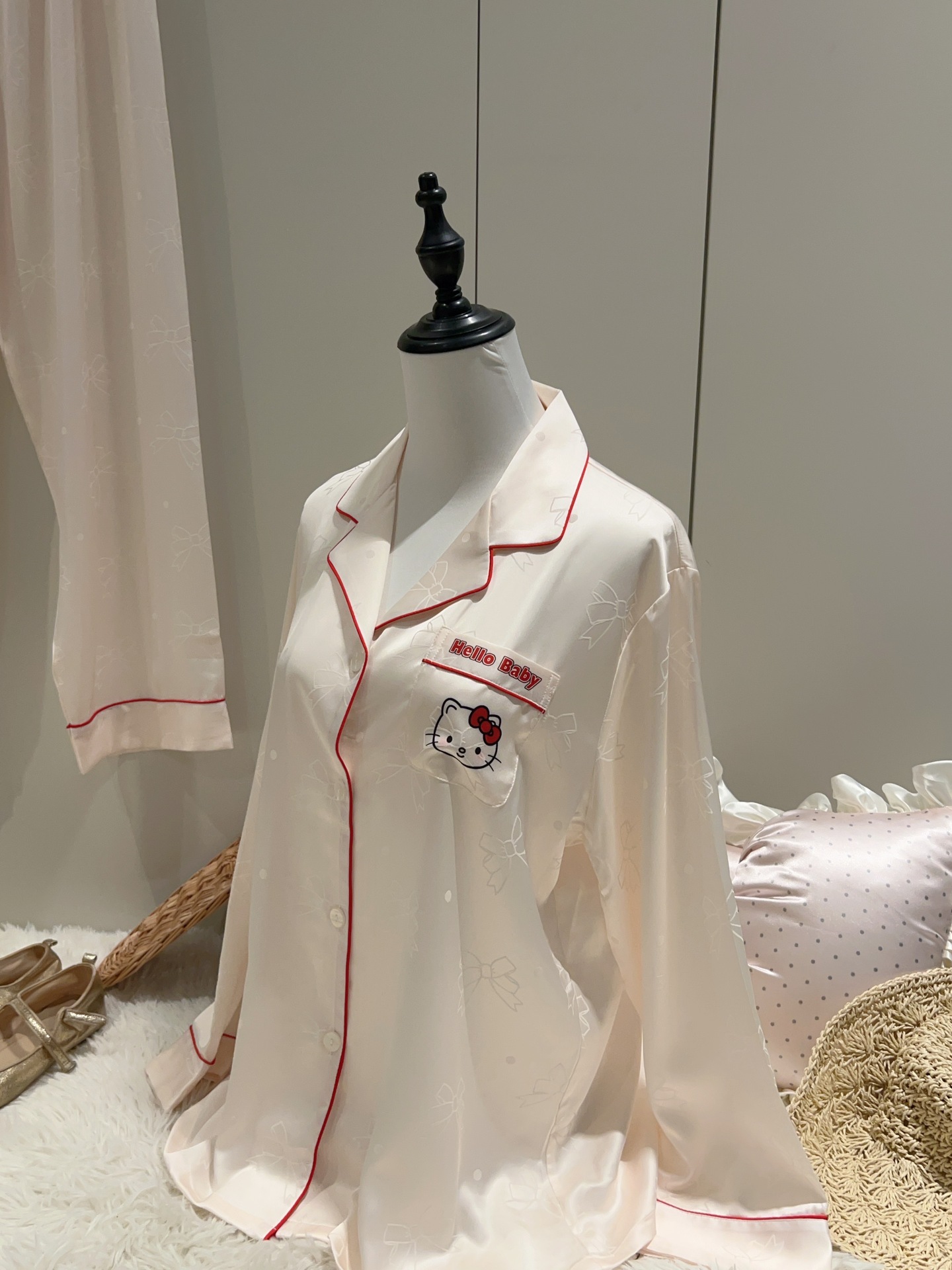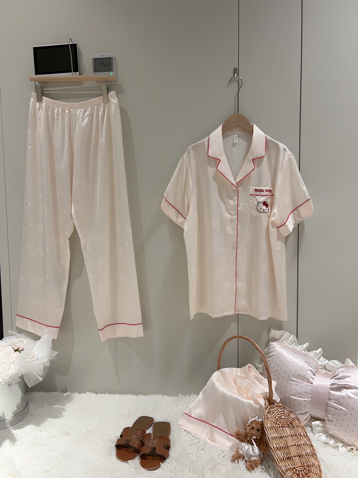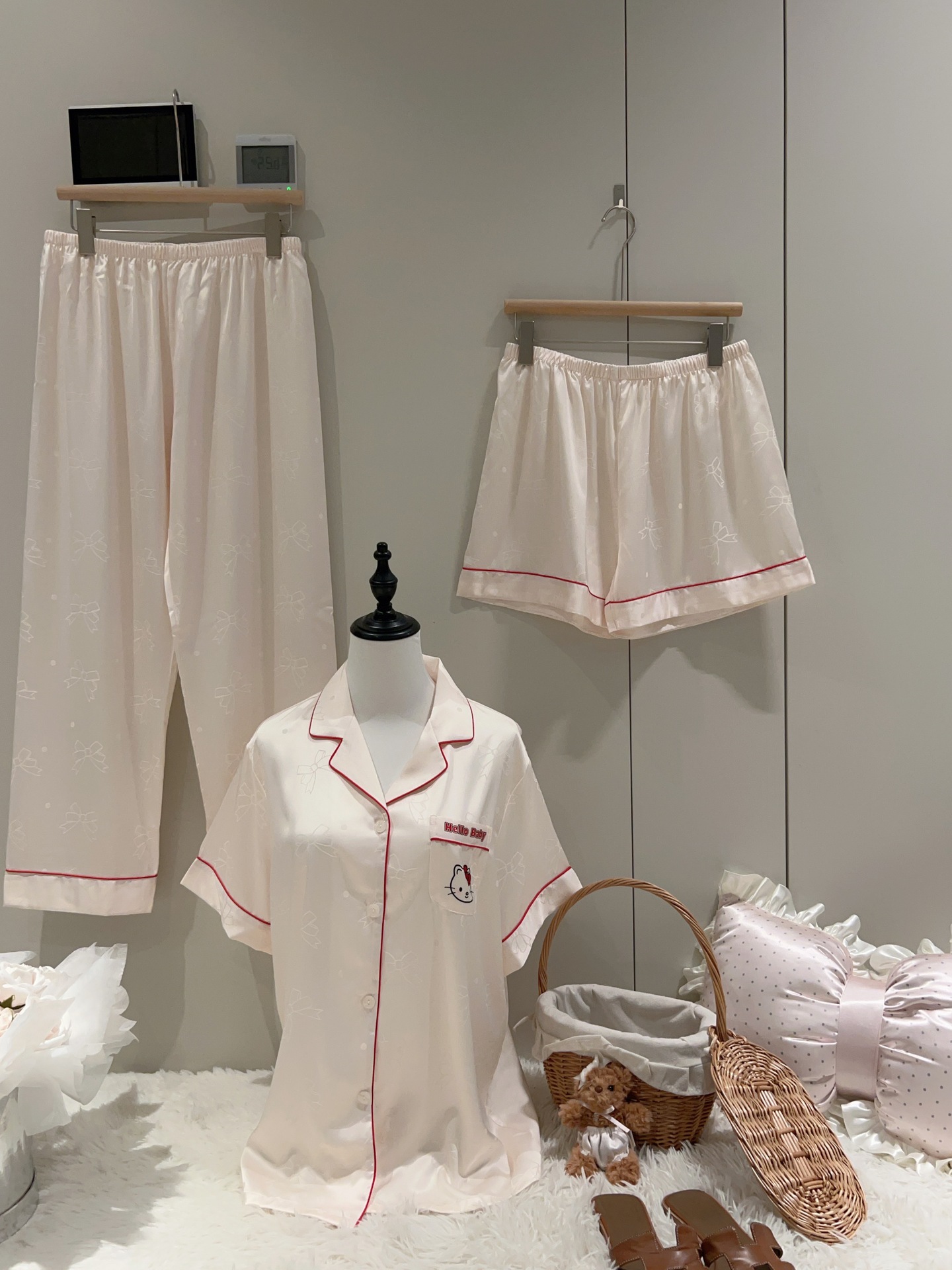 여성용 잠옷 여름 얇은 긴팔 바지 얼음 실크 2025 새로운 기능 스타일 KT 고양이 3 피스 홈웨어 세트스토어 가기