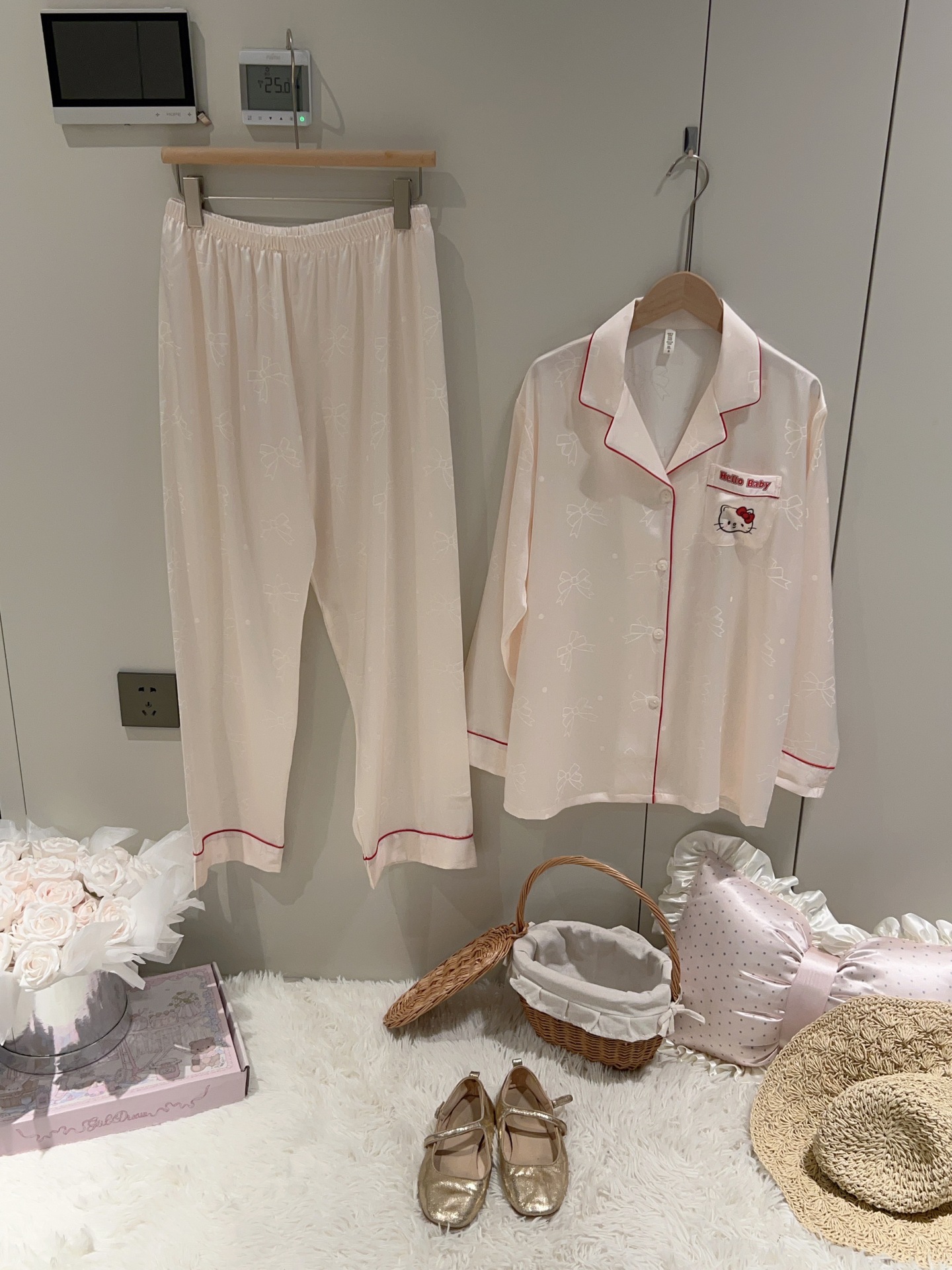 여성용 잠옷 여름 얇은 긴팔 바지 얼음 실크 2025 새로운 기능 스타일 KT 고양이 3 피스 홈웨어 세트