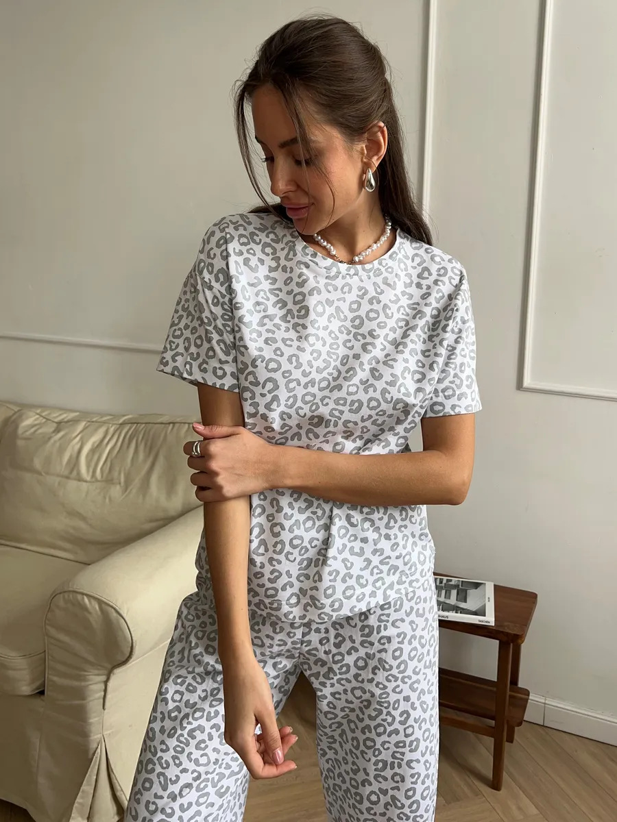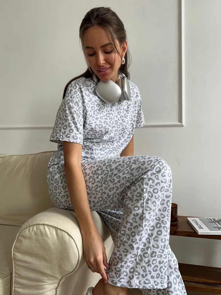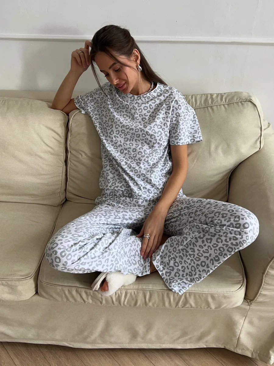 유럽과 미국 스타일의 잠옷 여름 2025 새로운 국경 간 대외 무역 인기 표범 인쇄 소녀 간단한 캐주얼 정장 바지스토어 가기